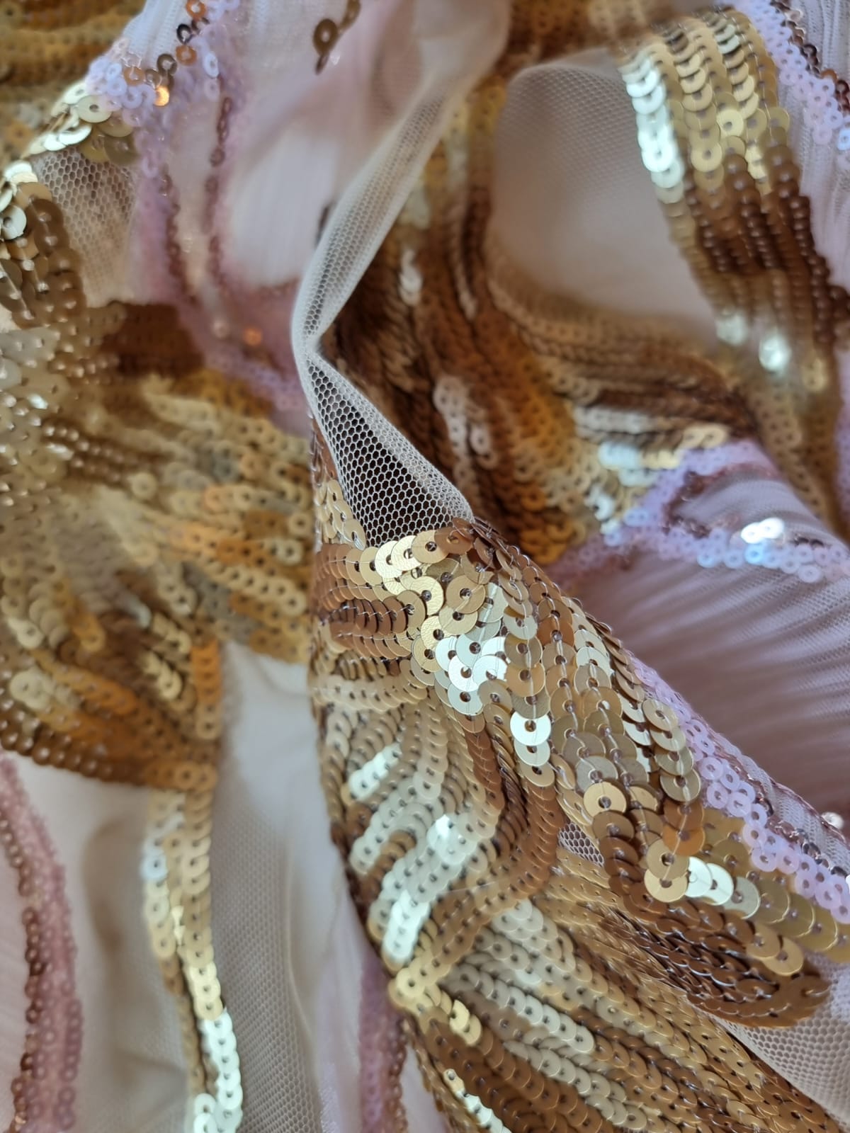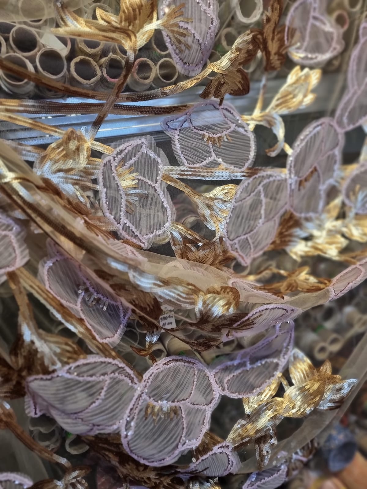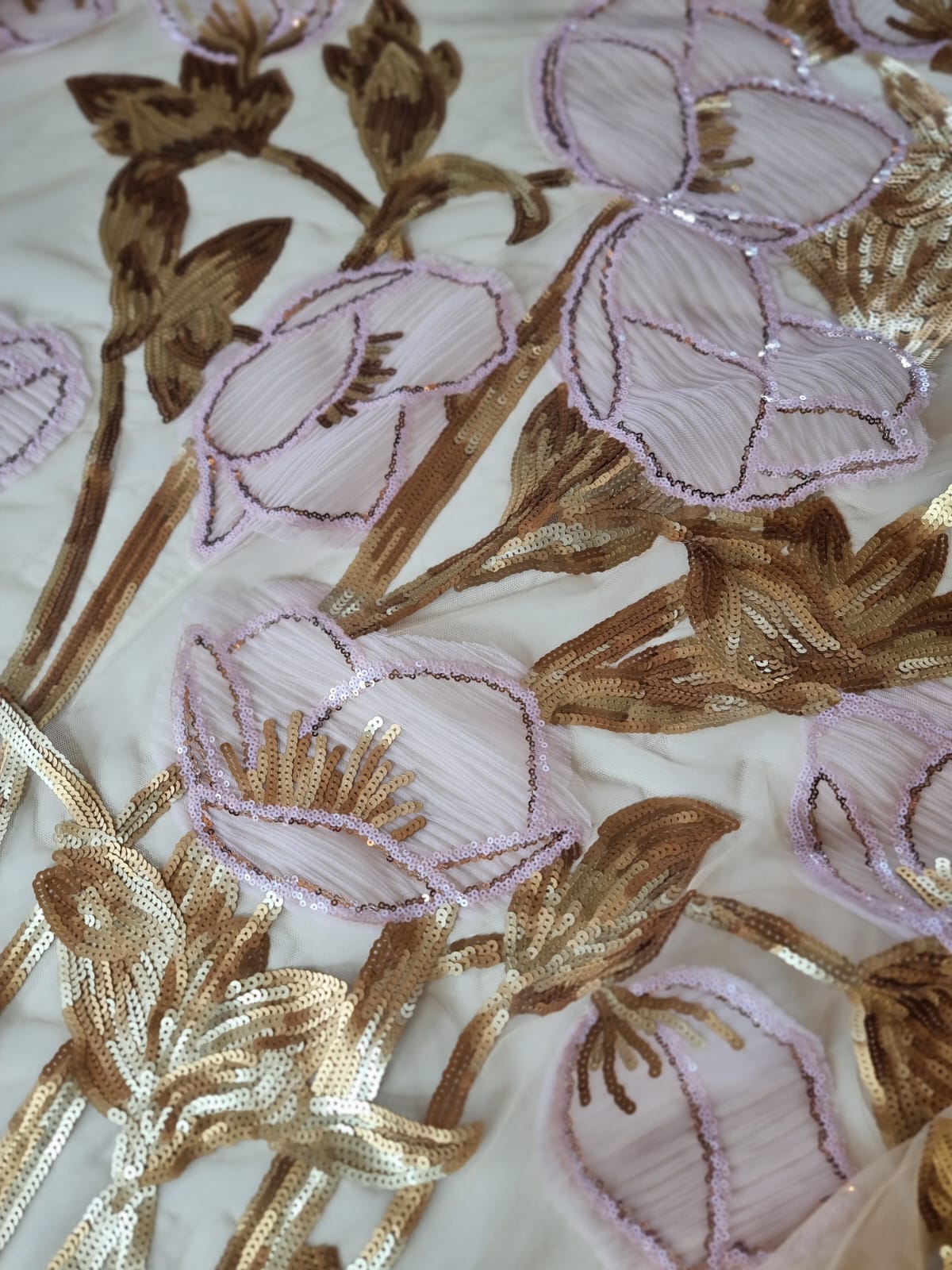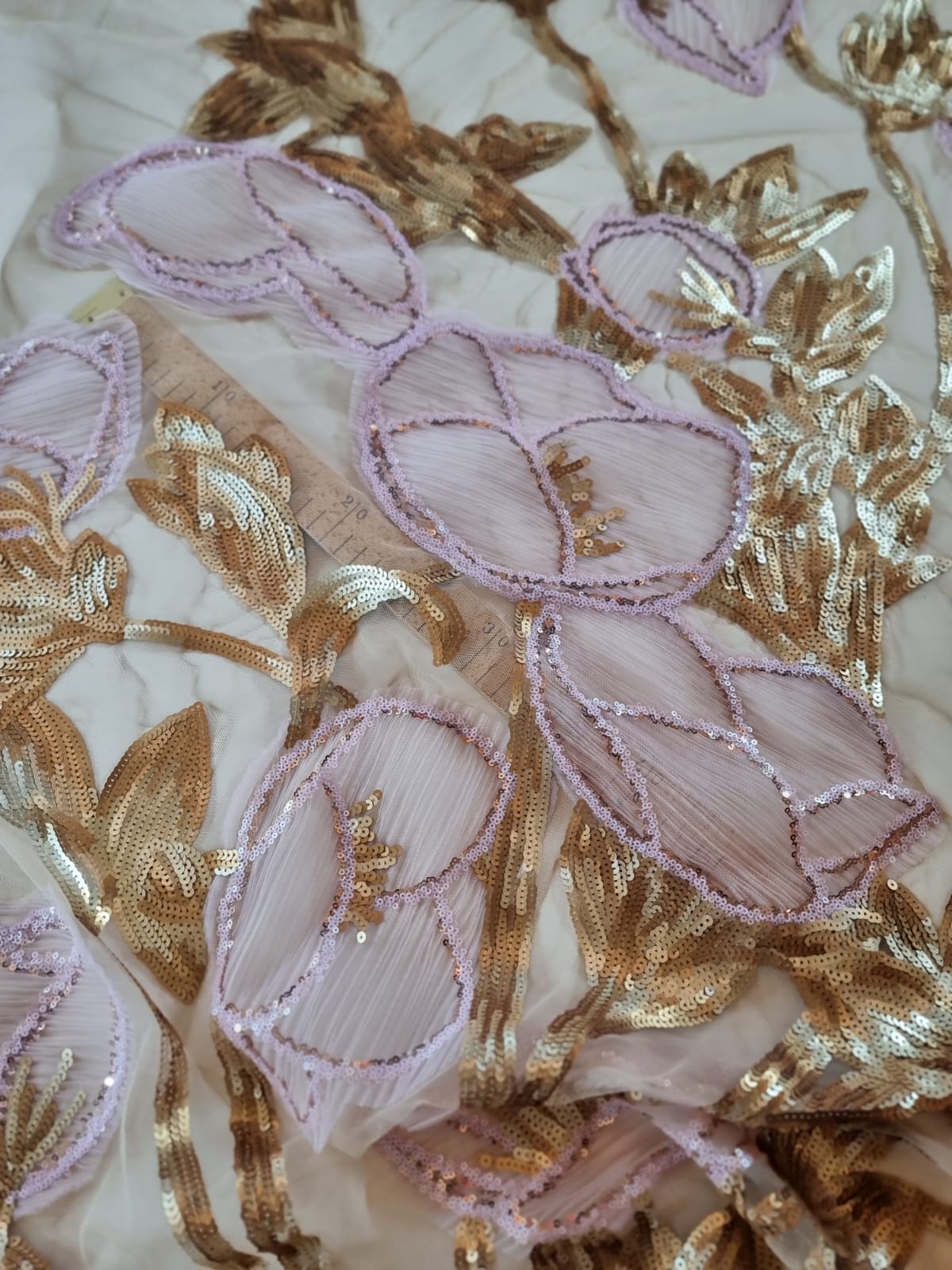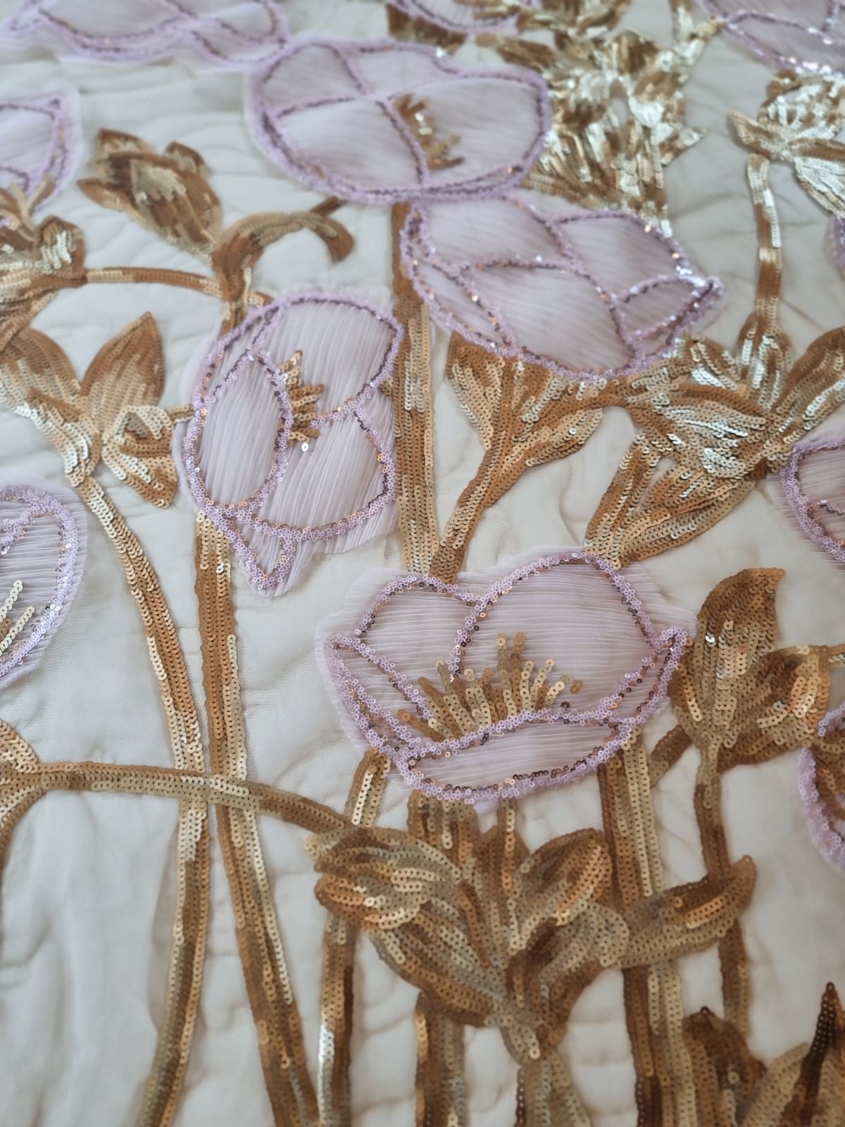 Tesatura premium cu broderie și paiete – design floral , crenguțe aurii cu flori lila pe suport de tulle nude