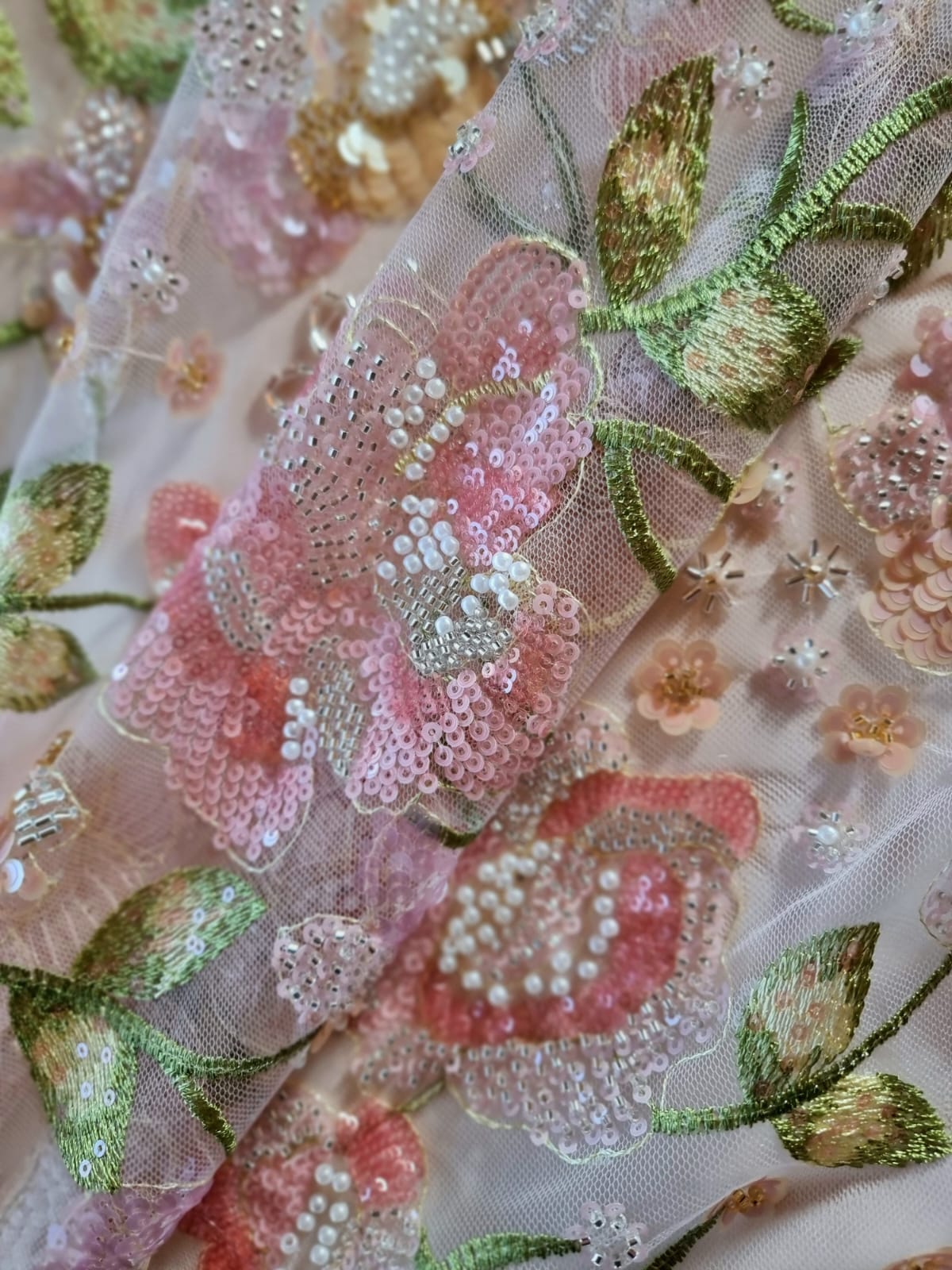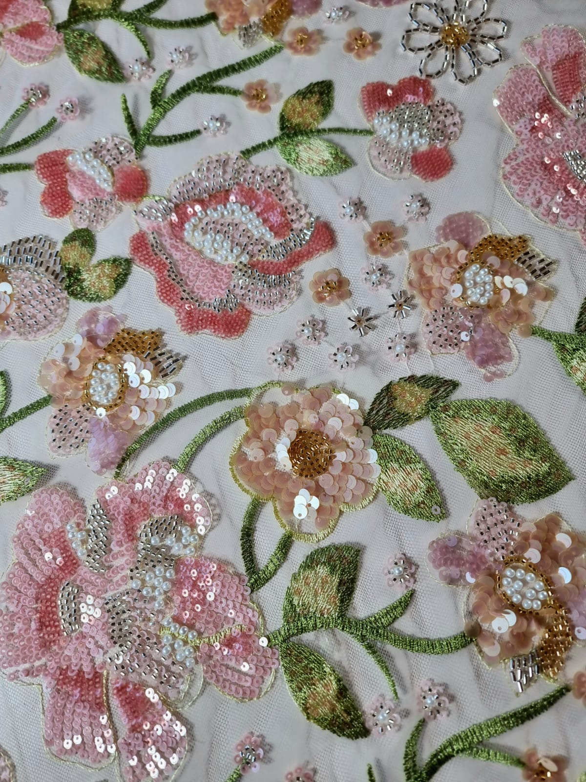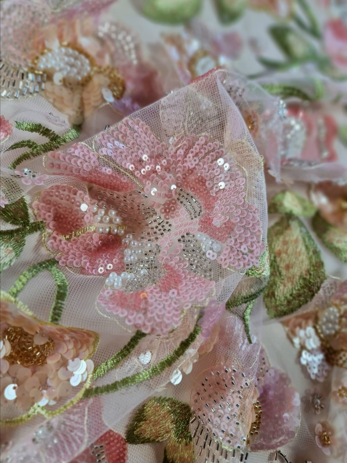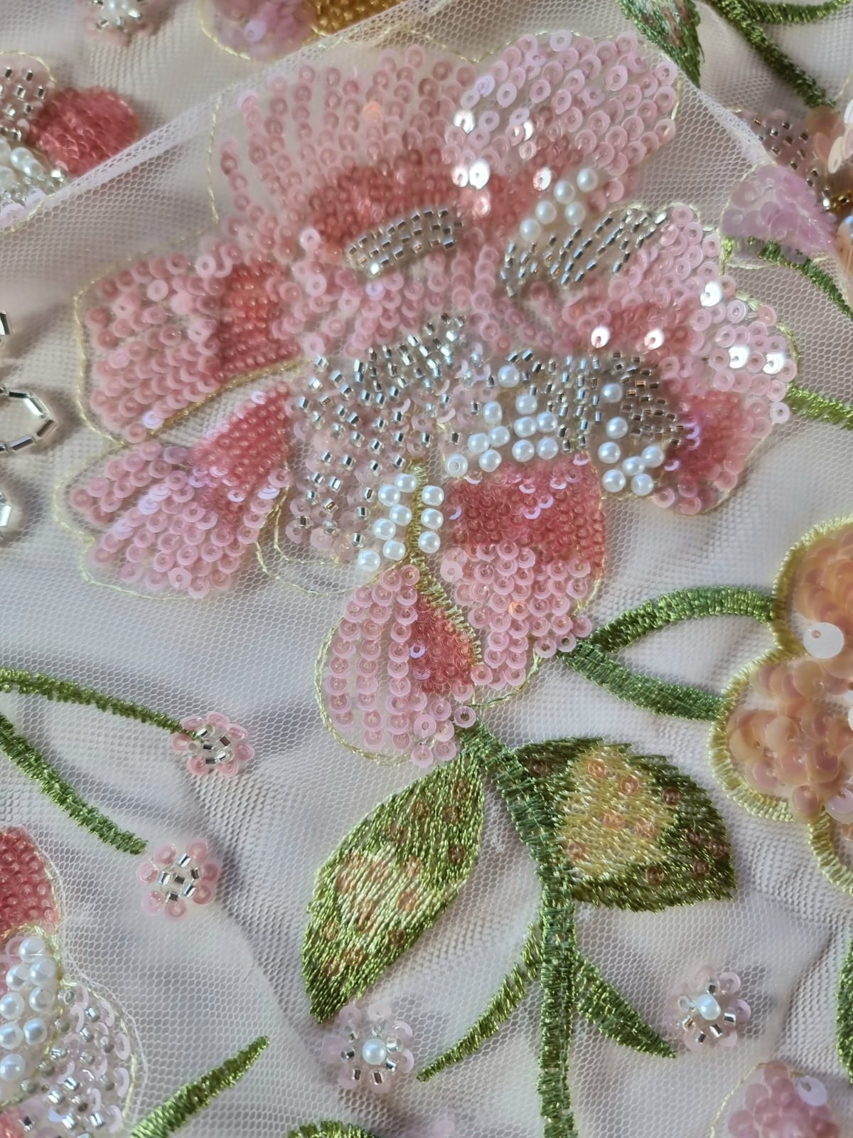 Dantela cu broderie pe tulle fin cu aplicații de paiete și margele – model floral Pastel