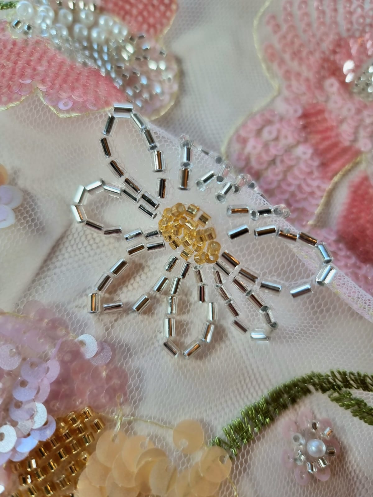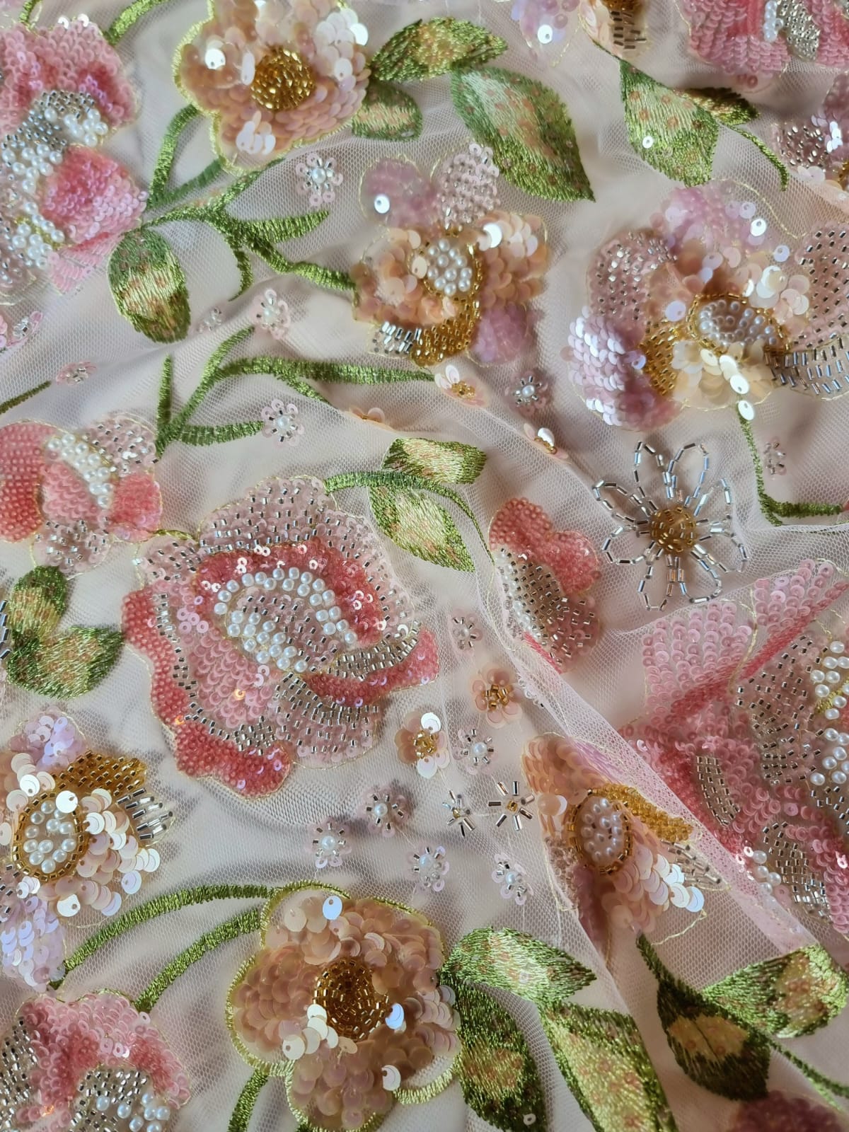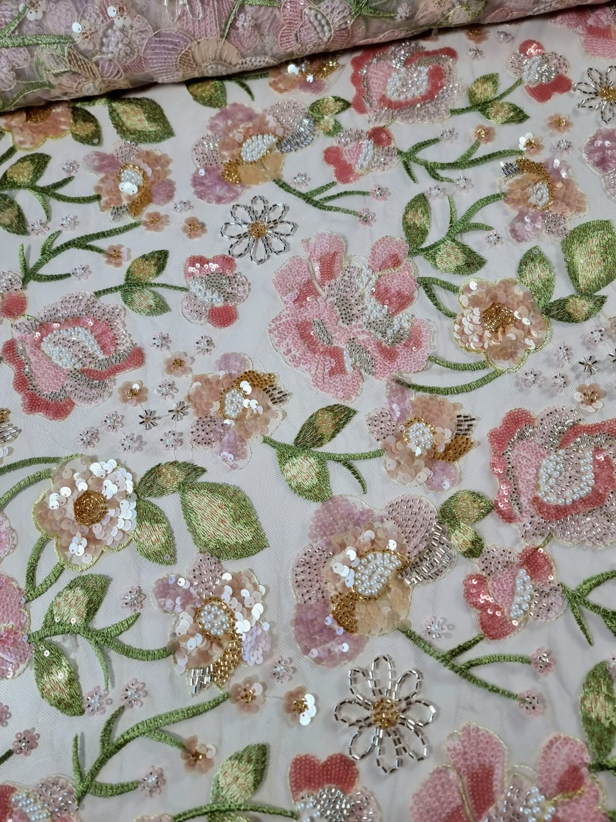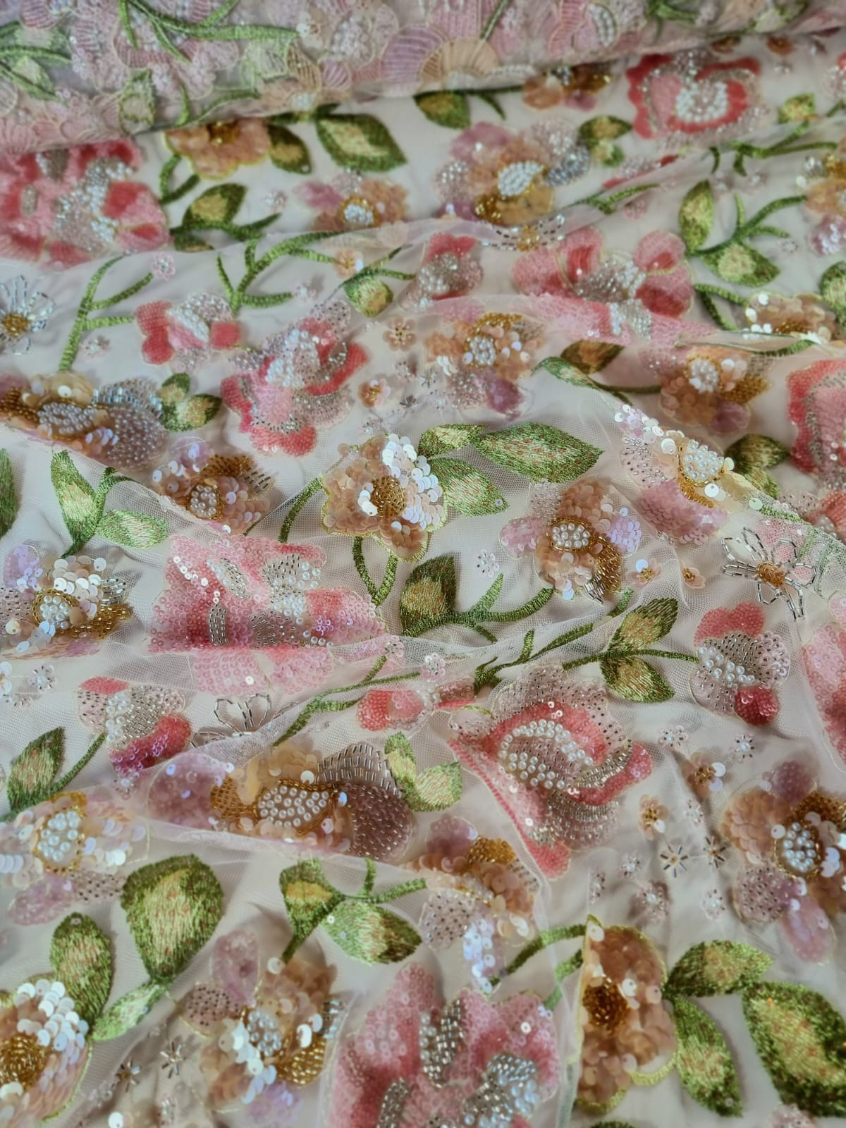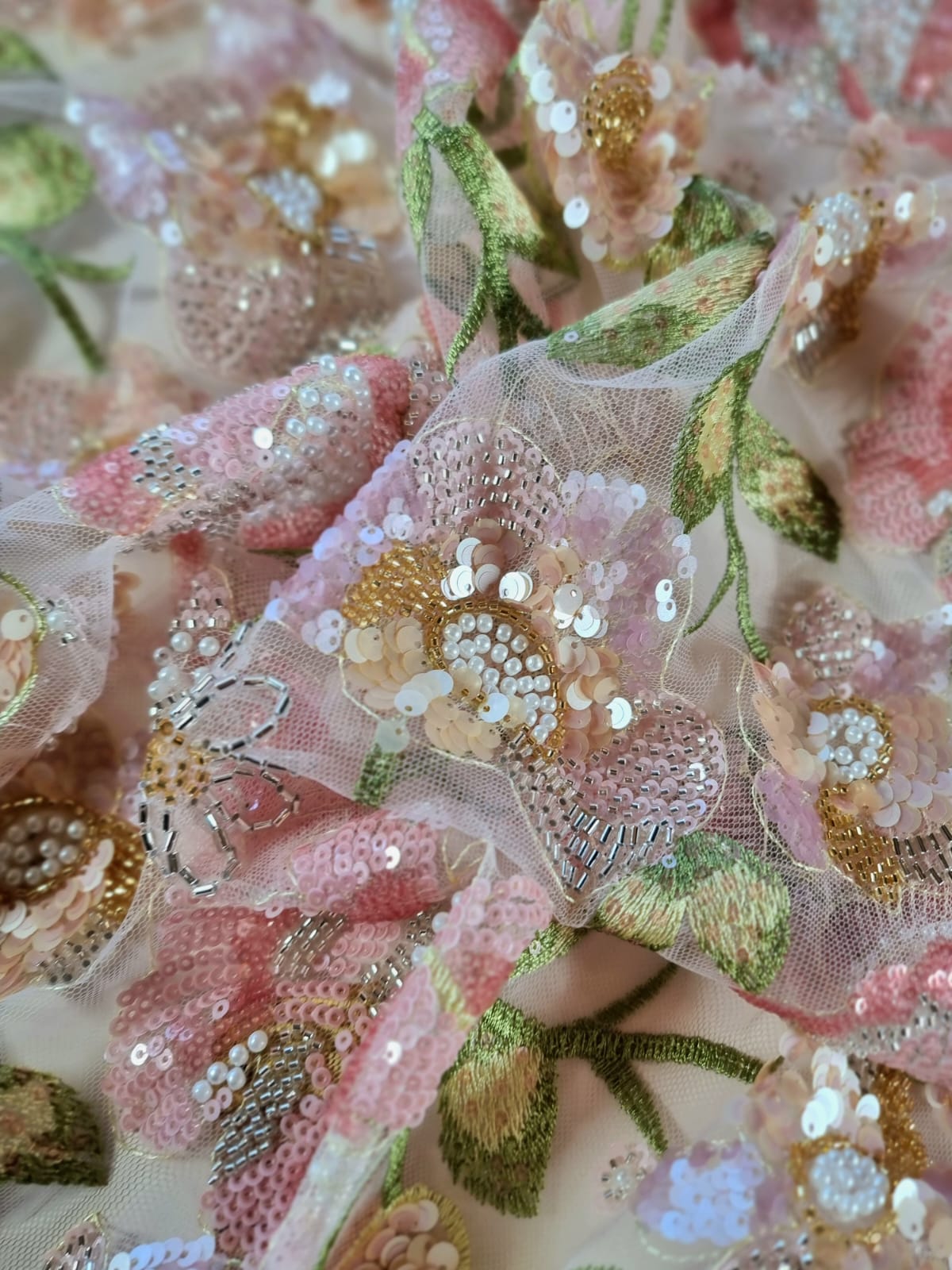 Dantela cu broderie pe tulle fin cu aplicații de paiete și margele – model floral Pastel