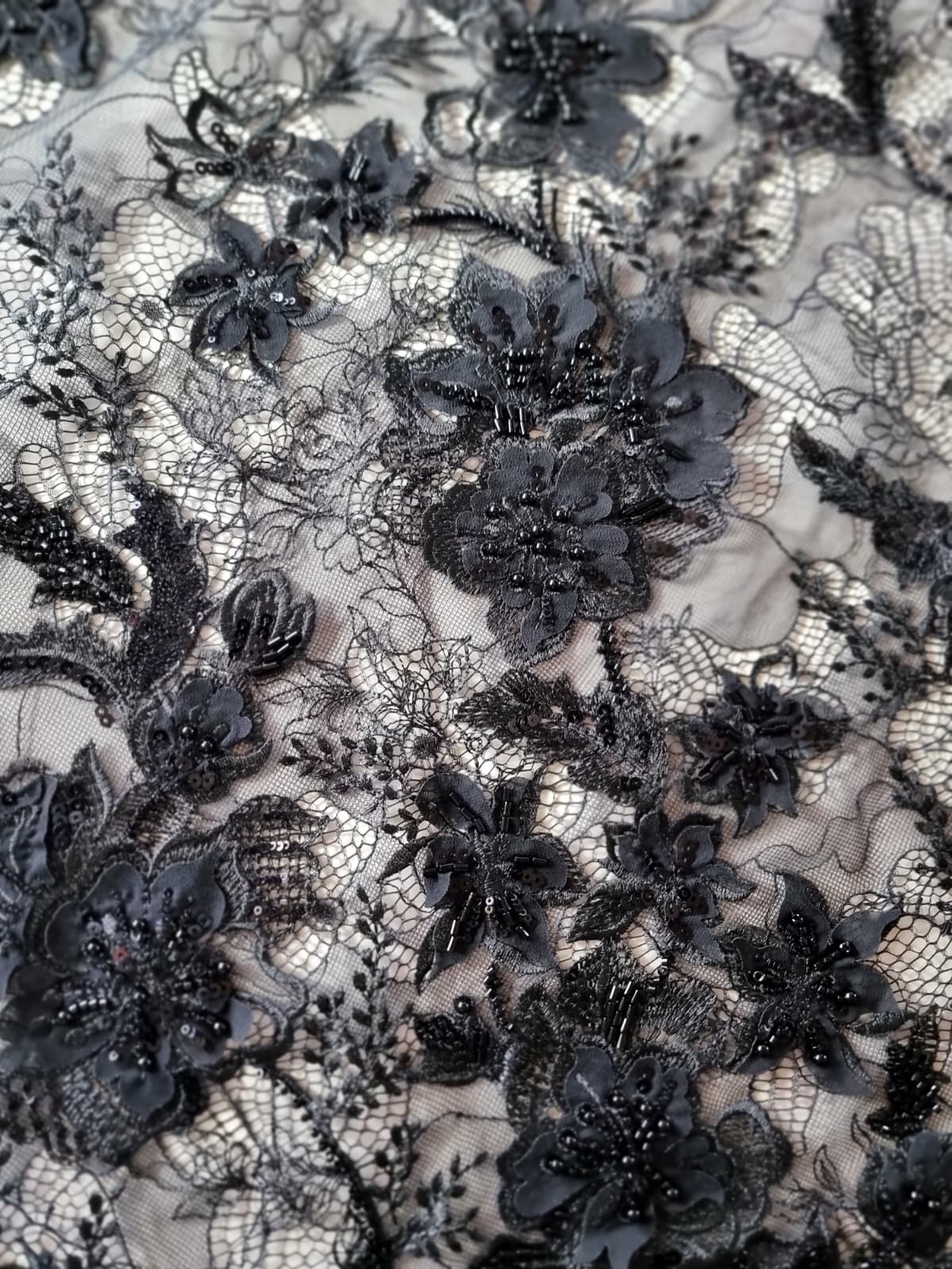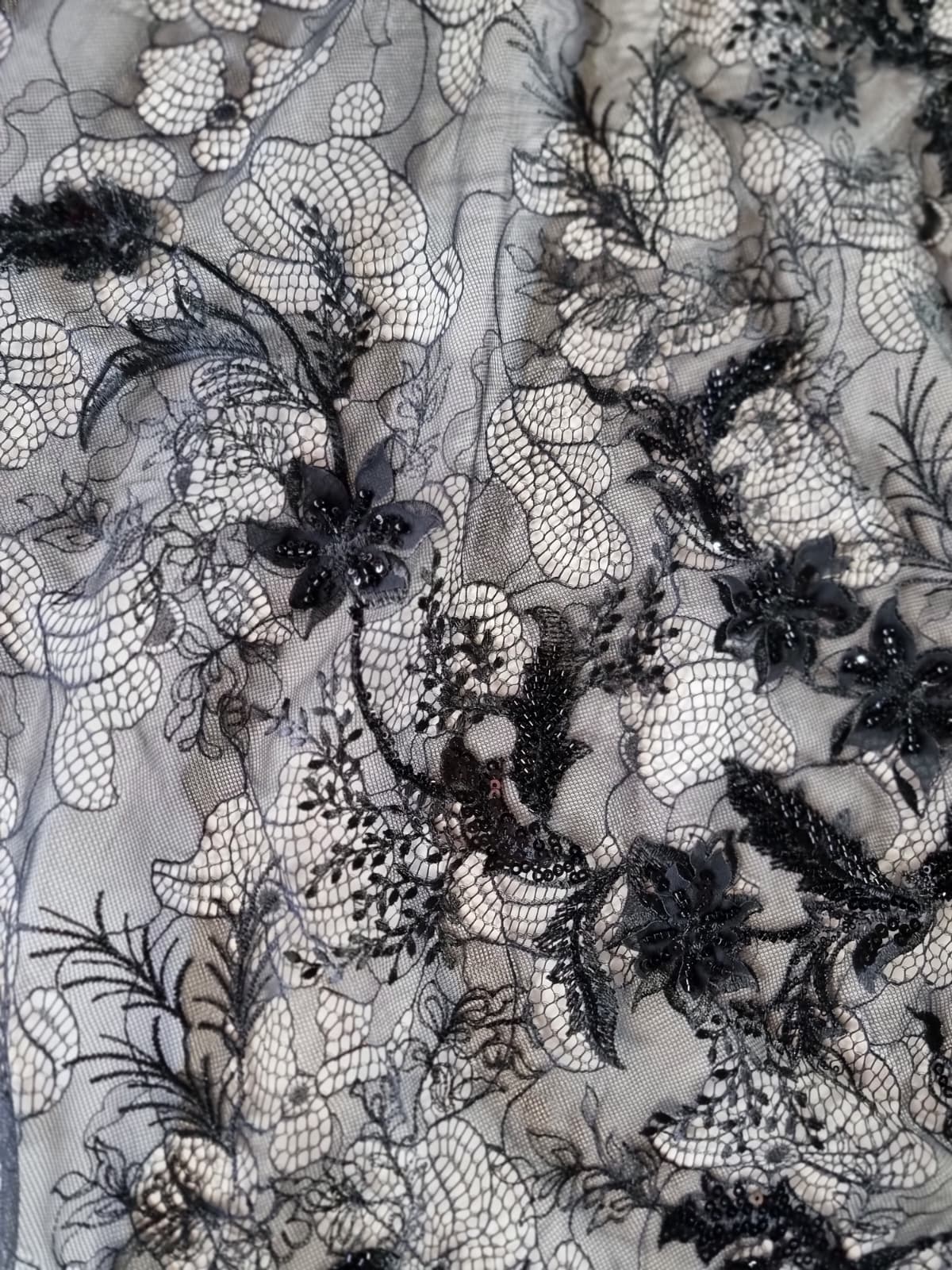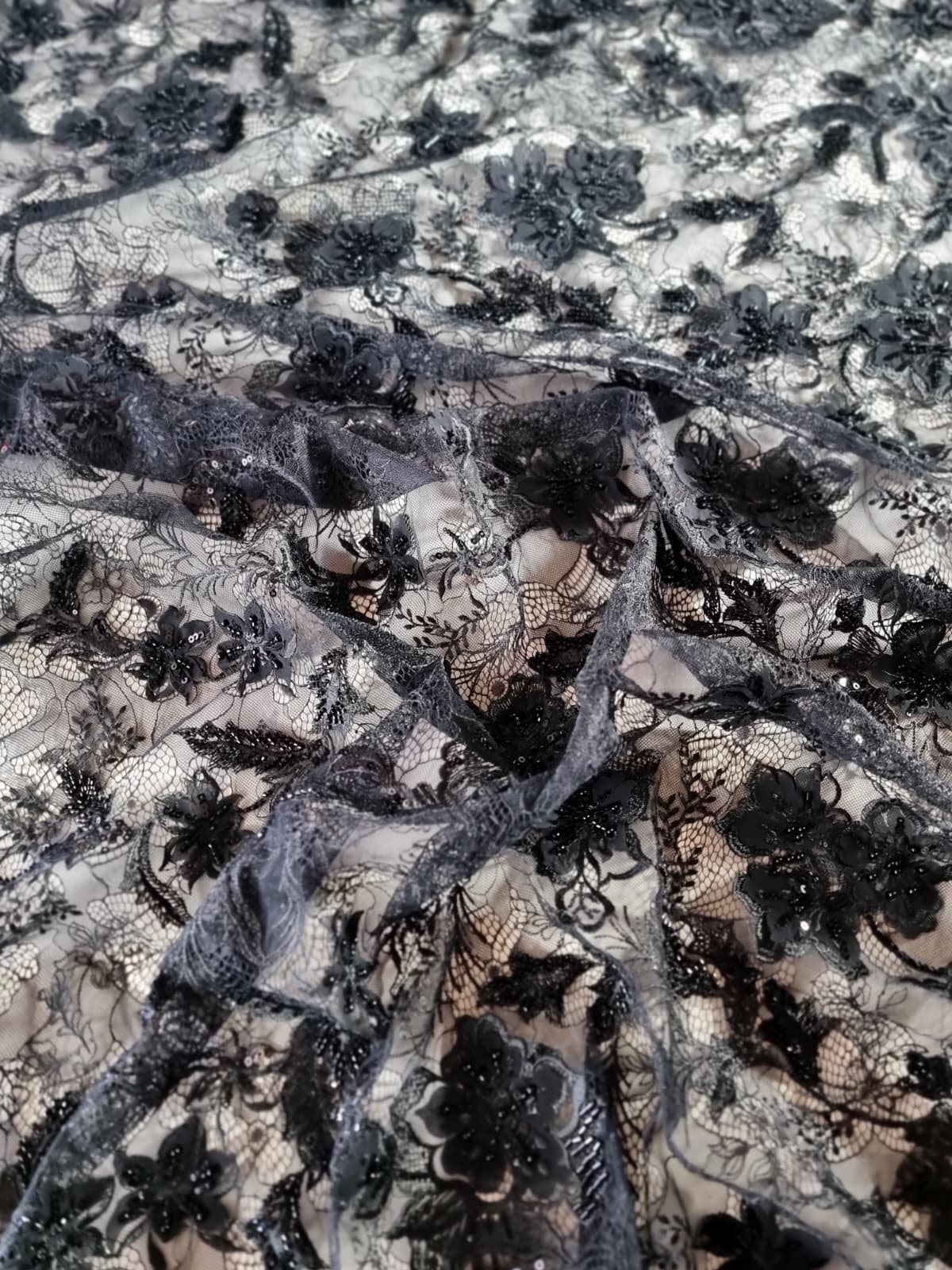 Dantela premium cu aplicații delicate – design floral cu mărgele, Negru