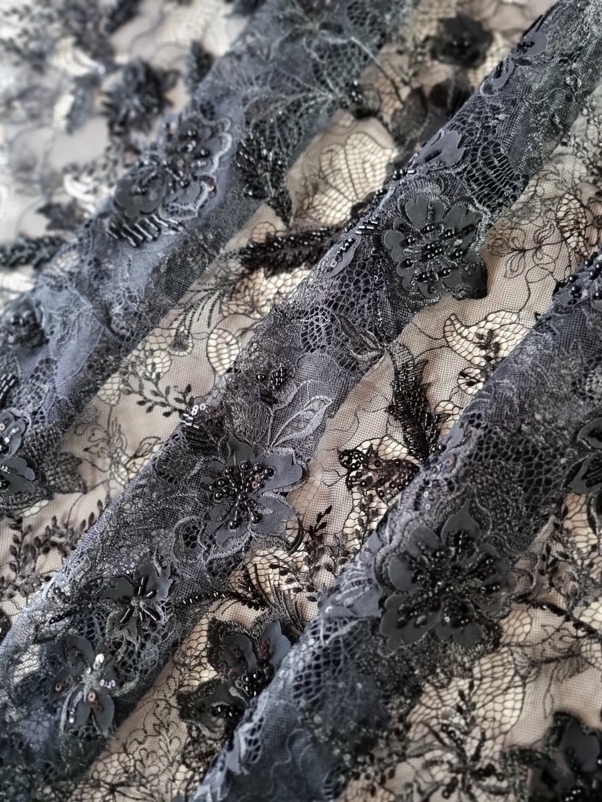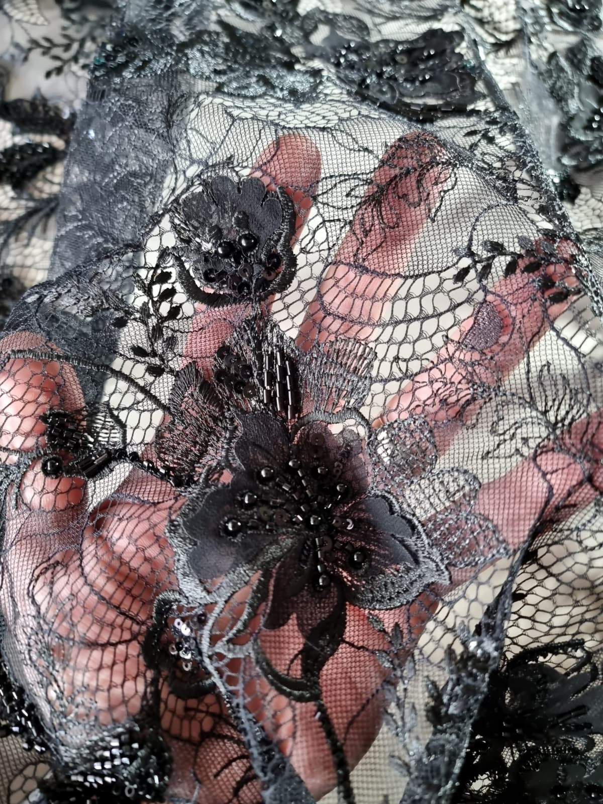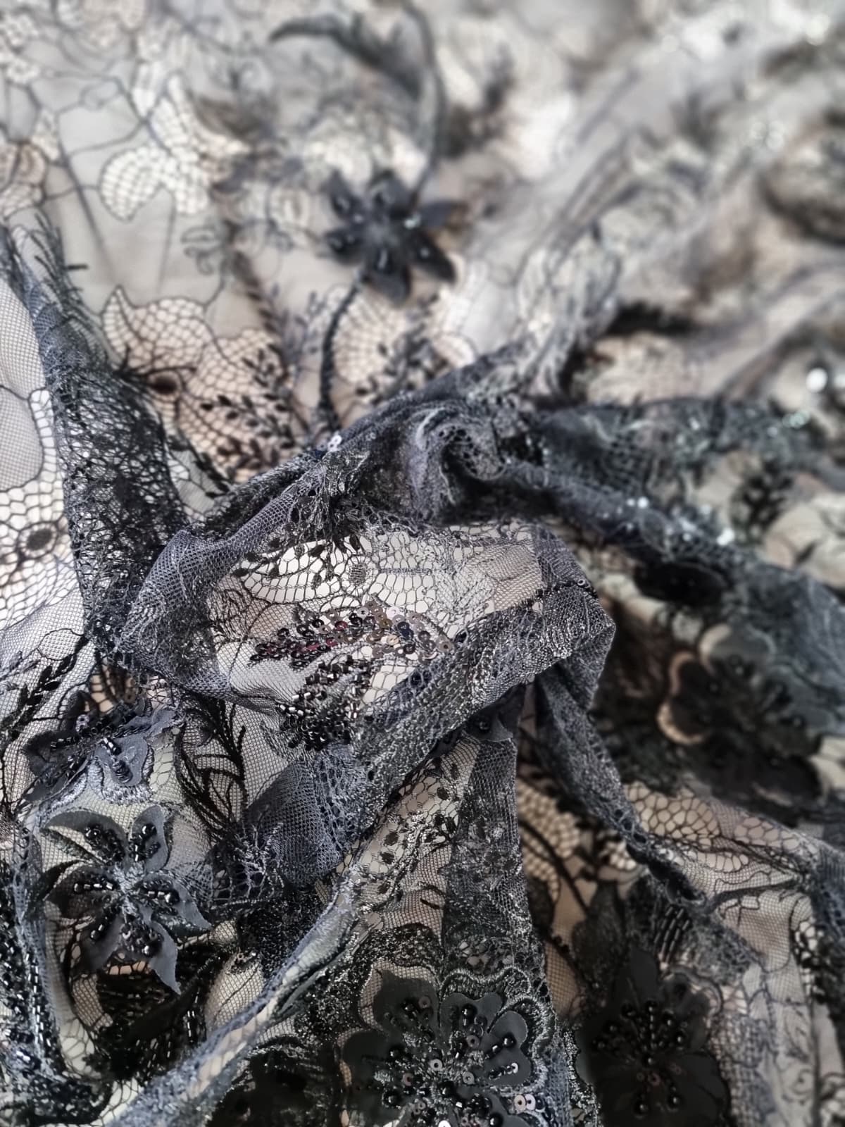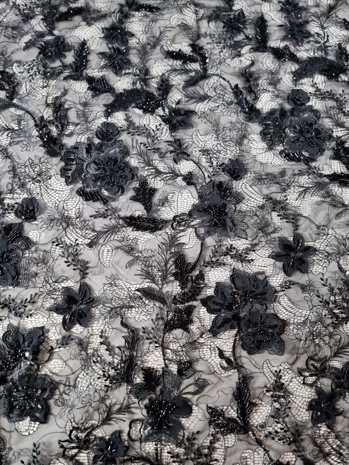 Dantela premium cu aplicații delicate – design floral cu mărgele, Negru