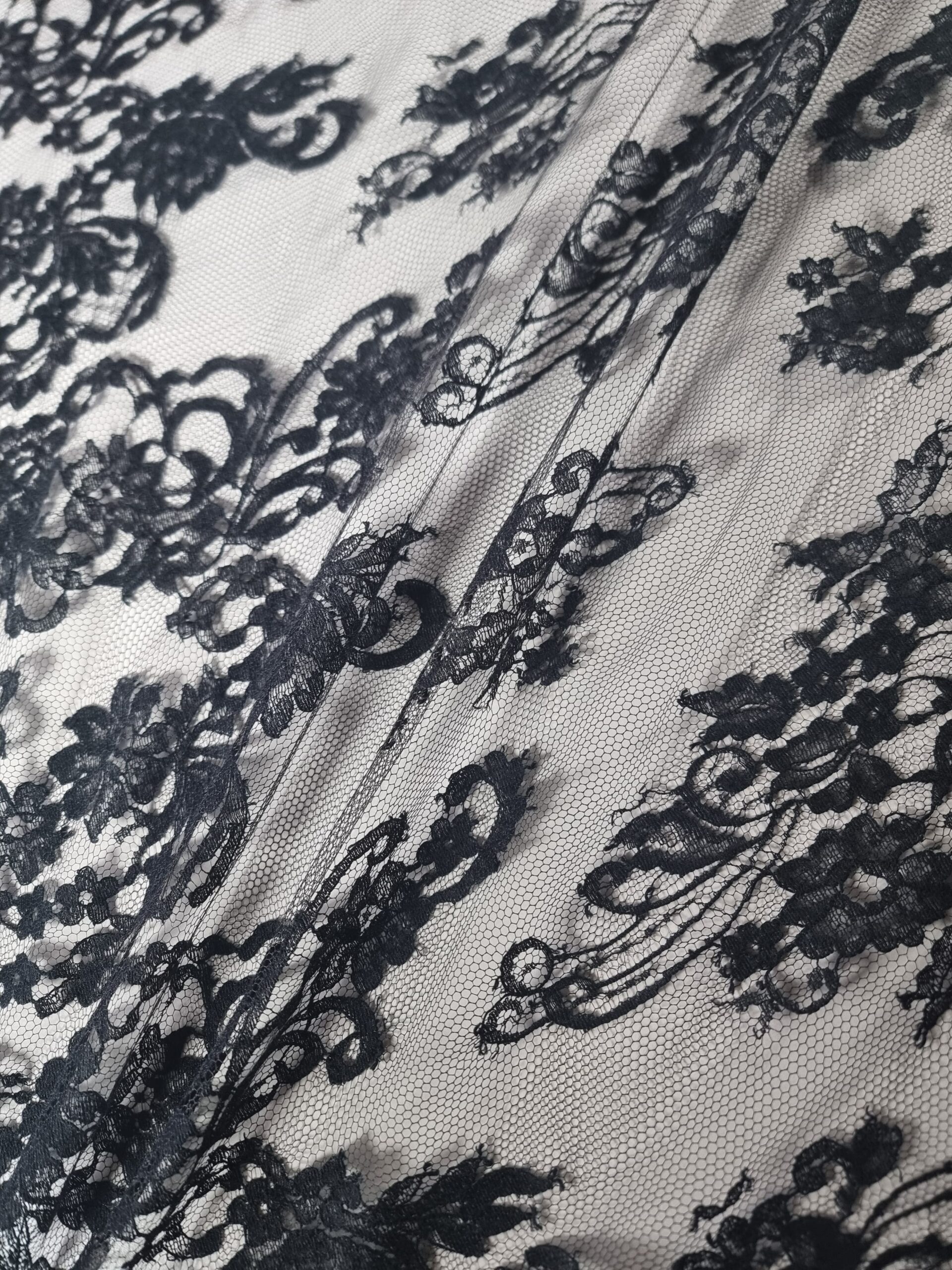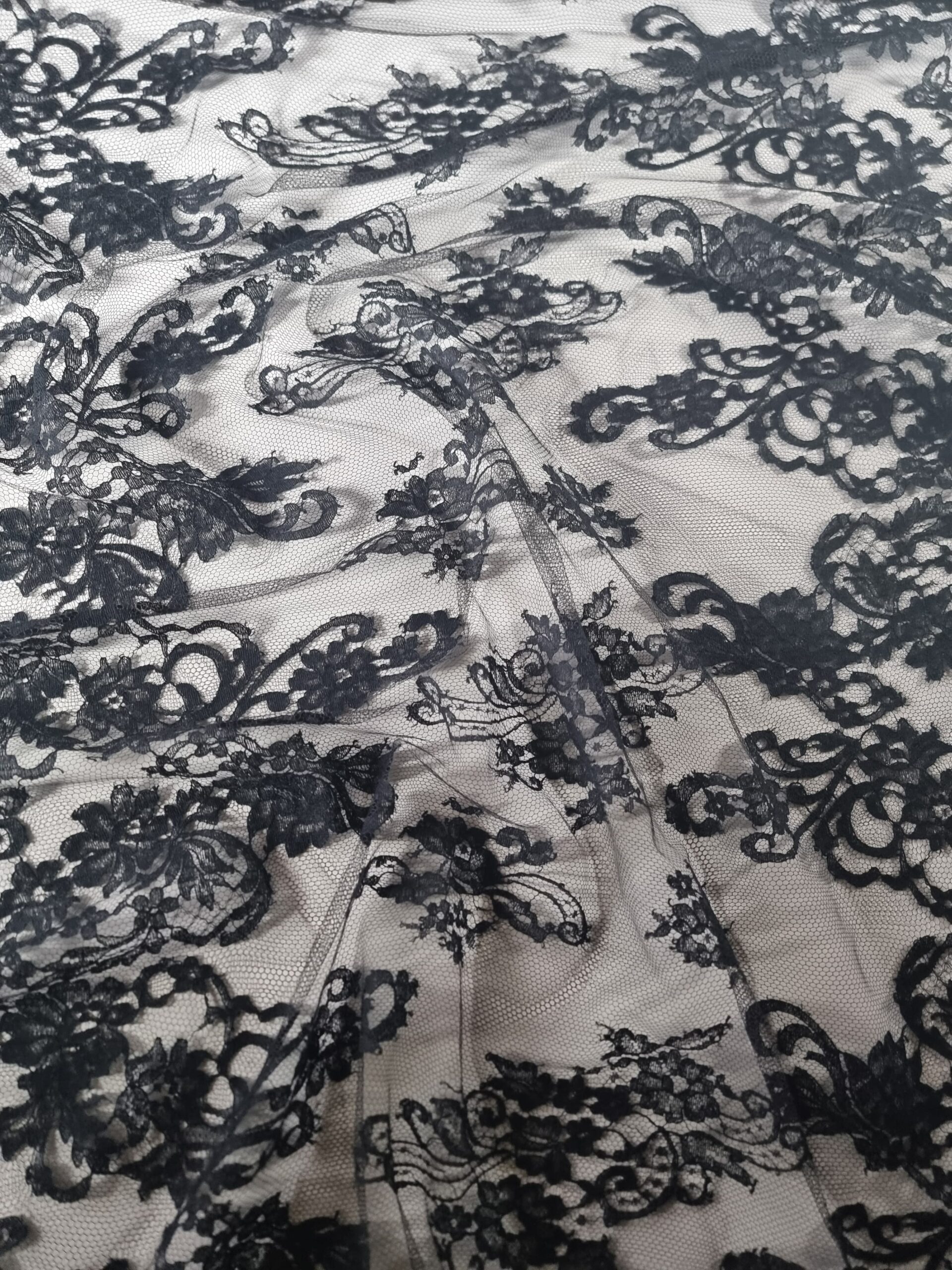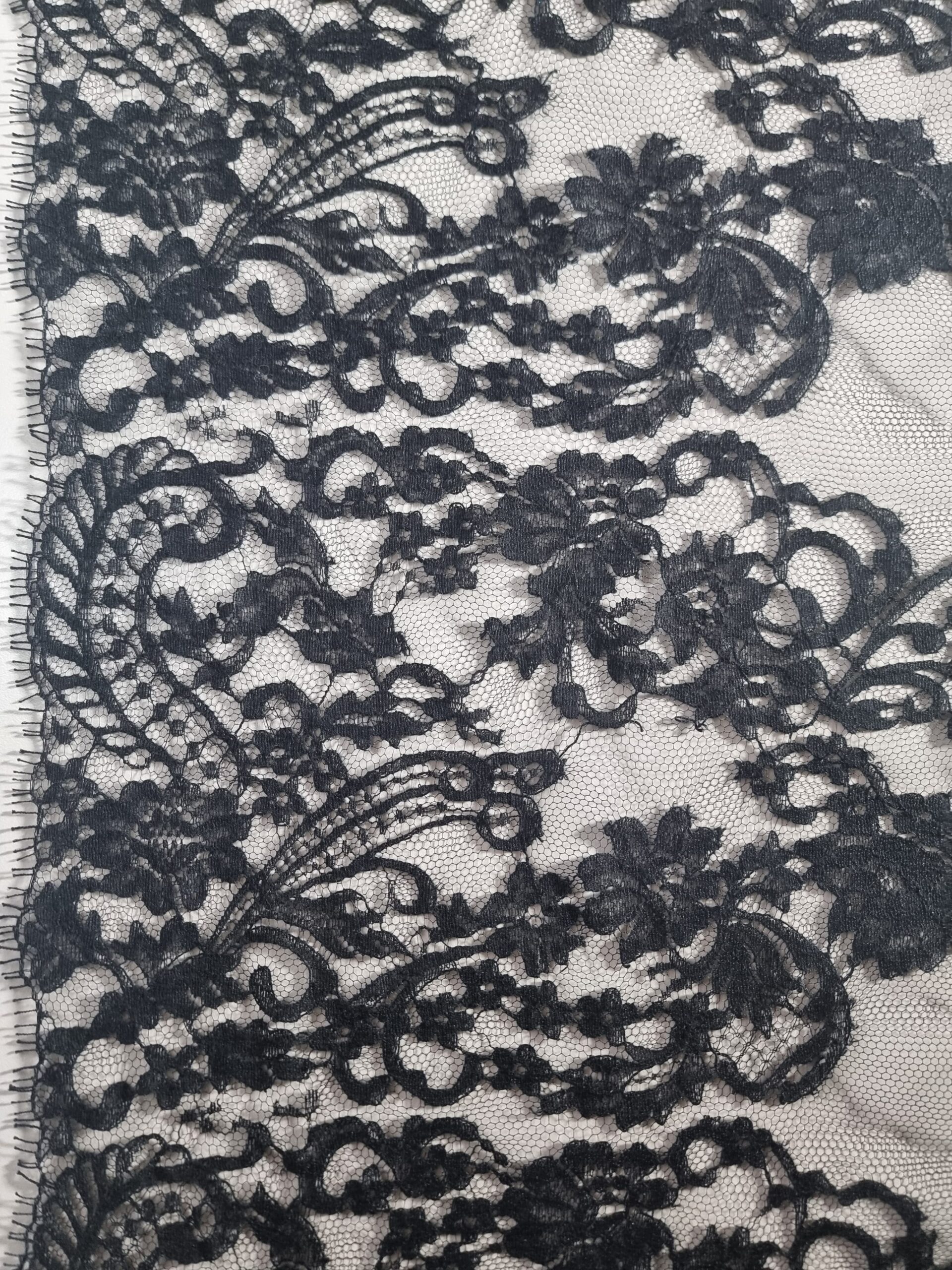 Dantela premium din fibre naturale cu design floral si borduri laterale, Negru