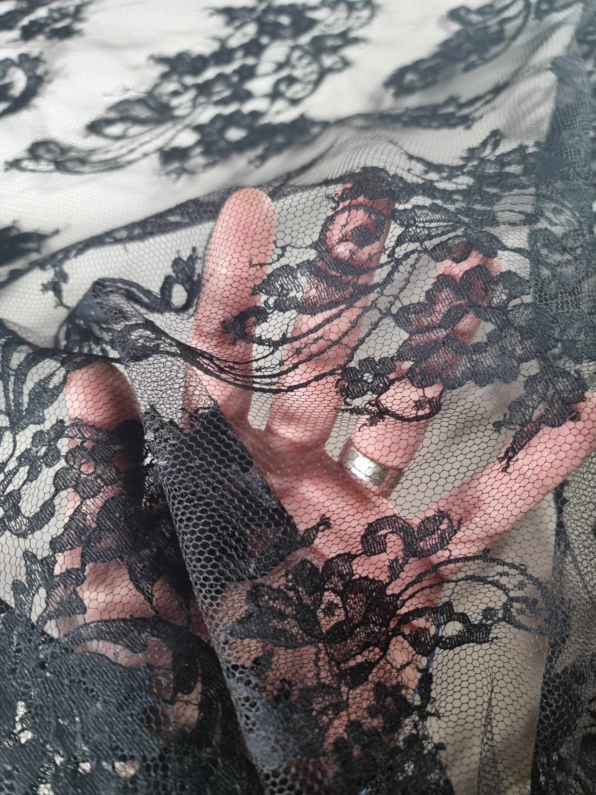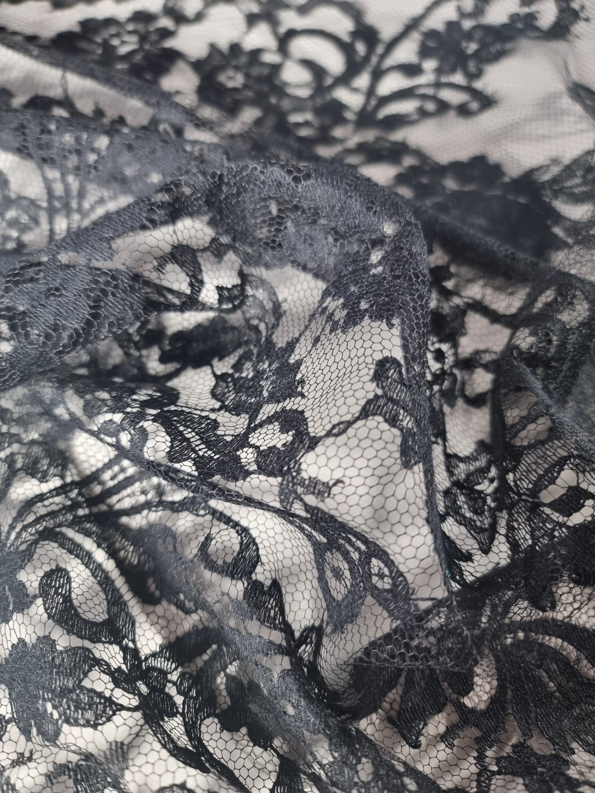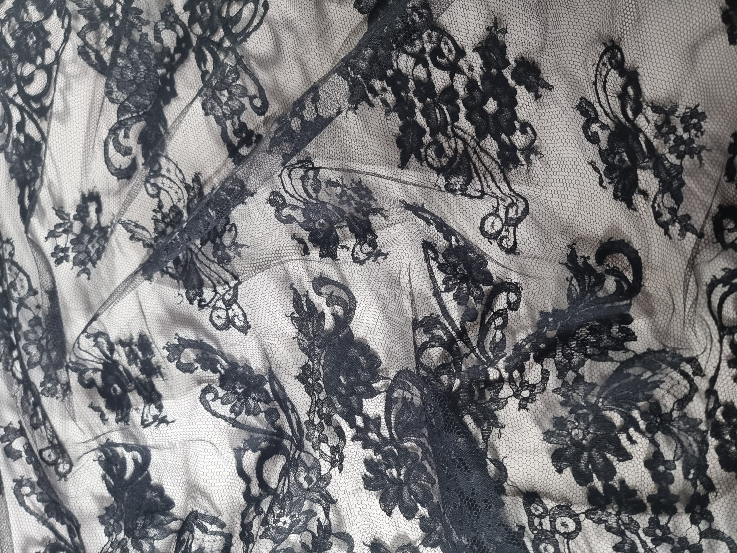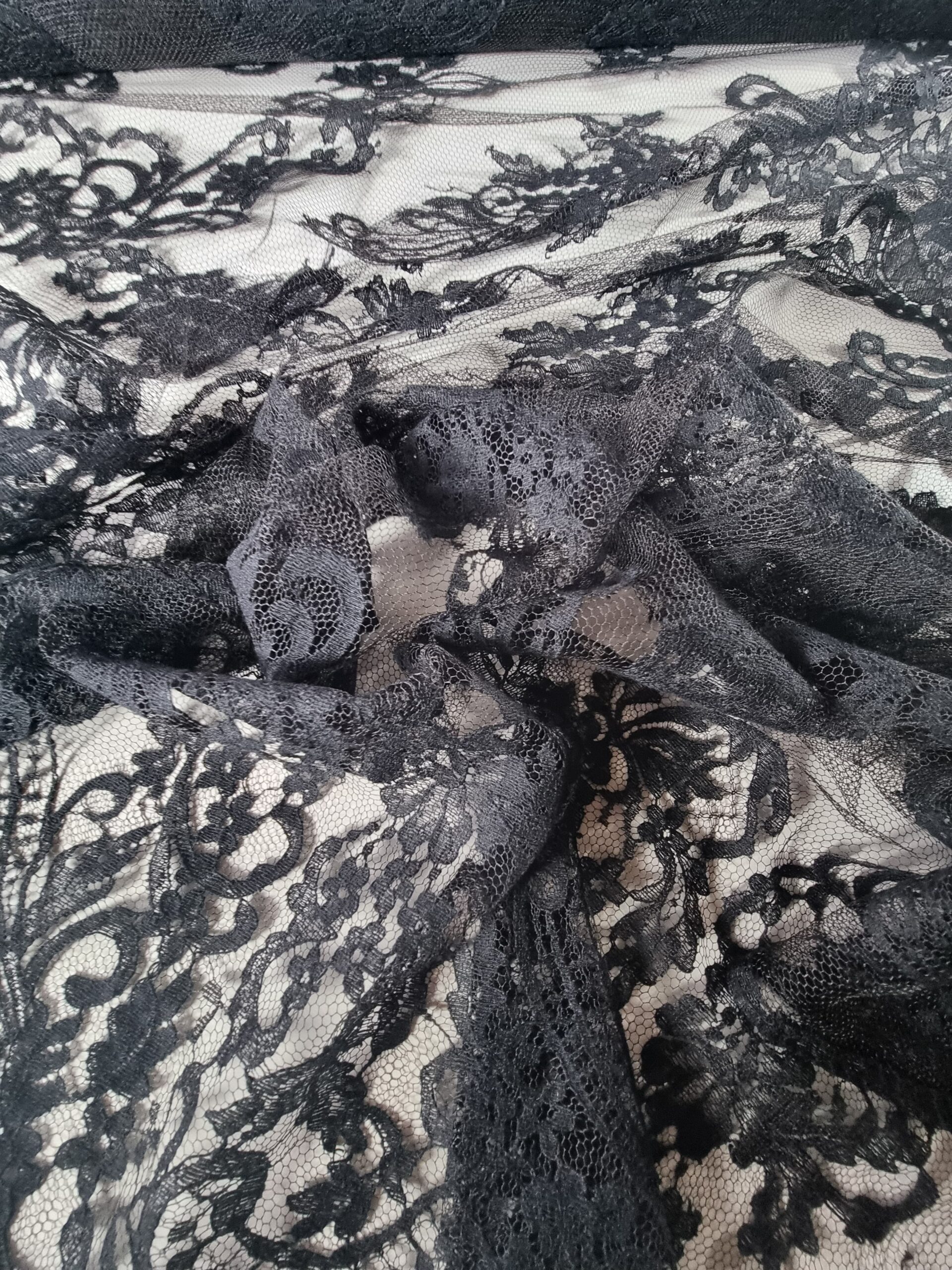 Dantela premium din fibre naturale cu design floral si borduri laterale, Negru