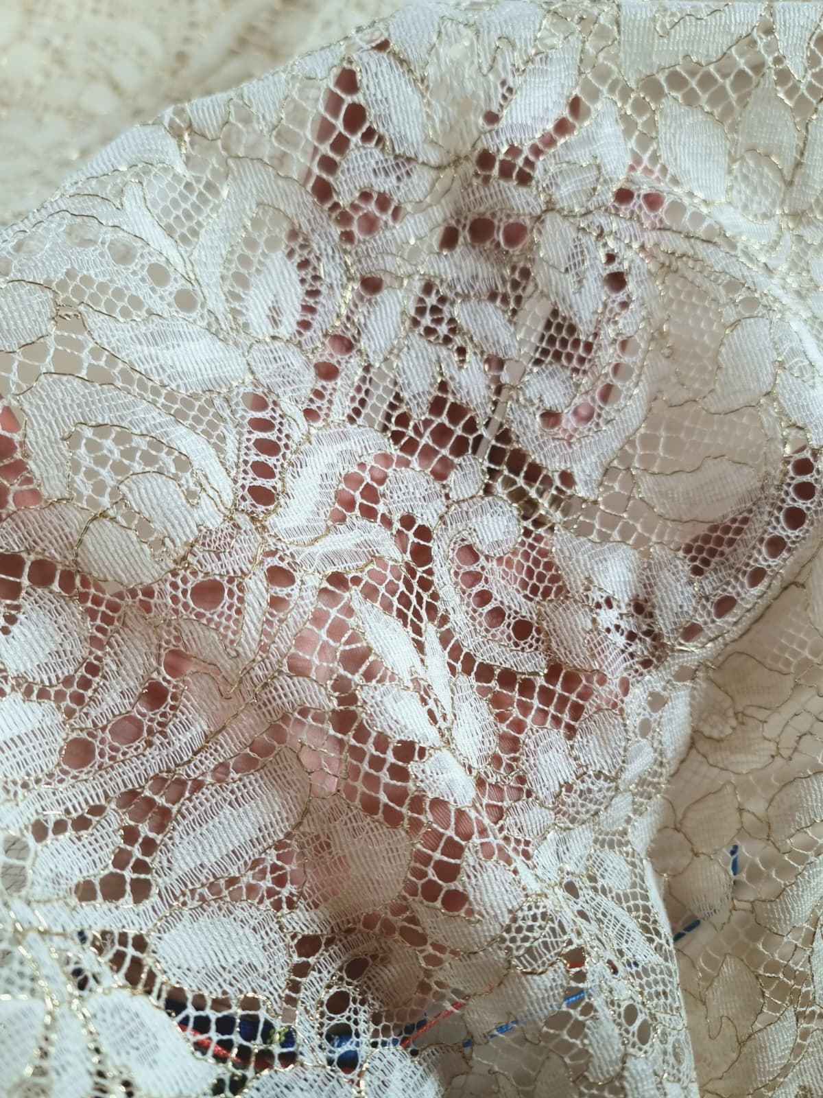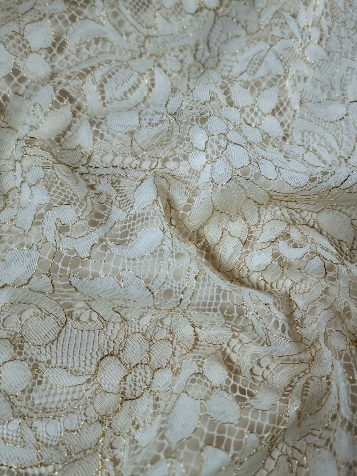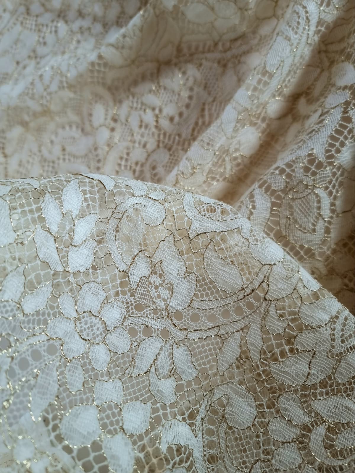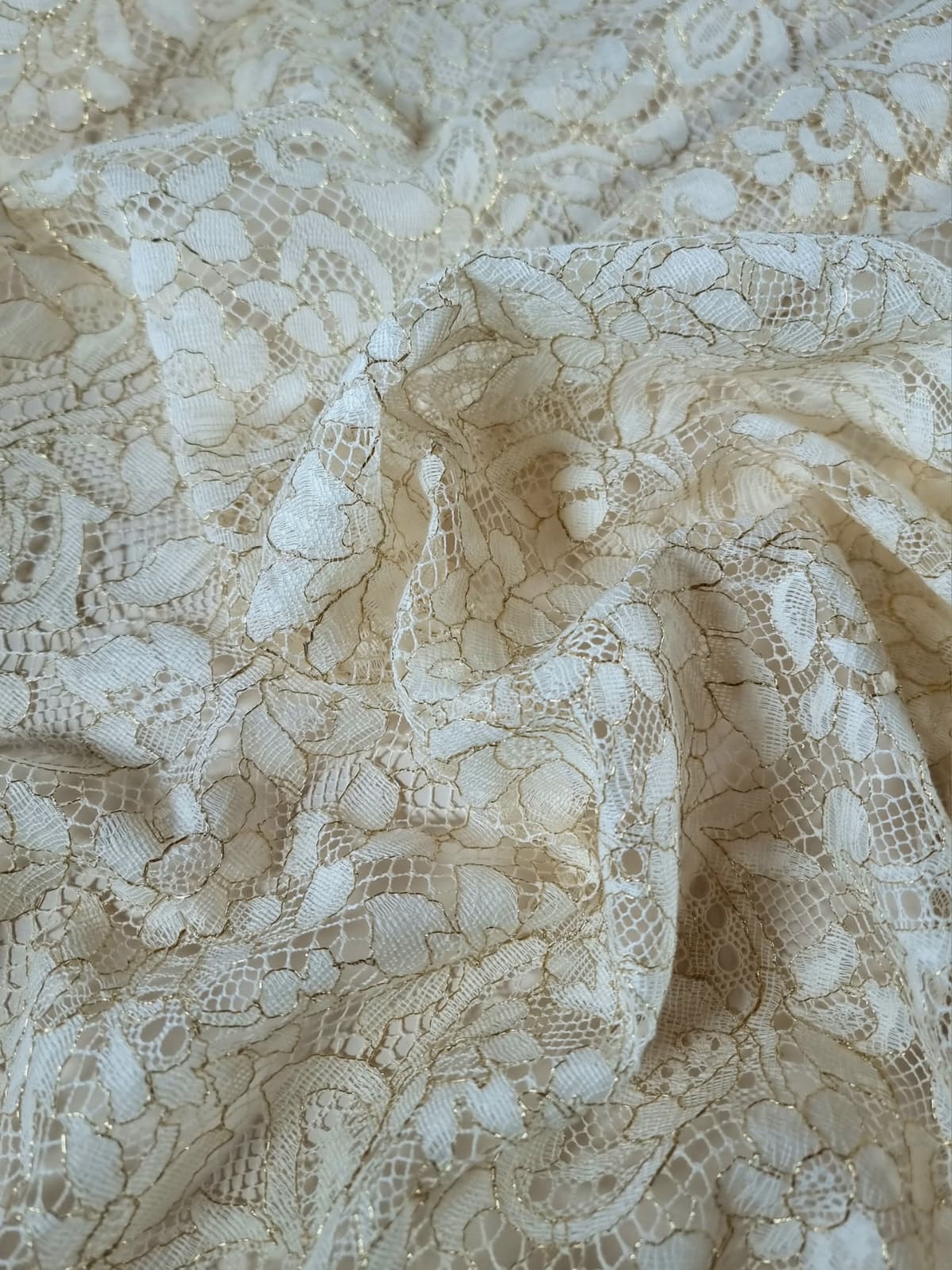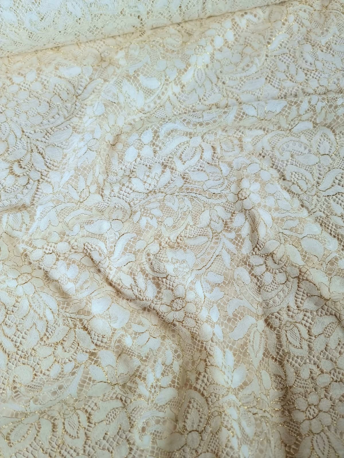 Dantela premium din fibre naturale – model floral, Ivoire cu inserție delicată de fir Auriu