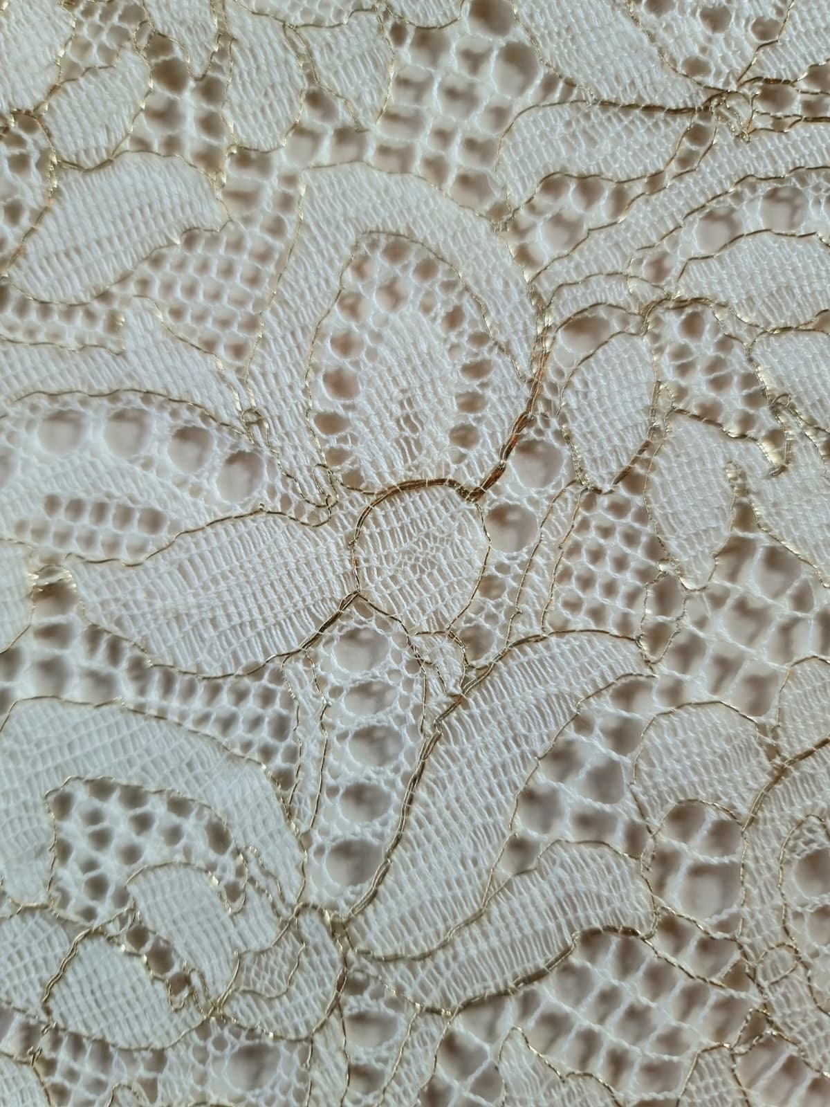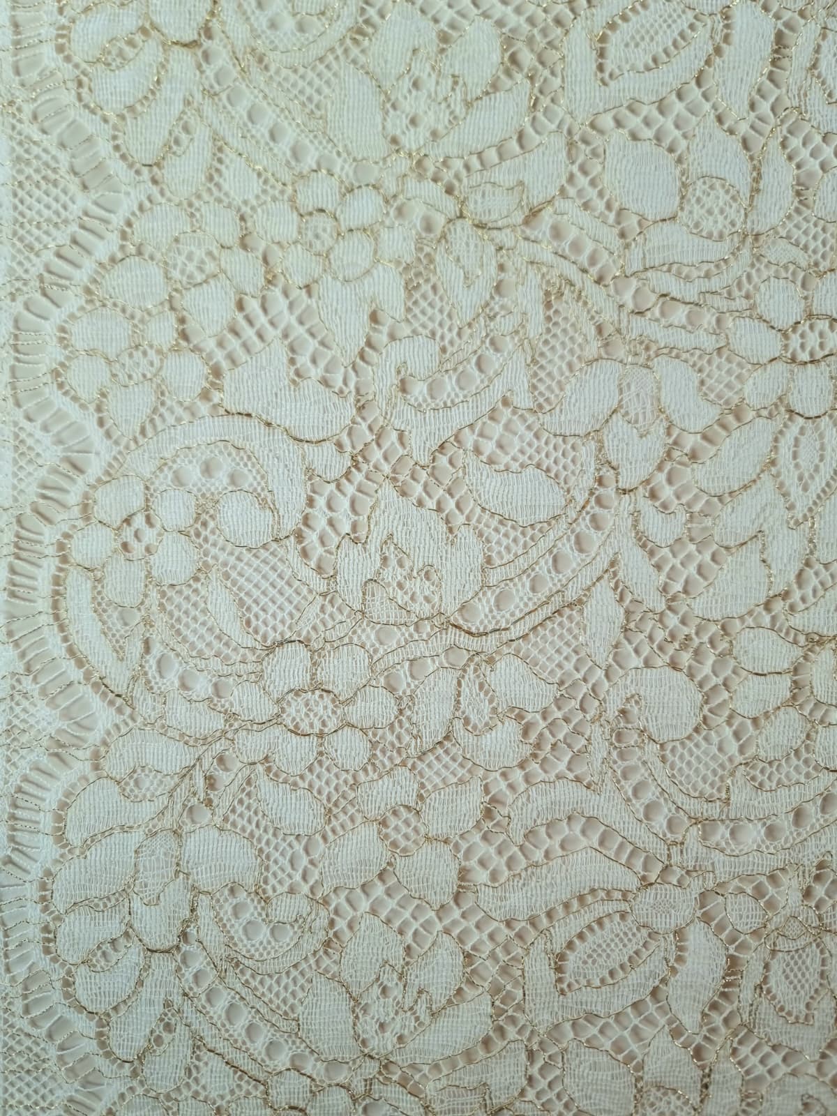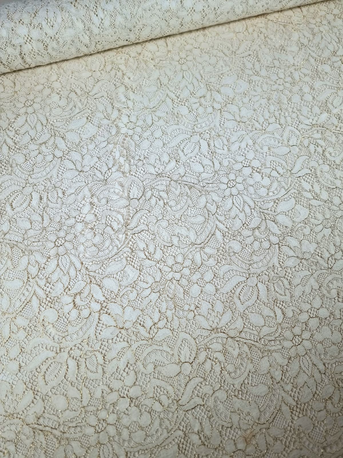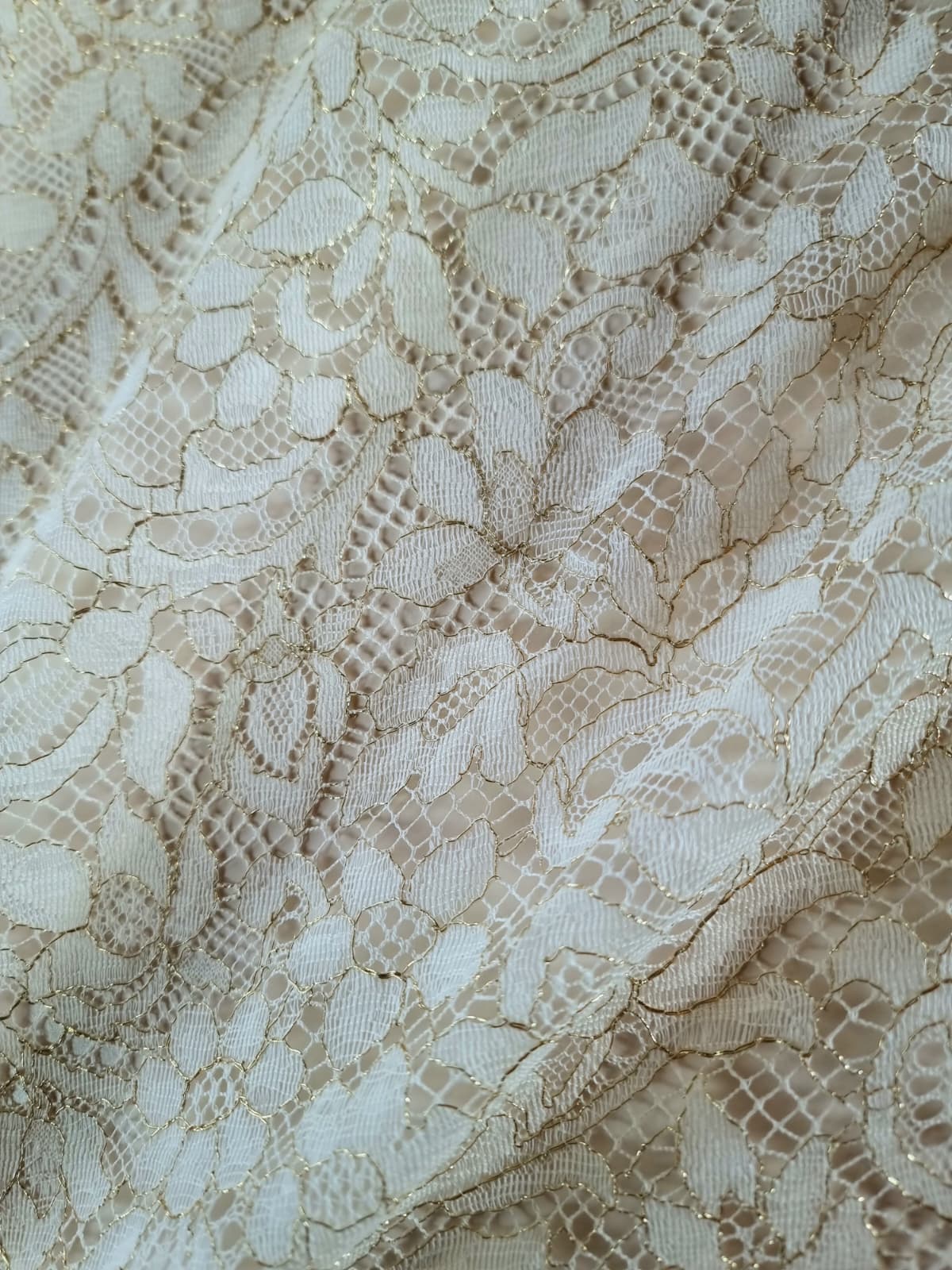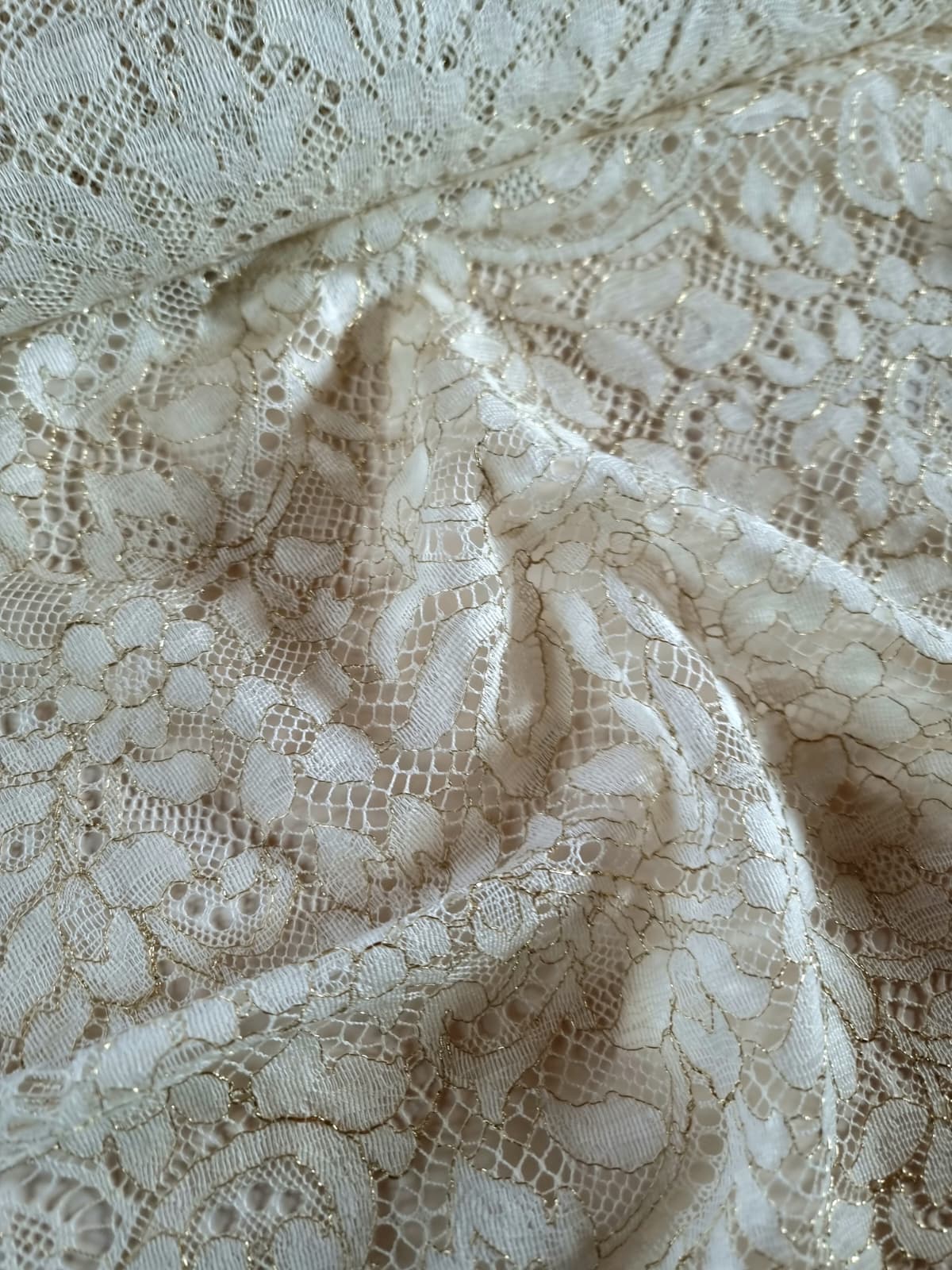 Dantela premium din fibre naturale – model floral, Ivoire cu inserție delicată de fir Auriu