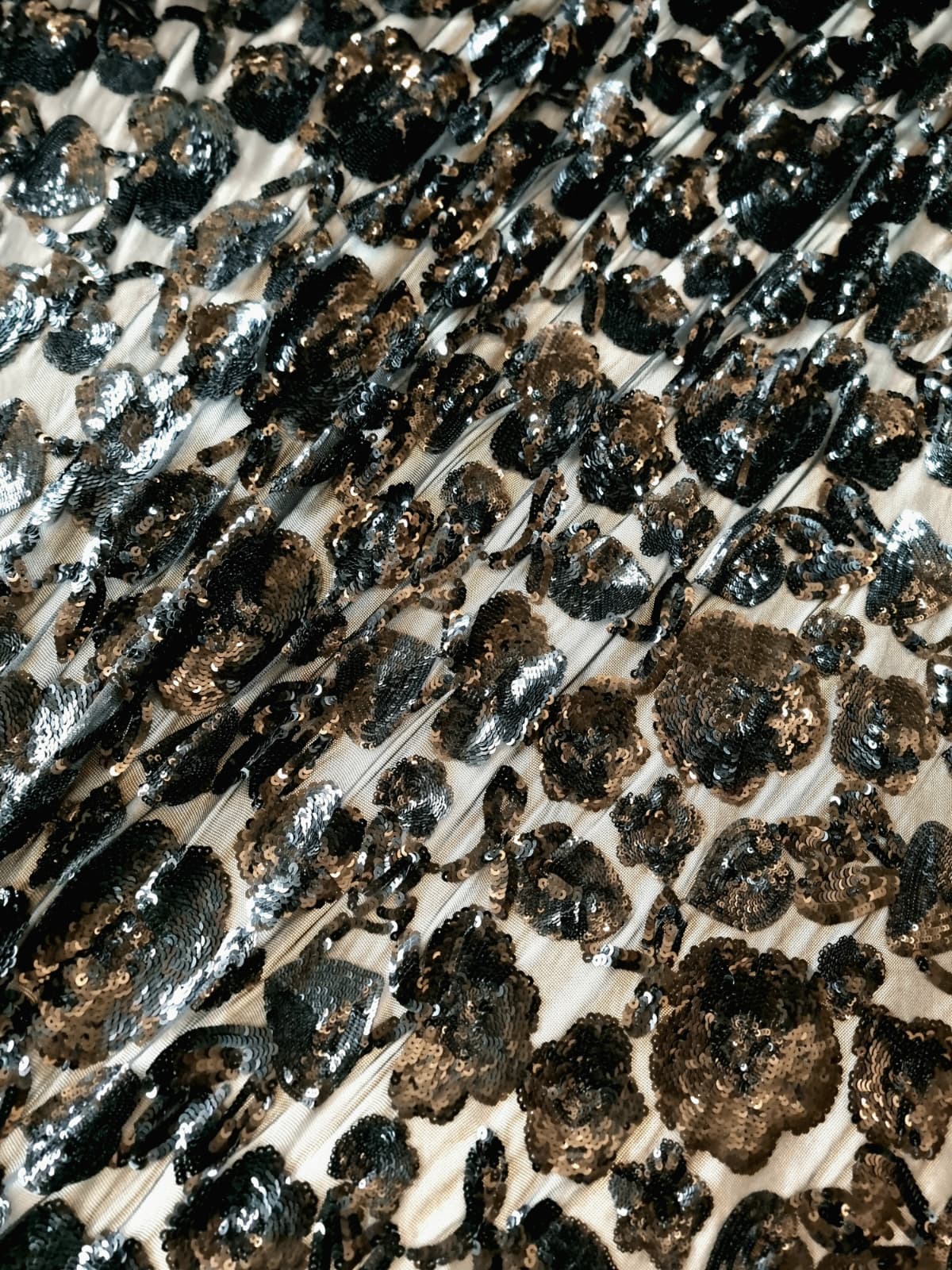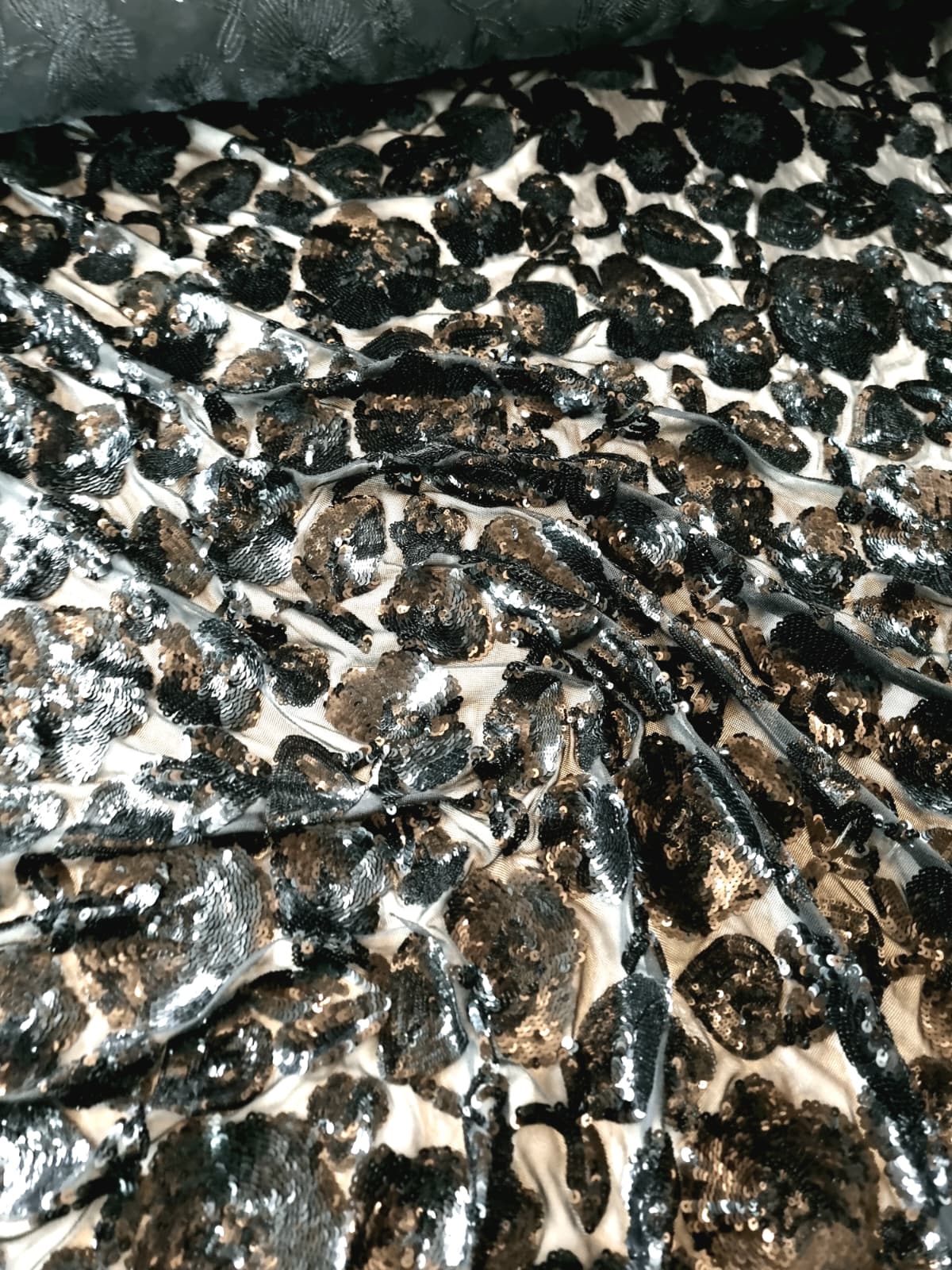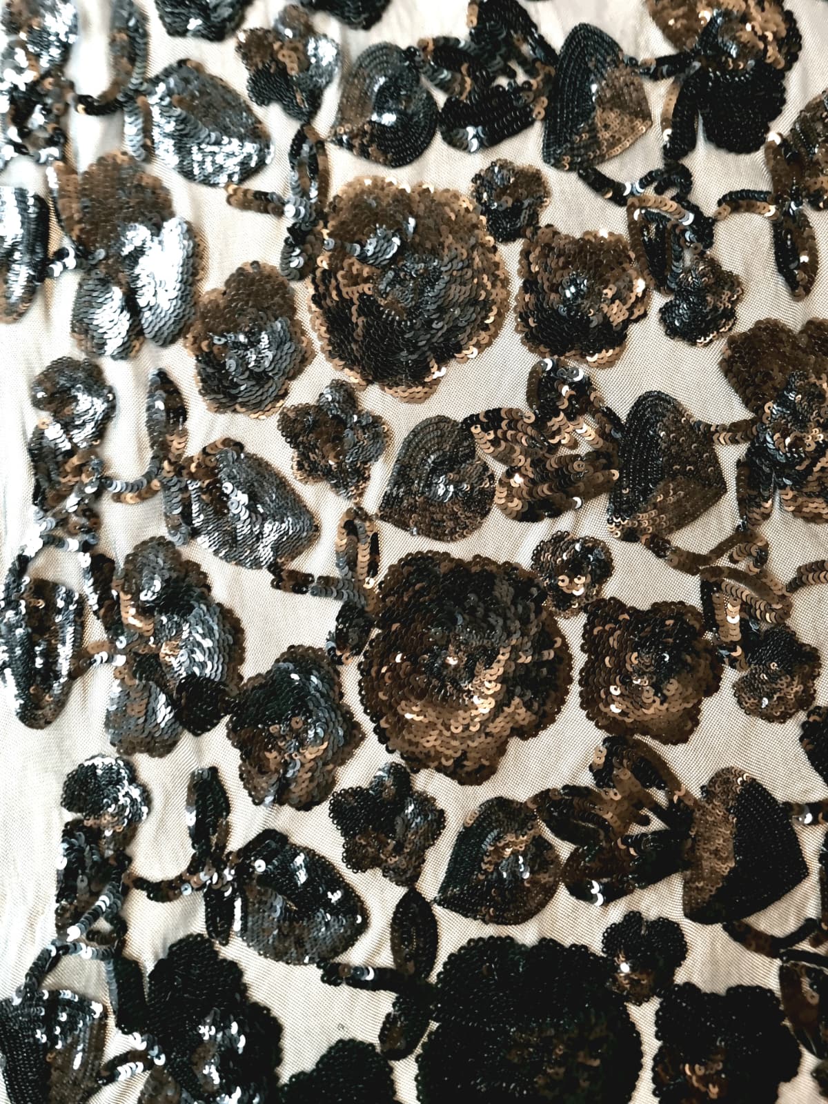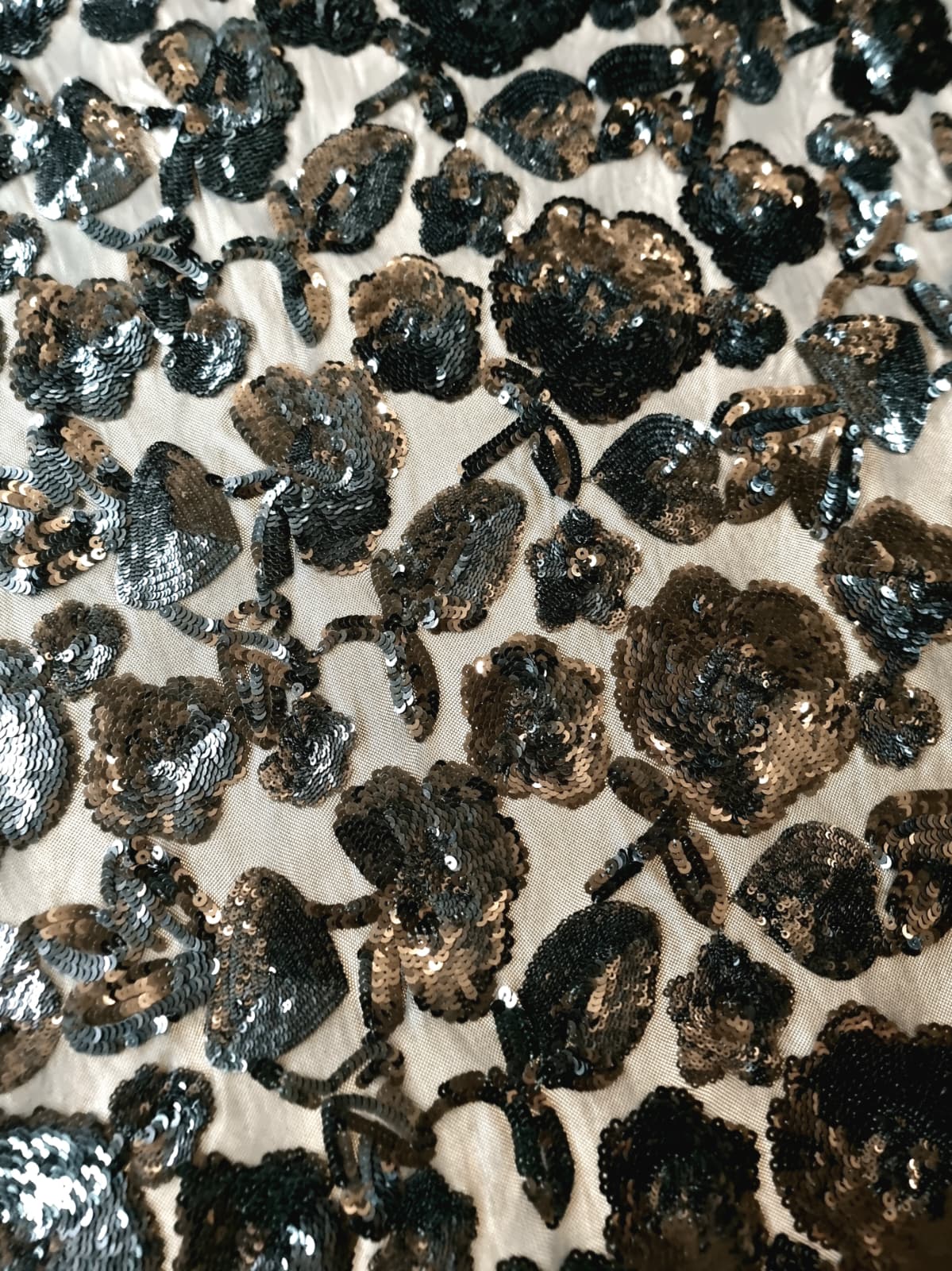Tesatura brodată cu flori dese din paiete negre pe suport de tulle elastic , Negru