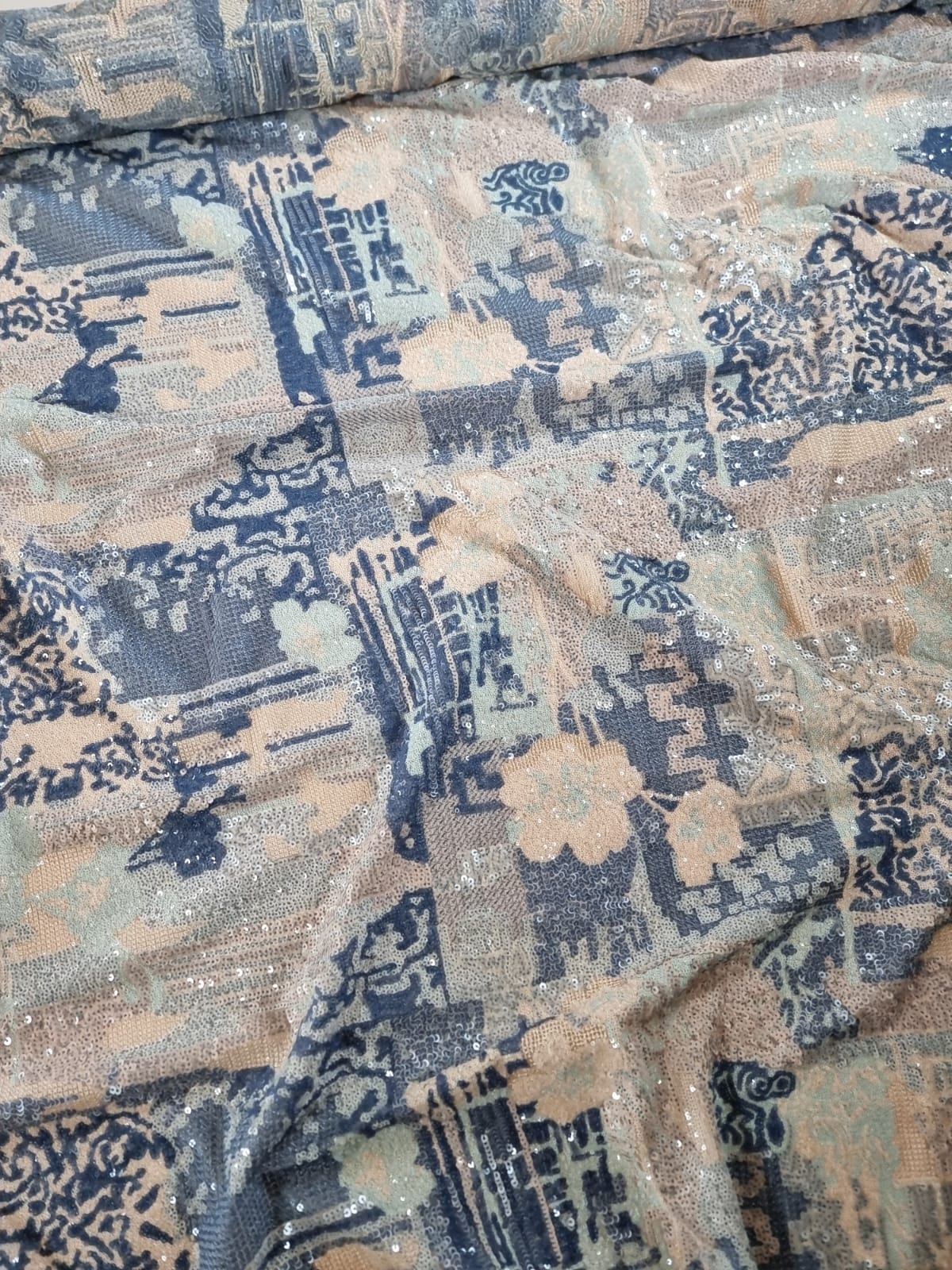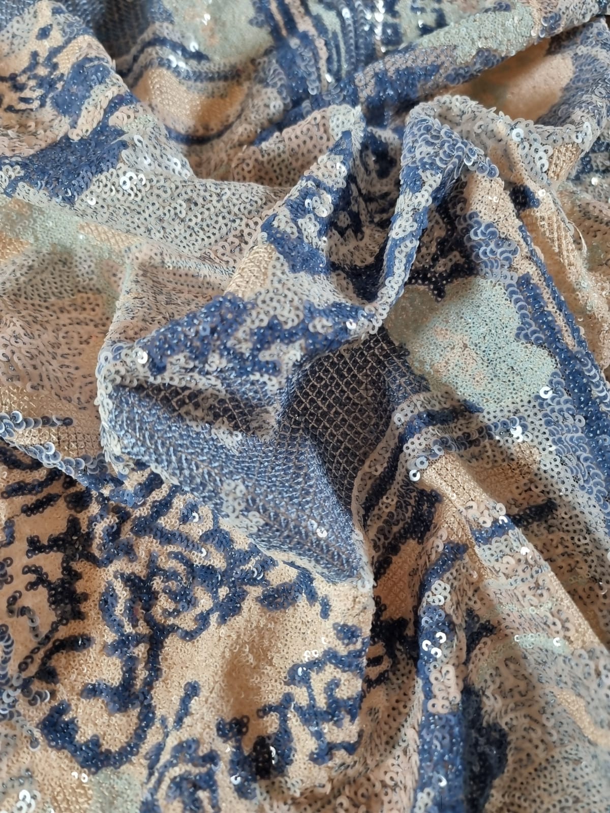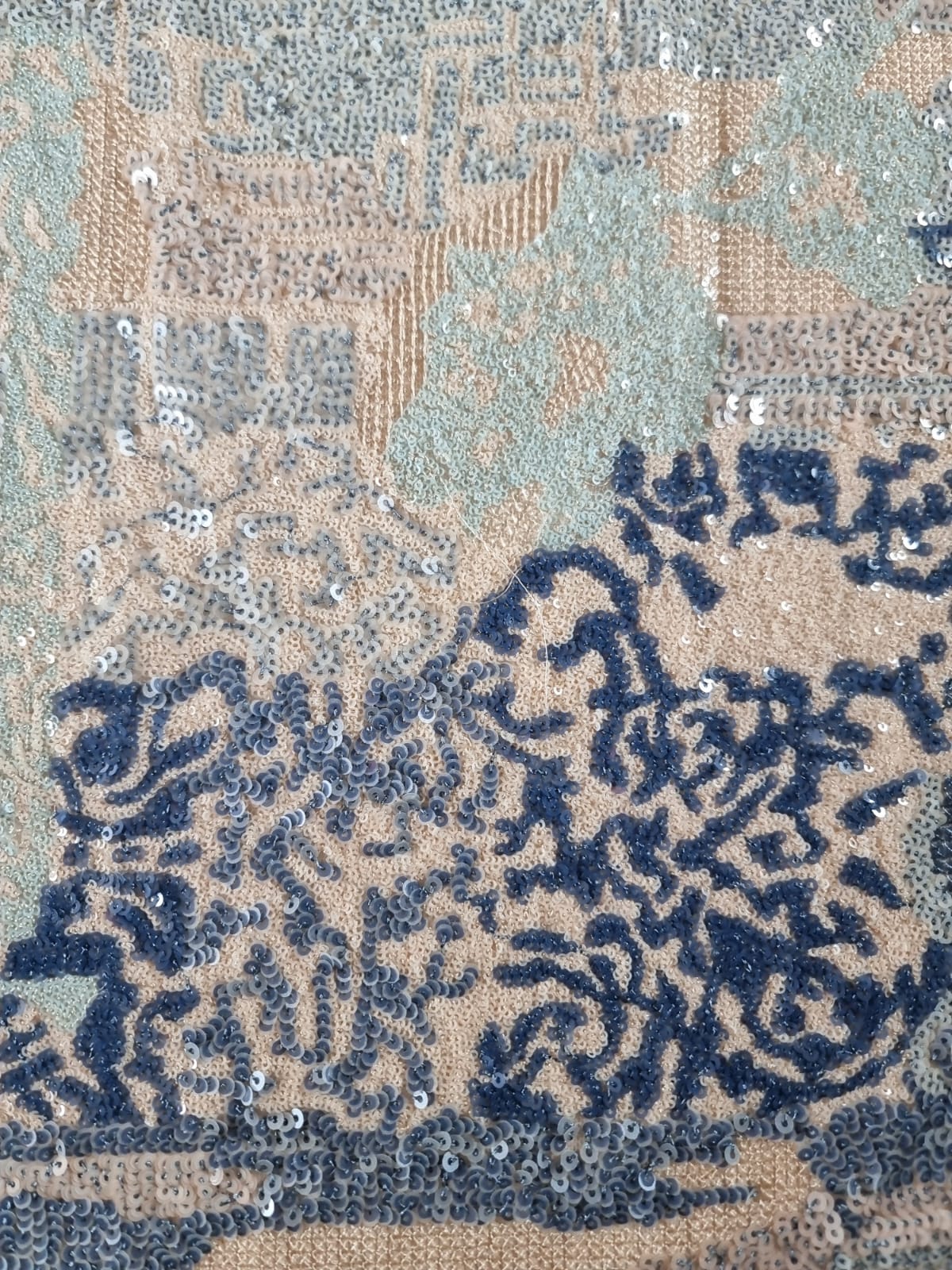 Tesatura brodata cu micropaiete – design abstract, Bej / Albastru