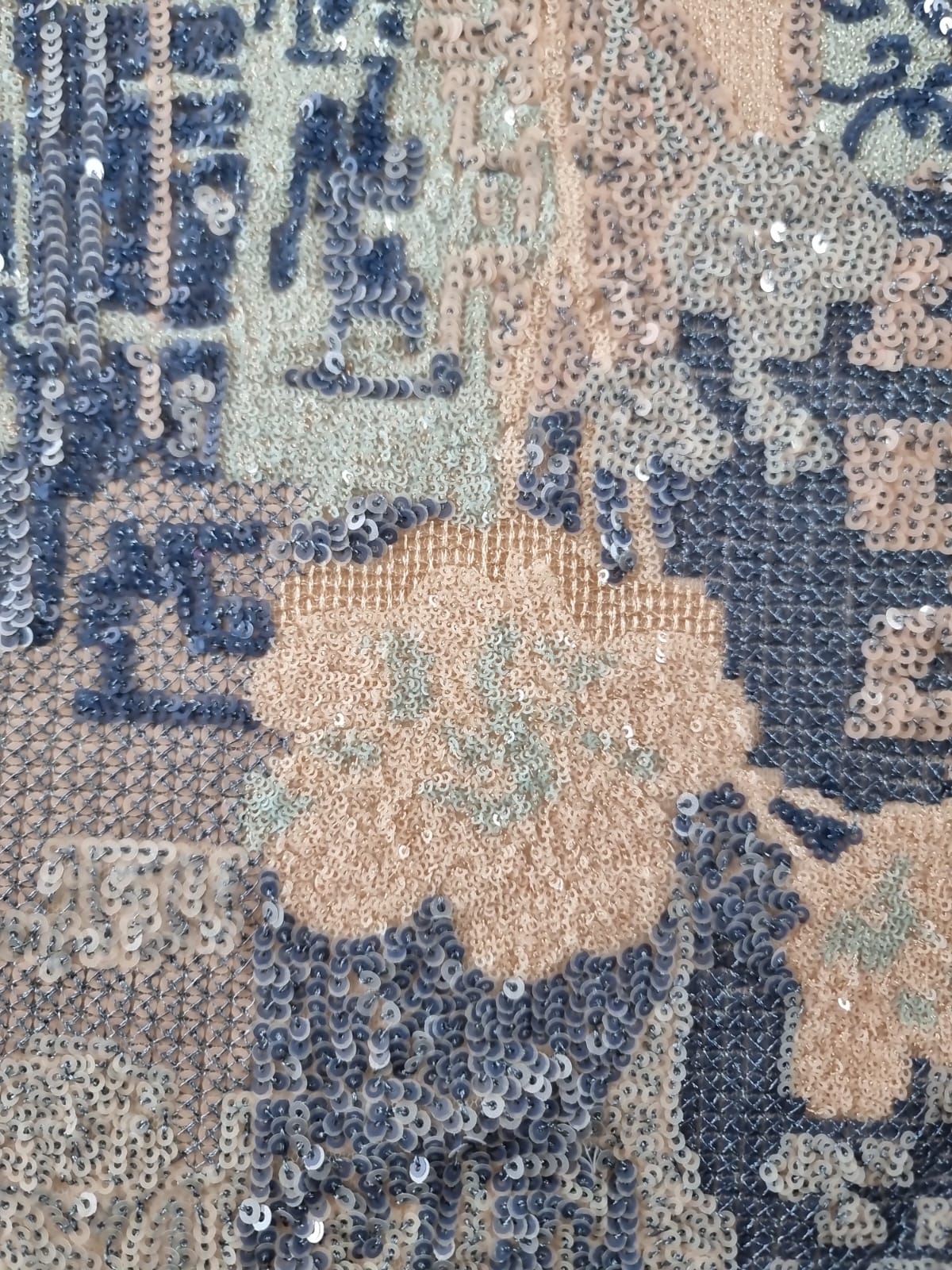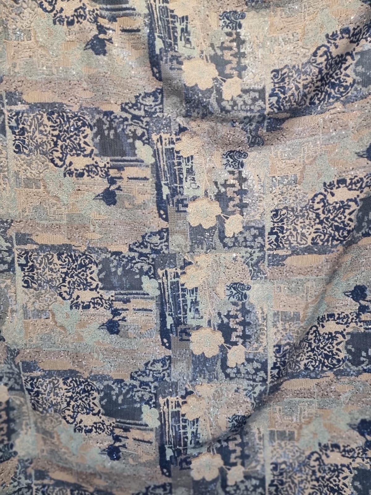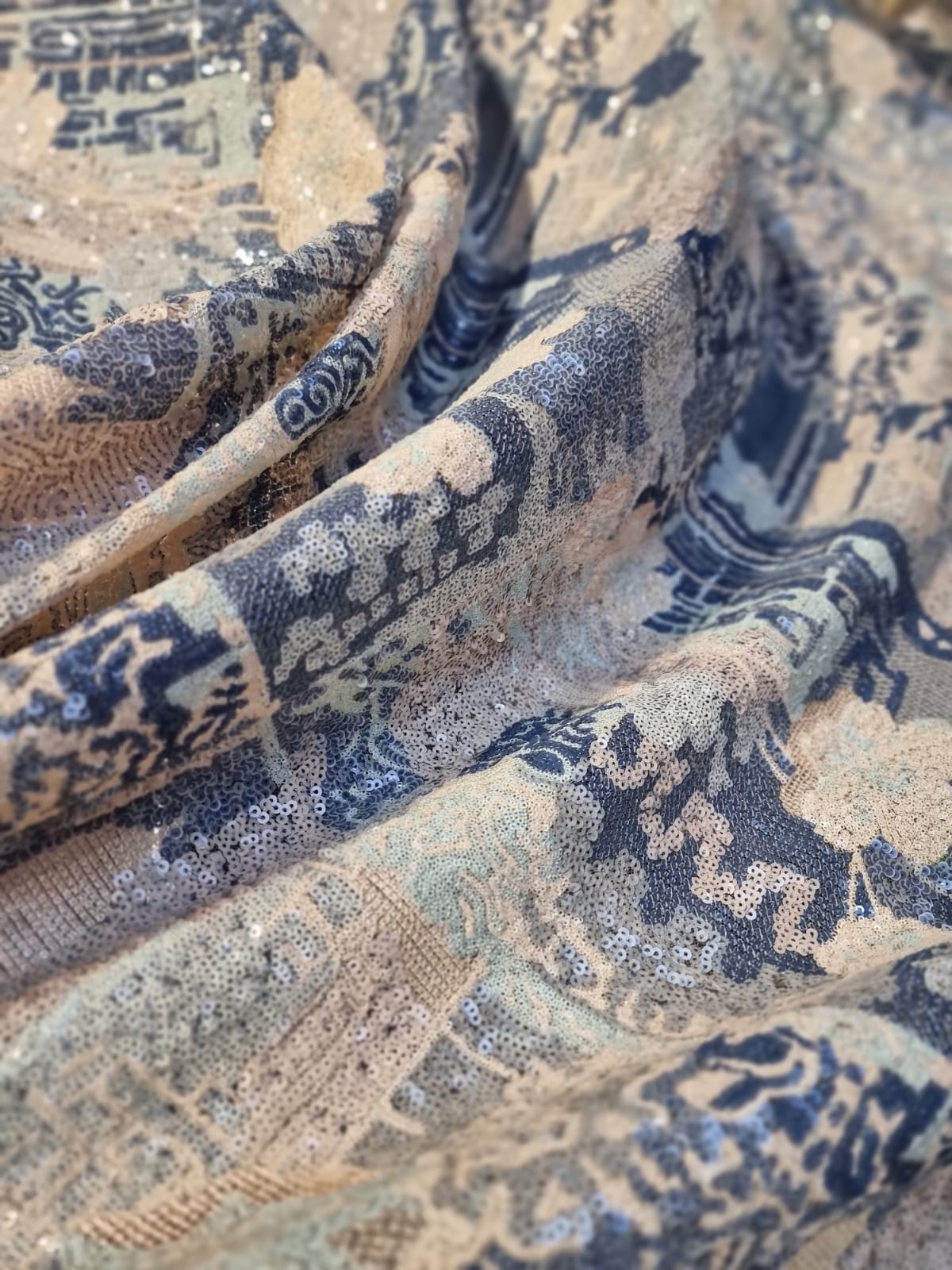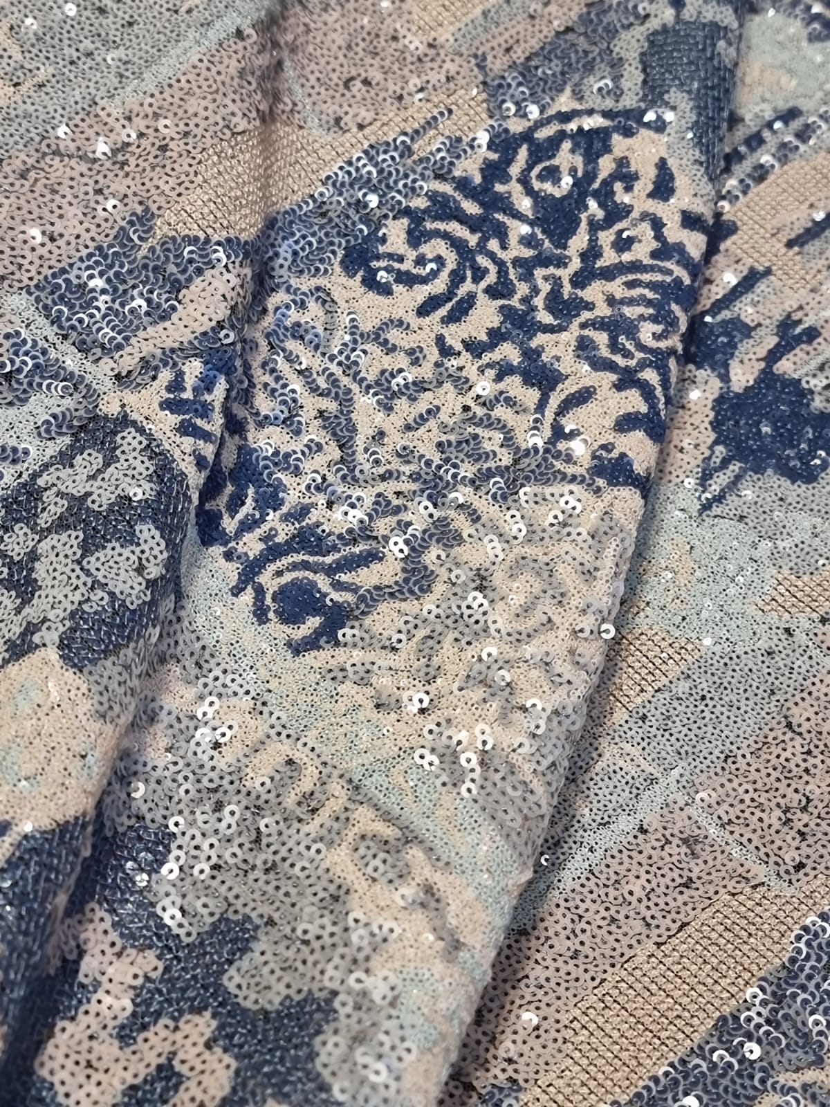 Tesatura brodata cu micropaiete – design abstract, Bej / Albastru