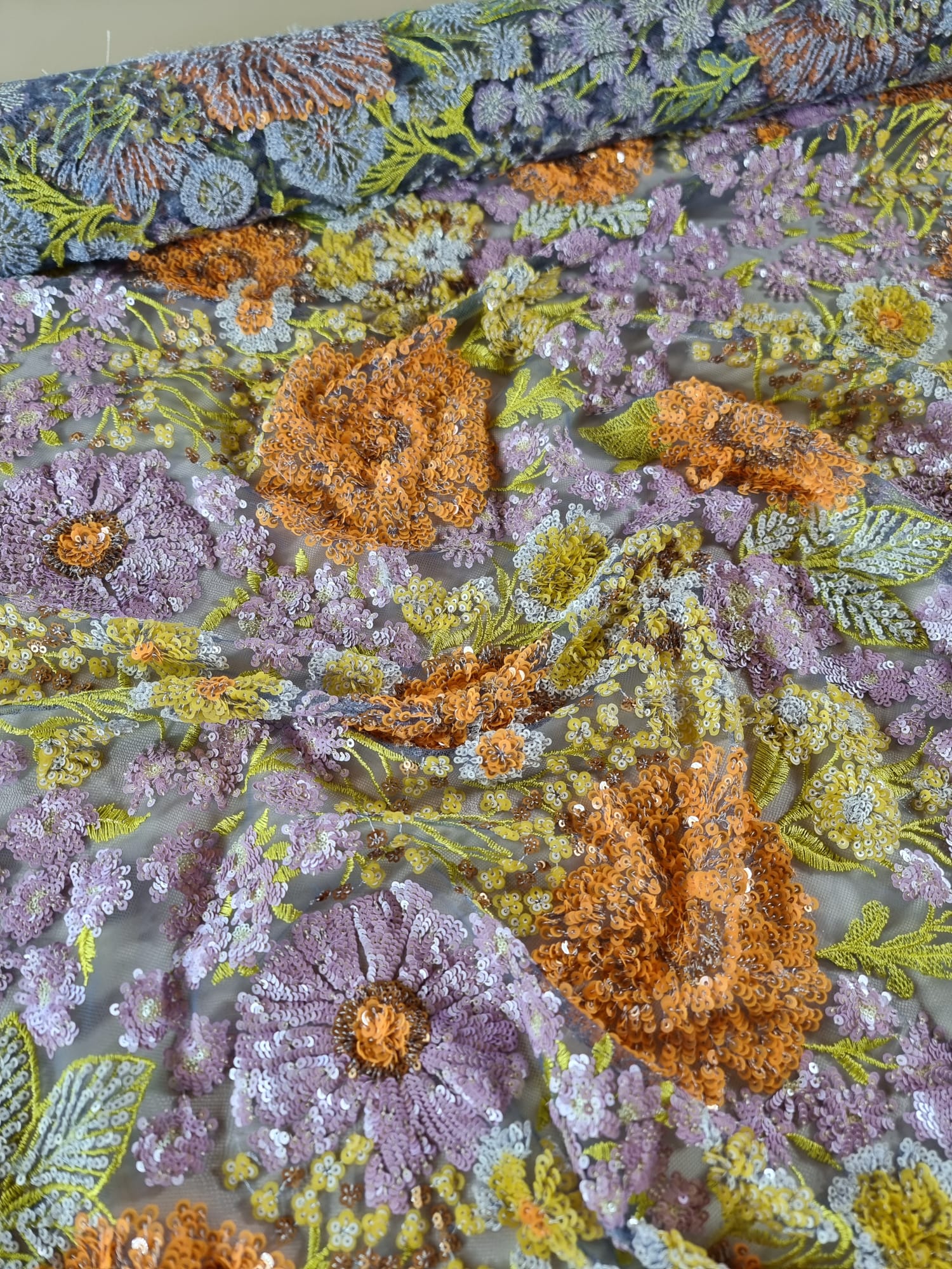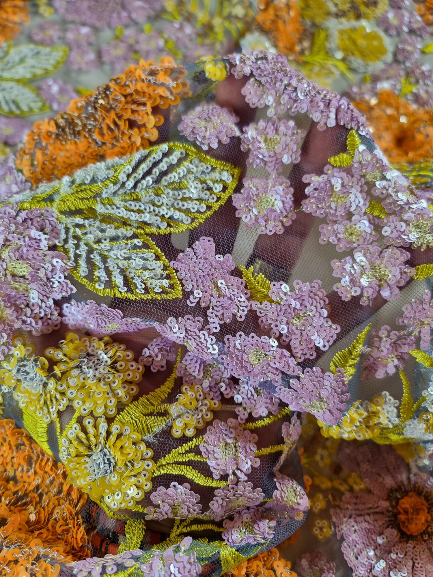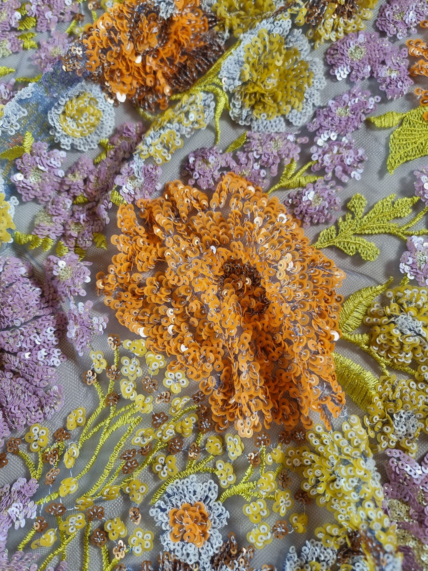 Tesatura brodata cu paiete pe suport de tulle elastic , design cu flori mari portocalii pe fond lila
