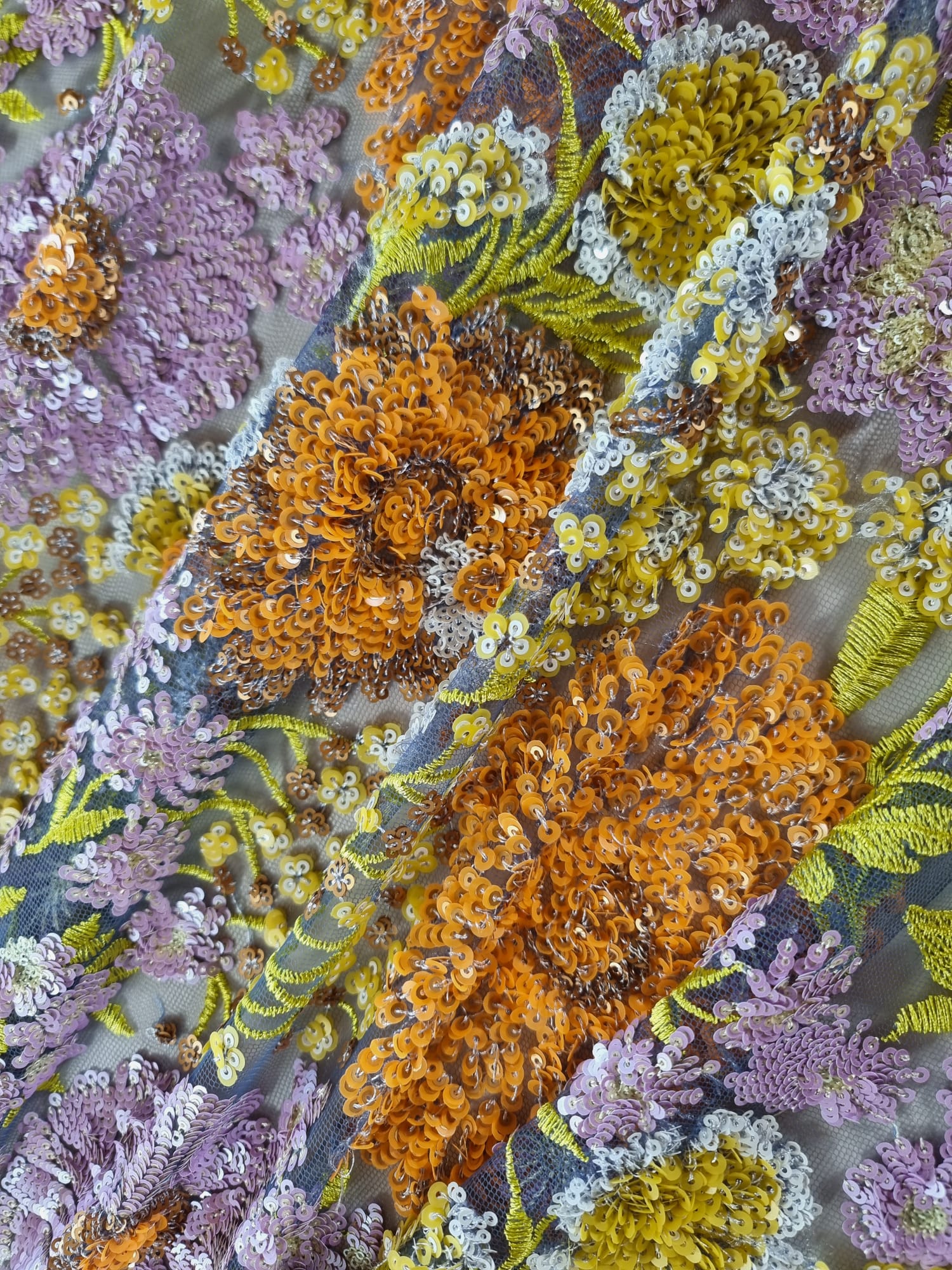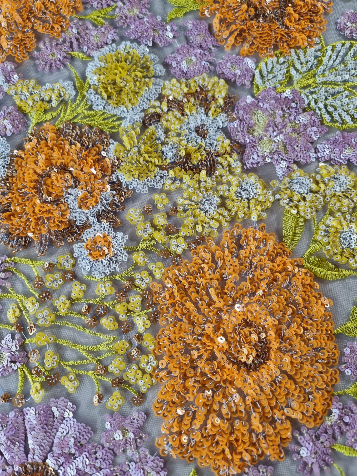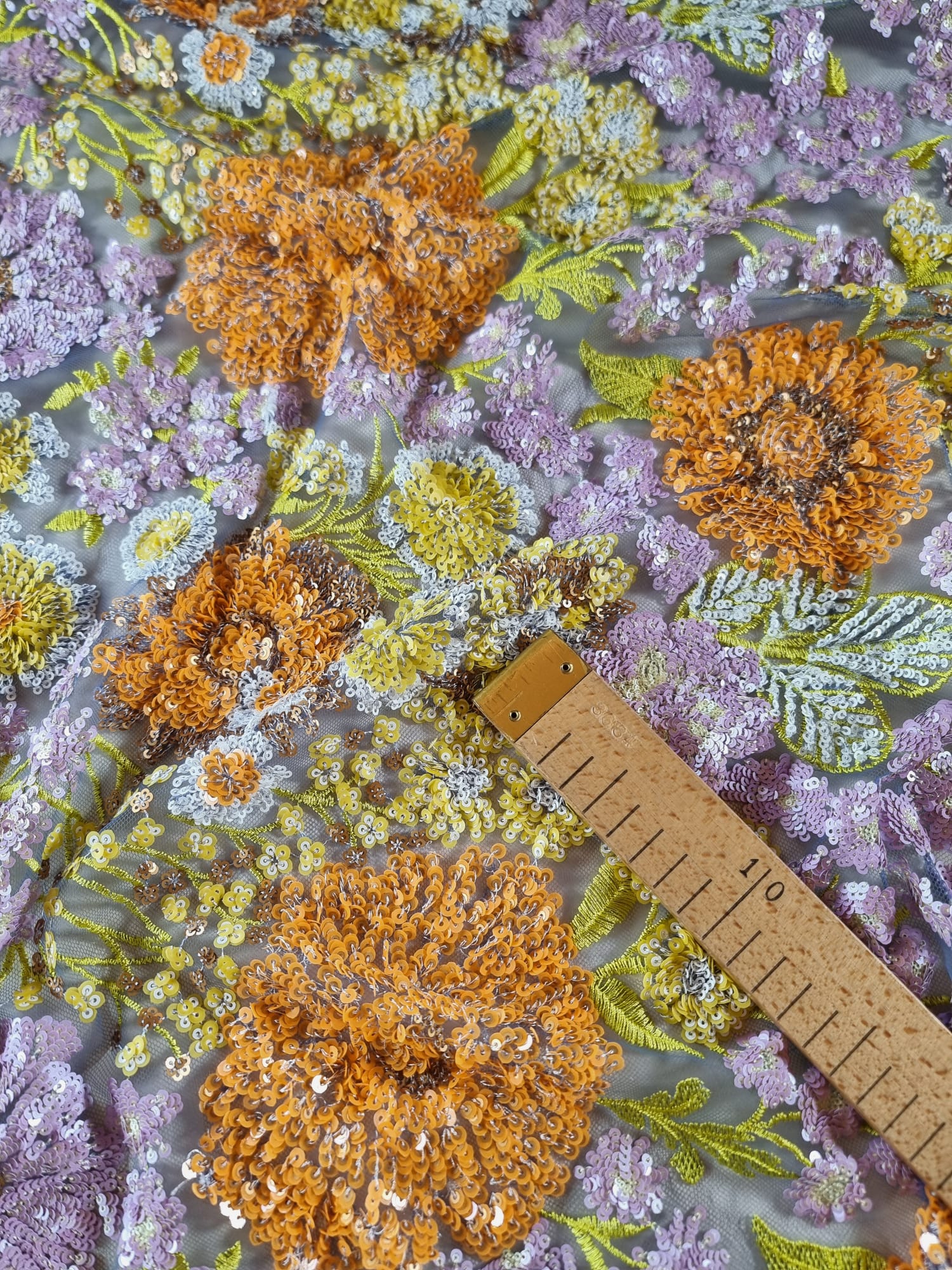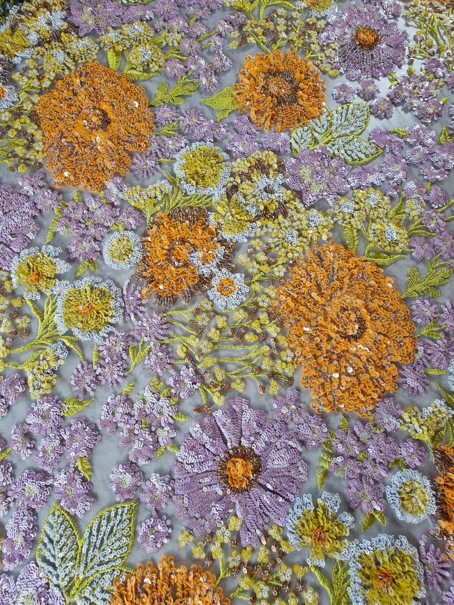 Tesatura brodata cu paiete pe suport de tulle elastic , design cu flori mari portocalii pe fond lila