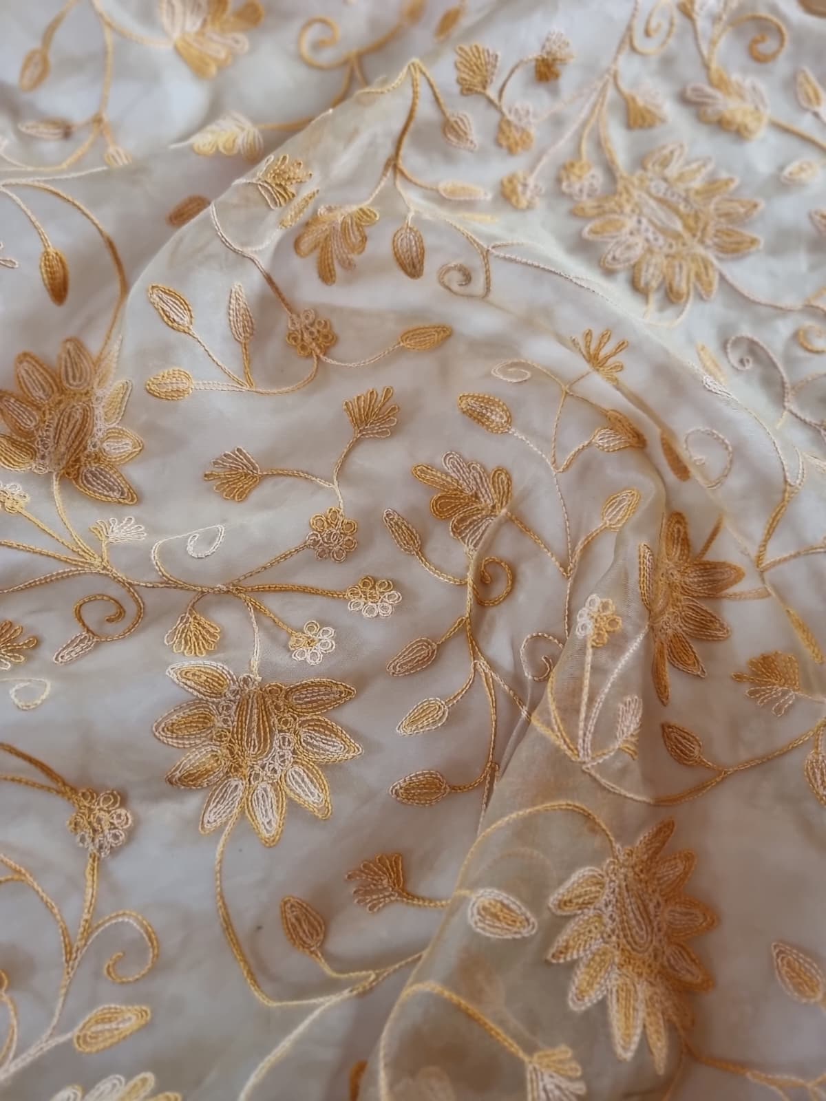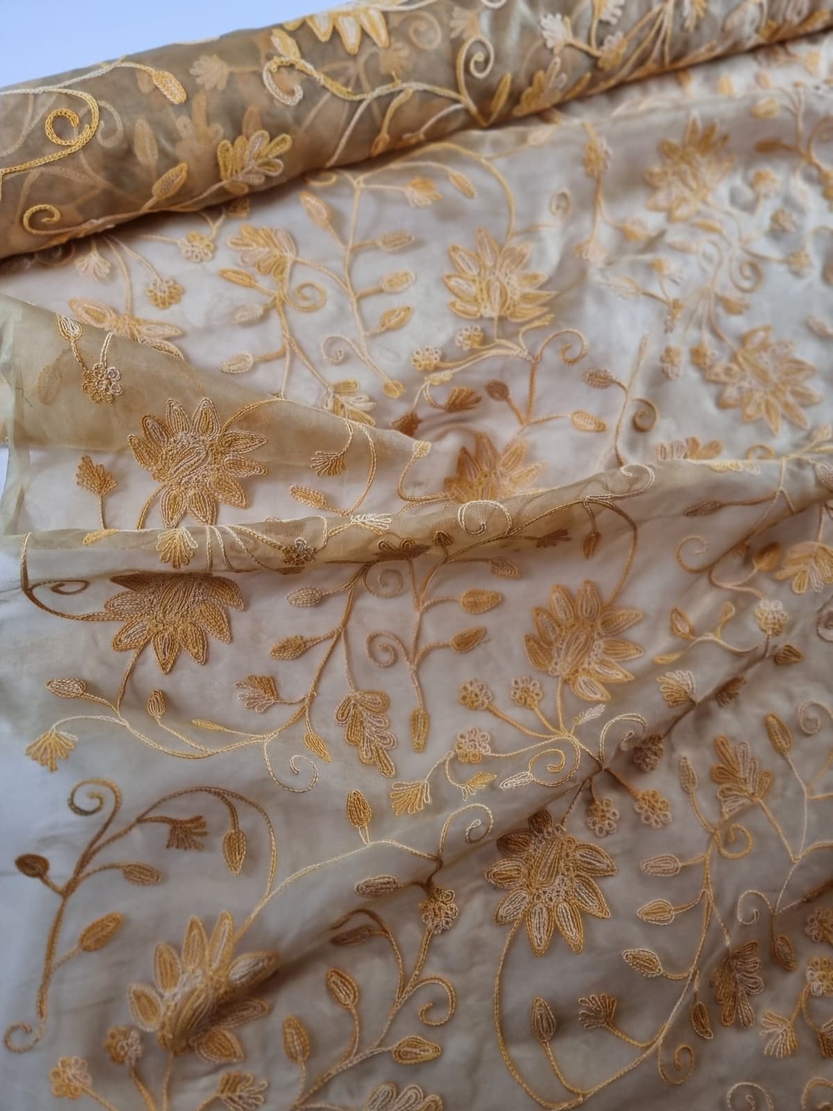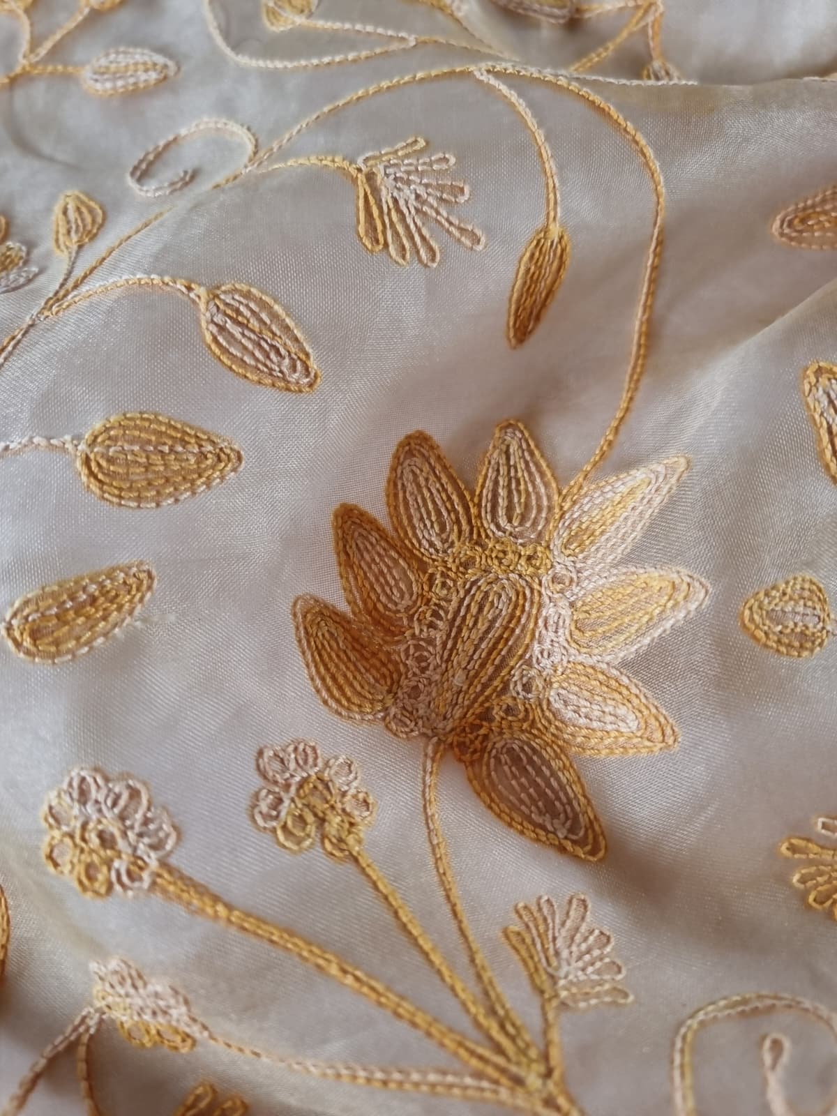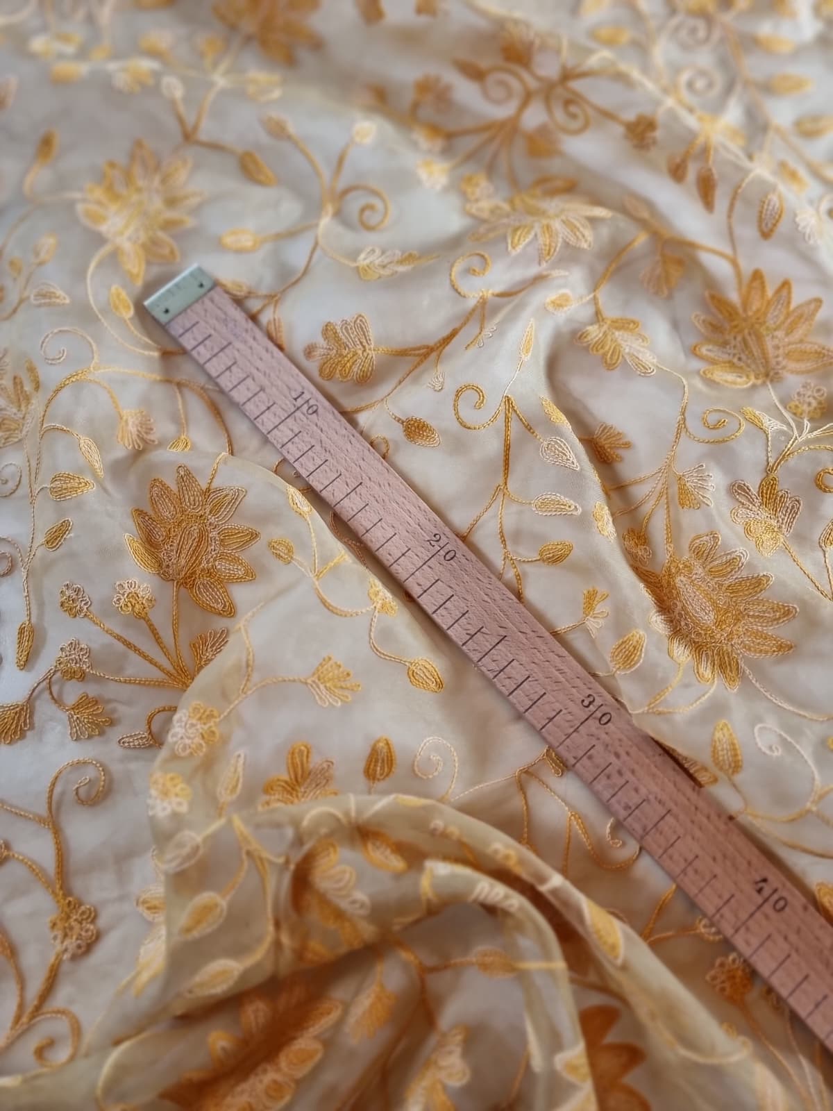 Tesatura brodata pe suport Organza – design floral, Galben mustar