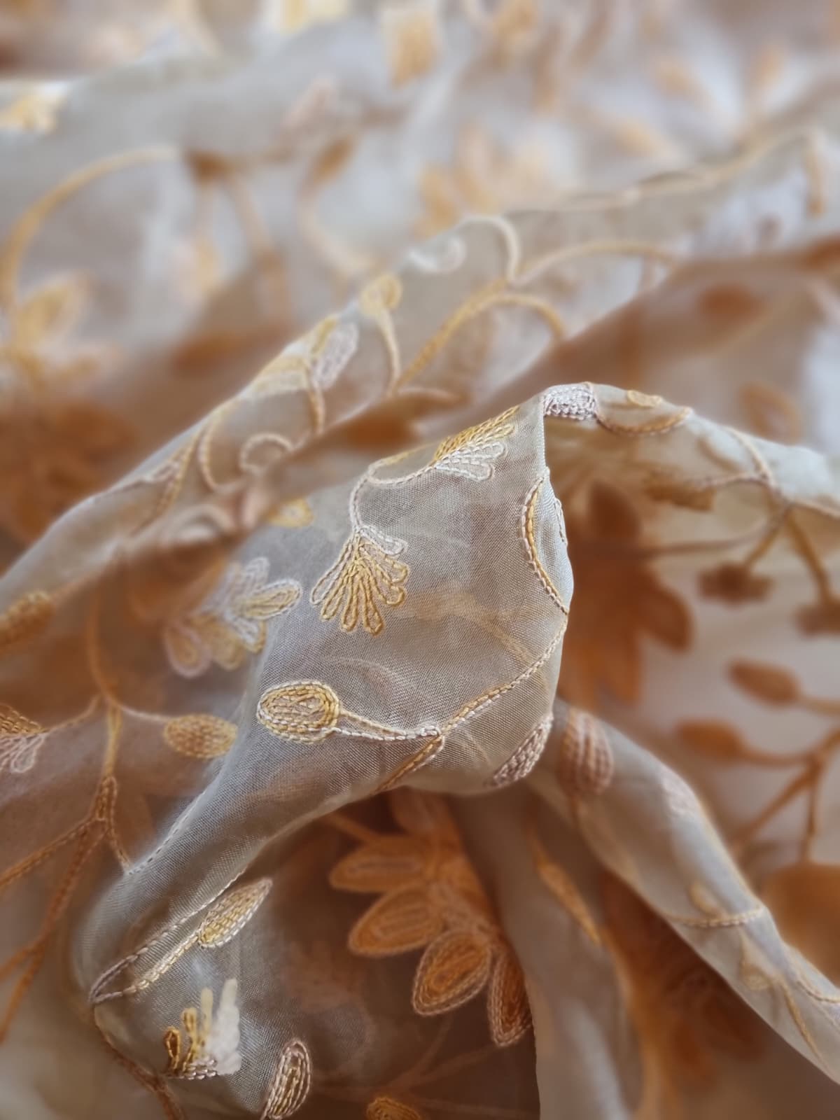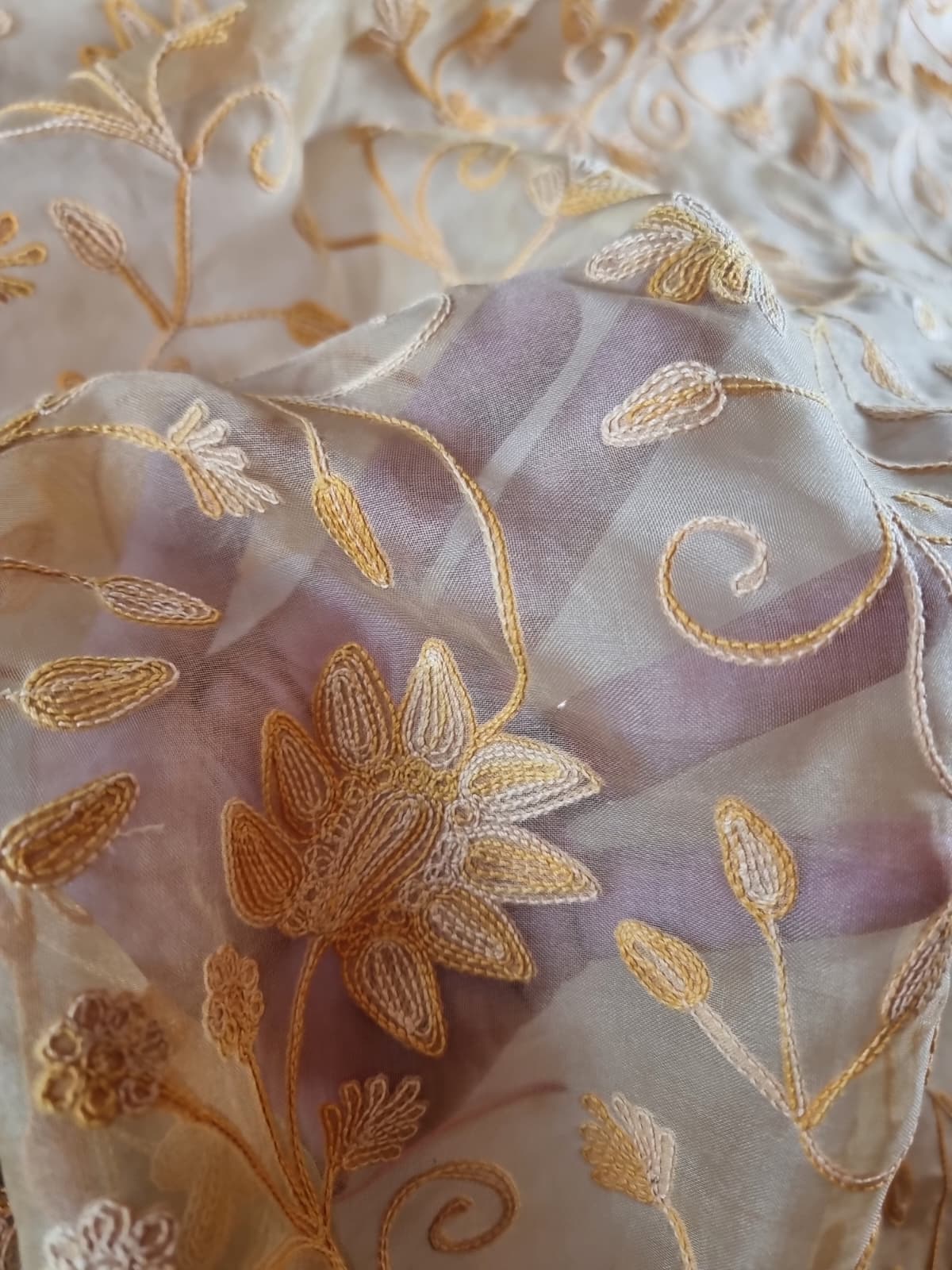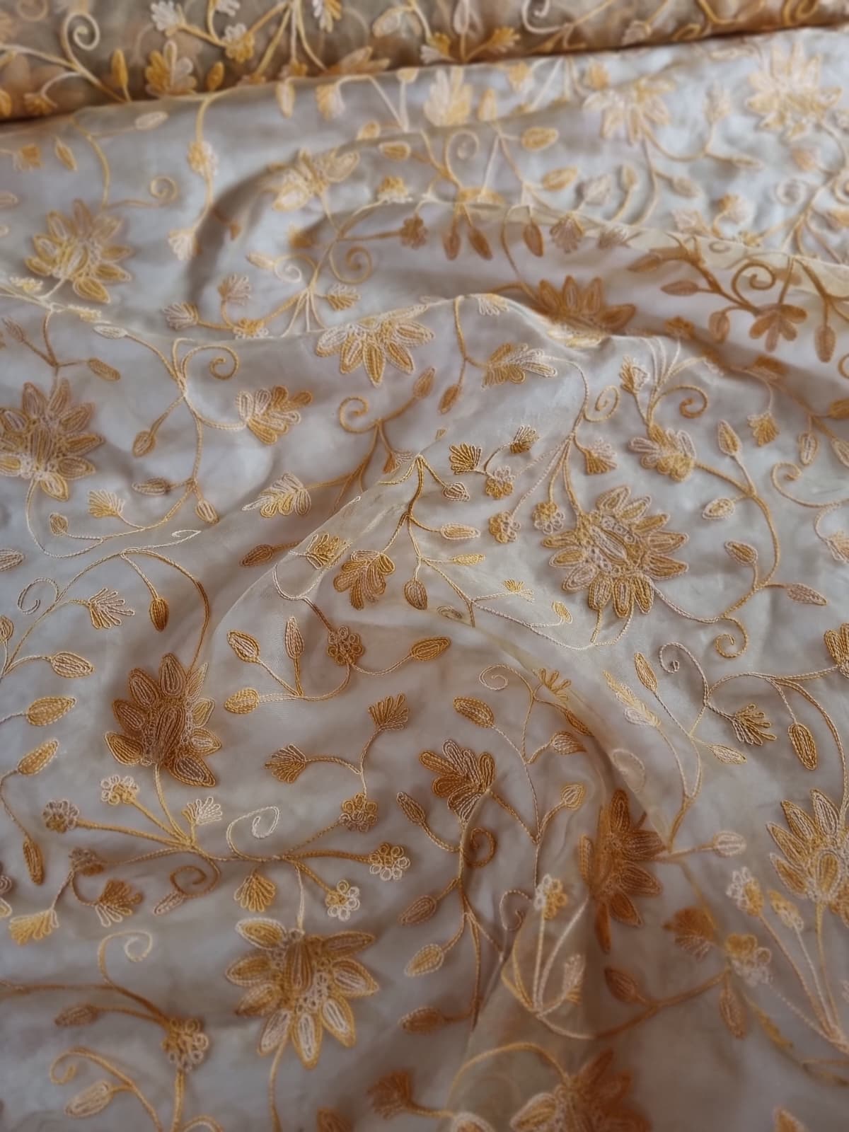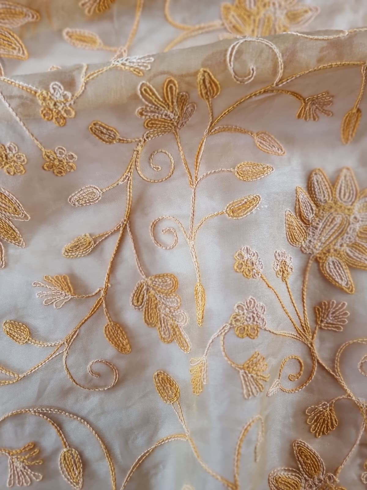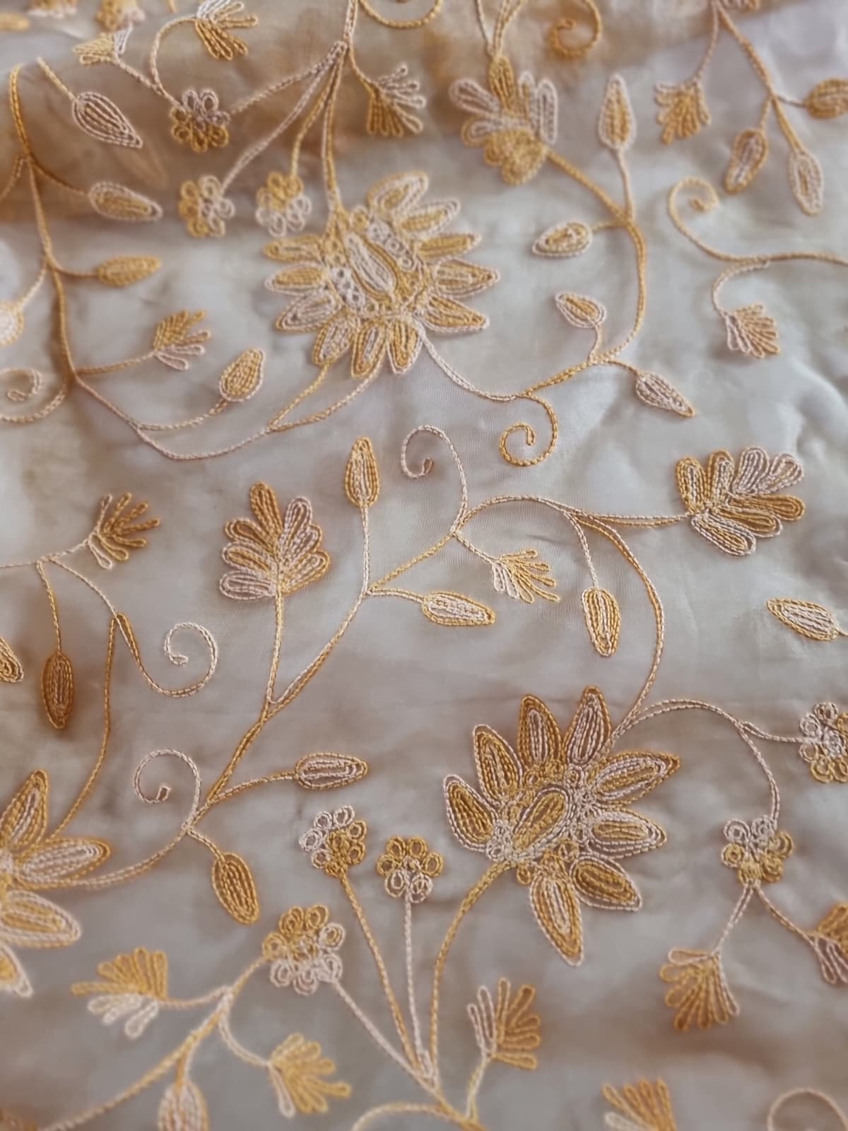 Tesatura brodata pe suport Organza – design floral, Galben mustar
