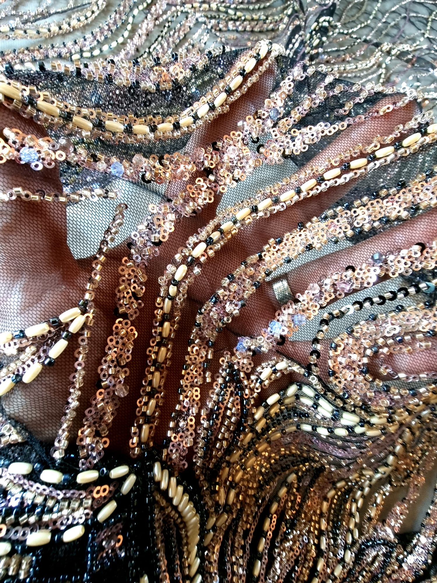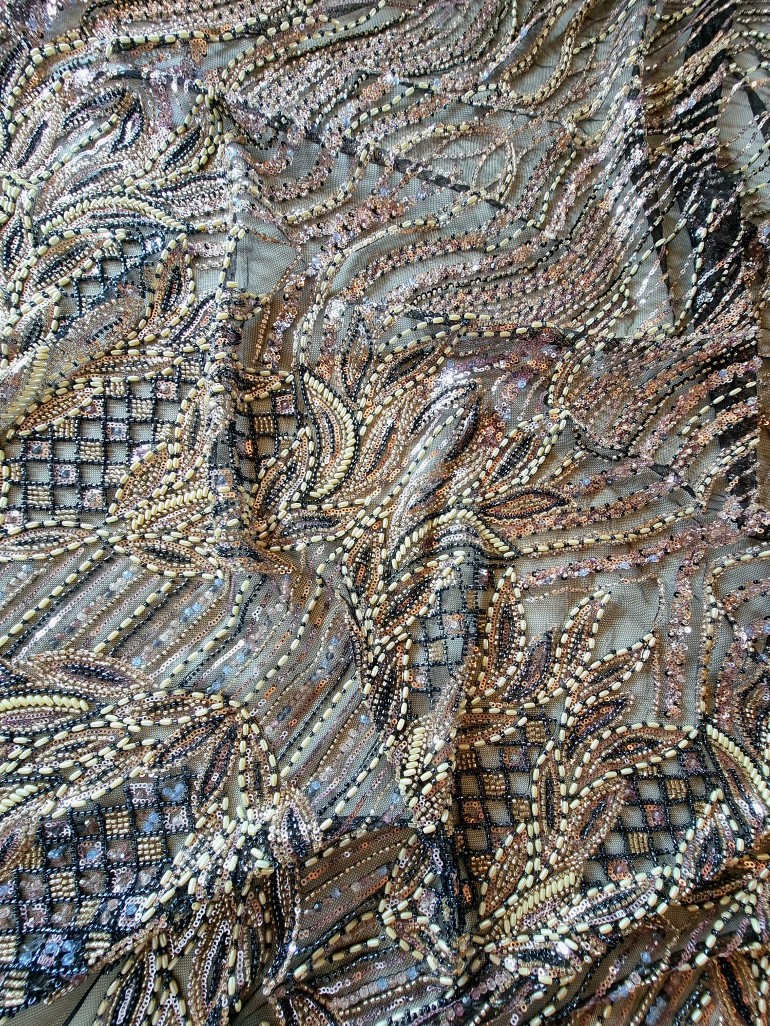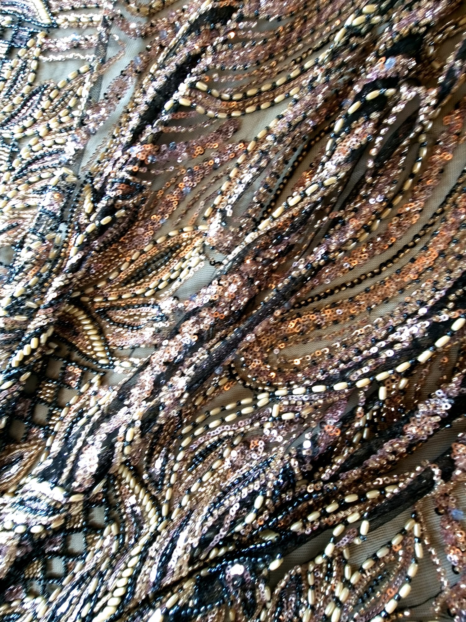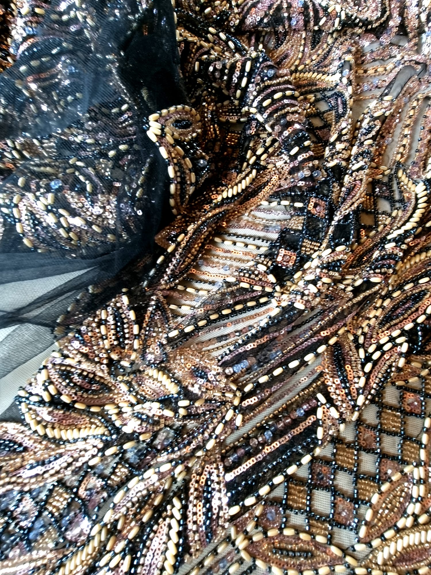 Tesatura cu broderie bogată cu mărgele si paiete pe suport de tulle, Negru / Cupru / Auriu