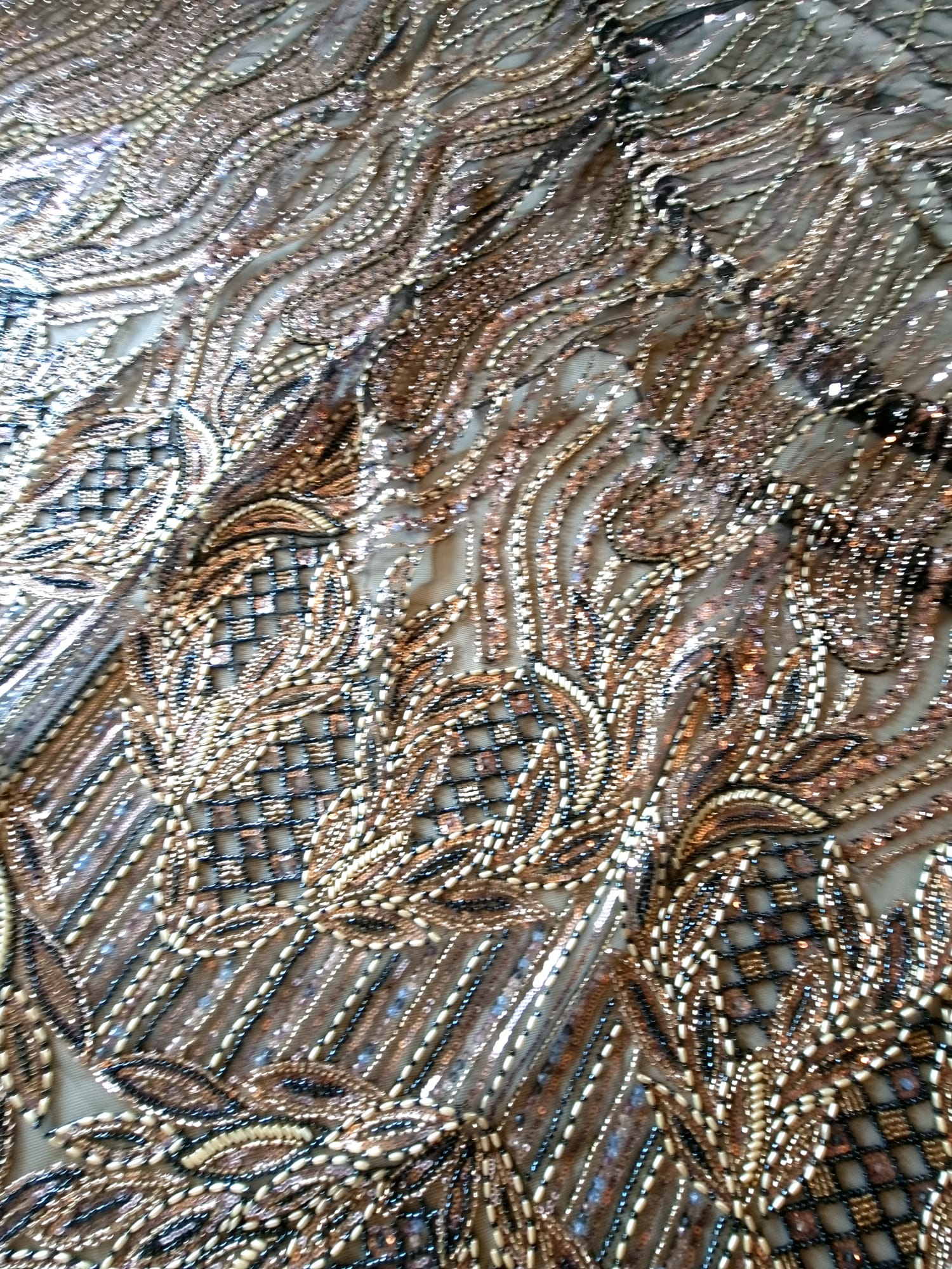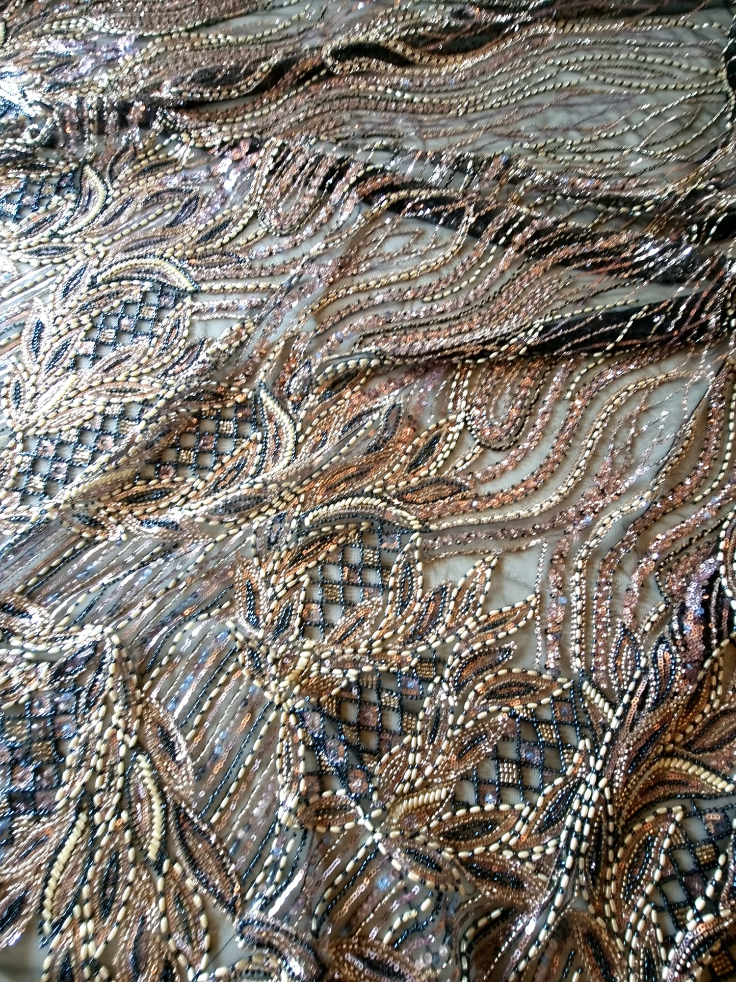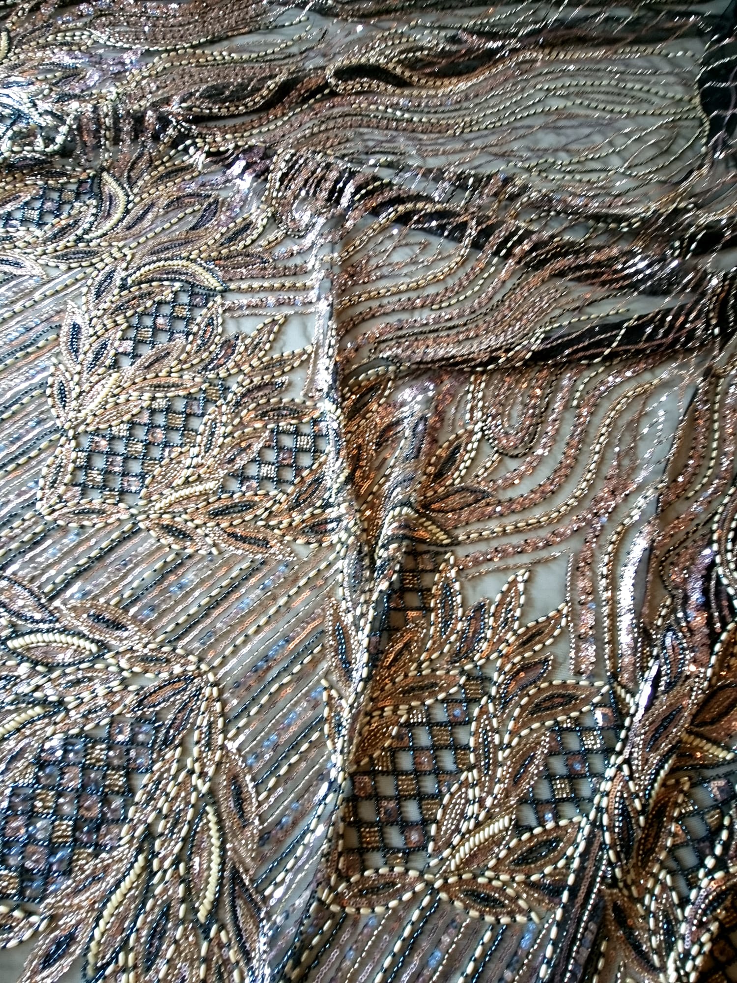 Tesatura cu broderie bogată cu mărgele si paiete pe suport de tulle, Negru / Cupru / Auriu