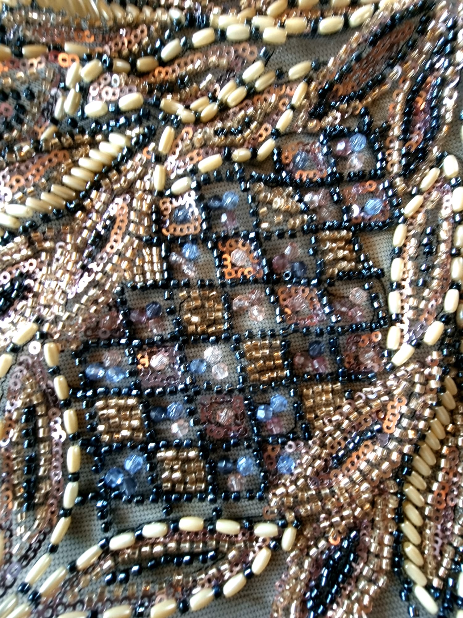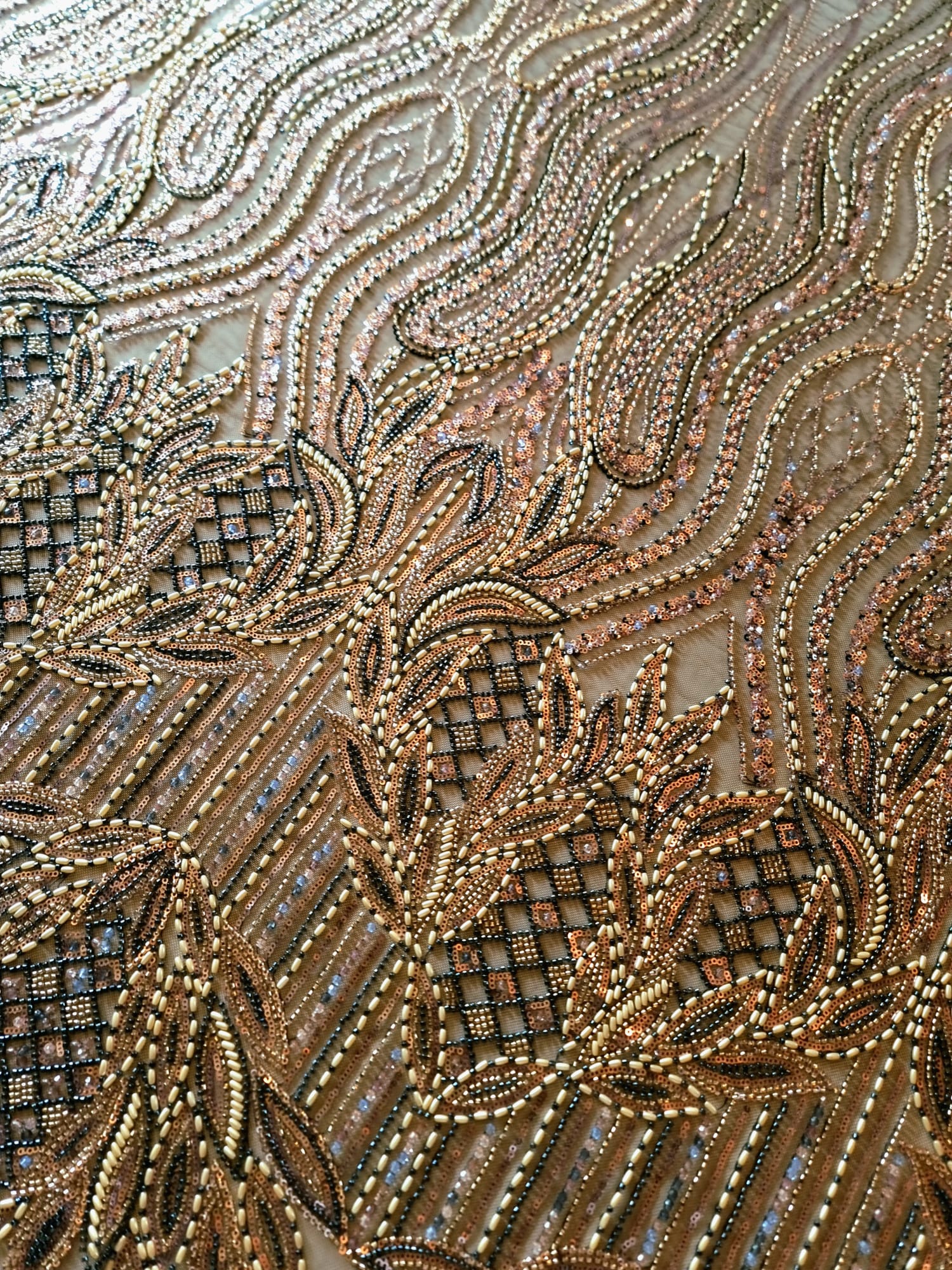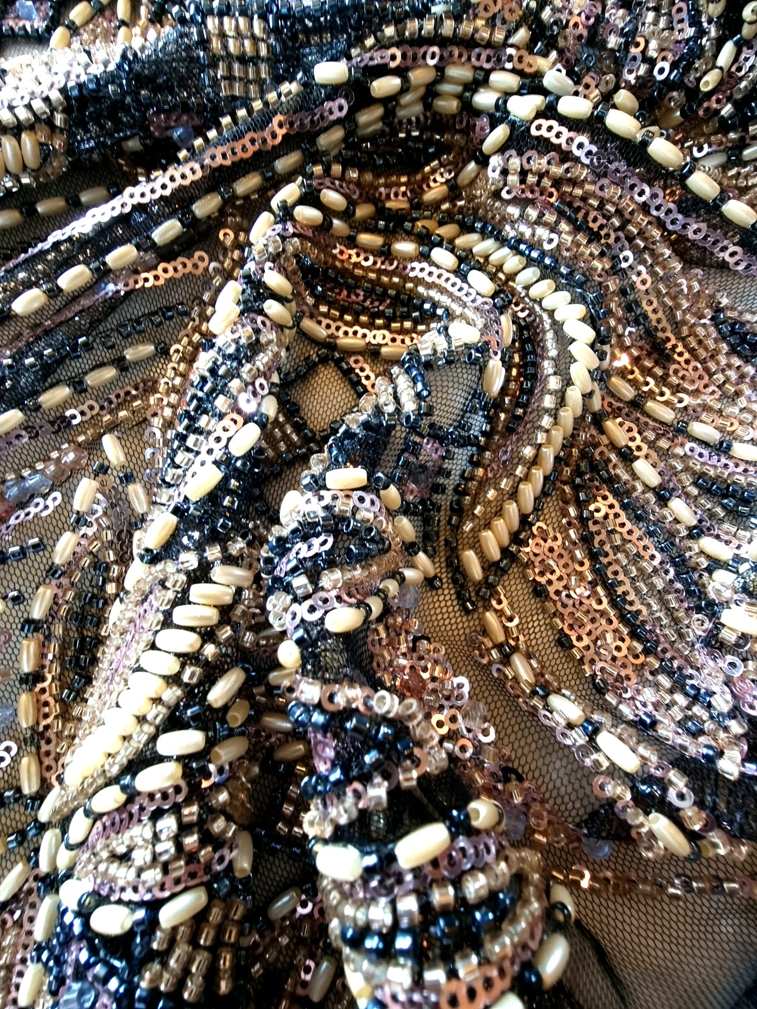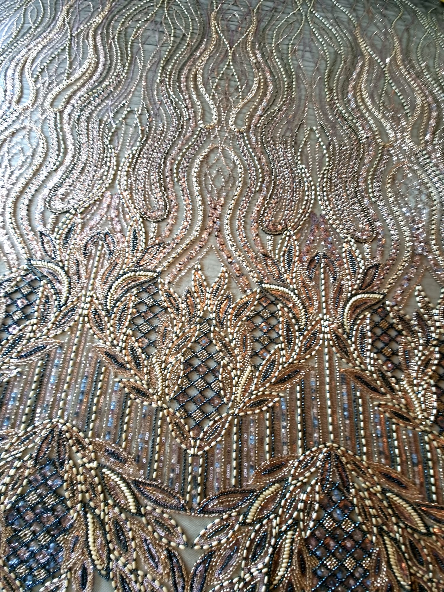 Tesatura cu broderie bogată cu mărgele si paiete pe suport de tulle, Negru / Cupru / Auriu