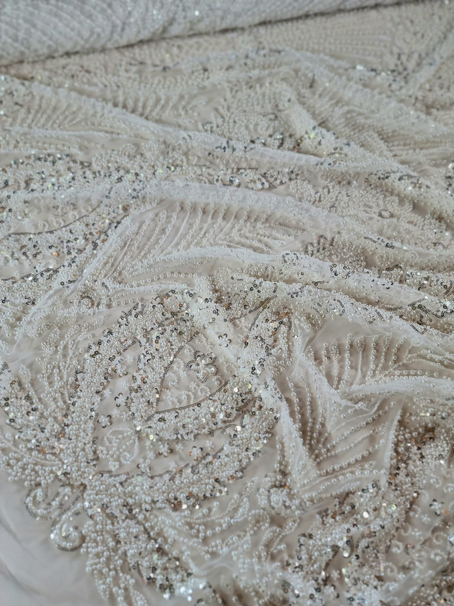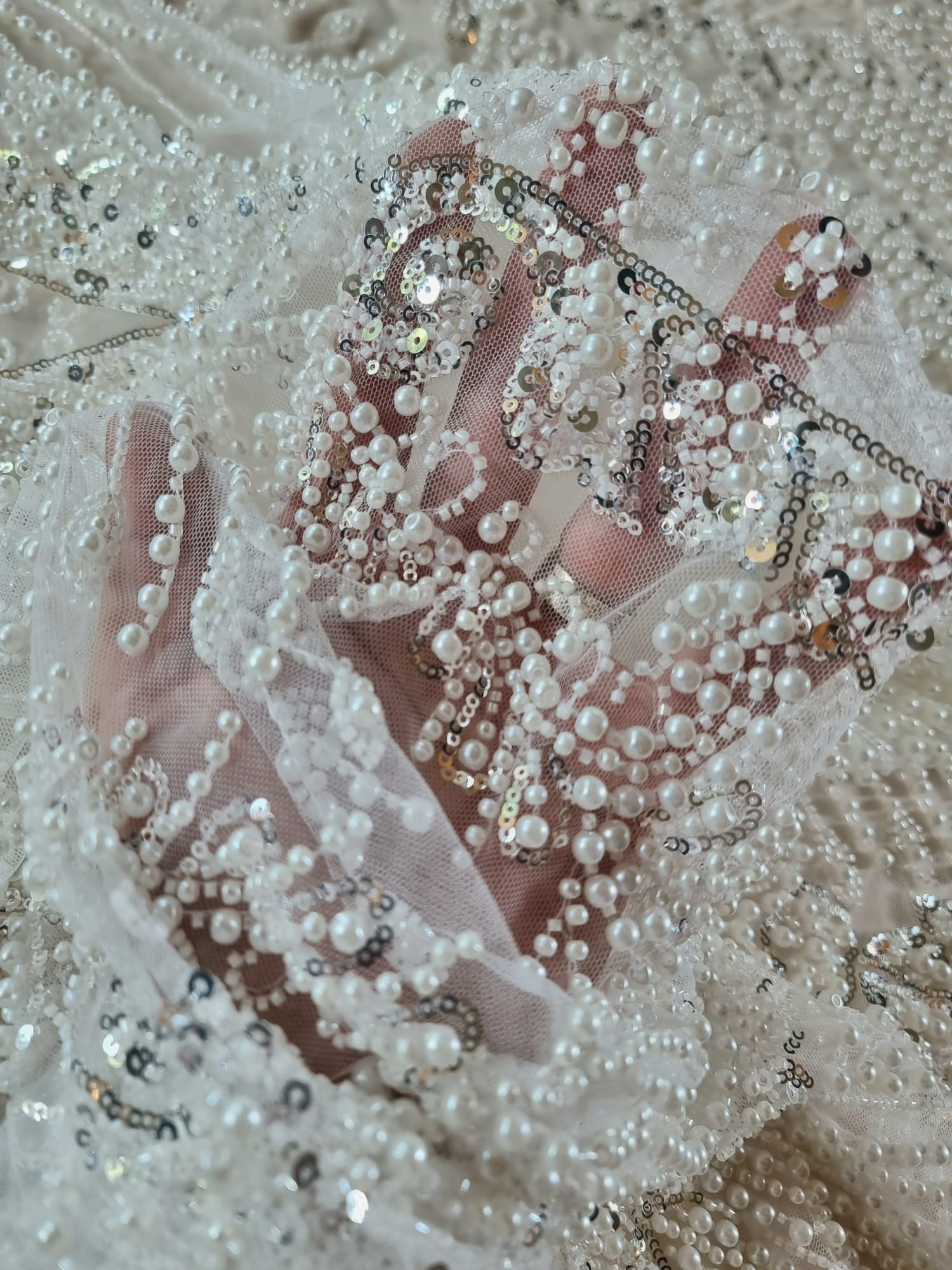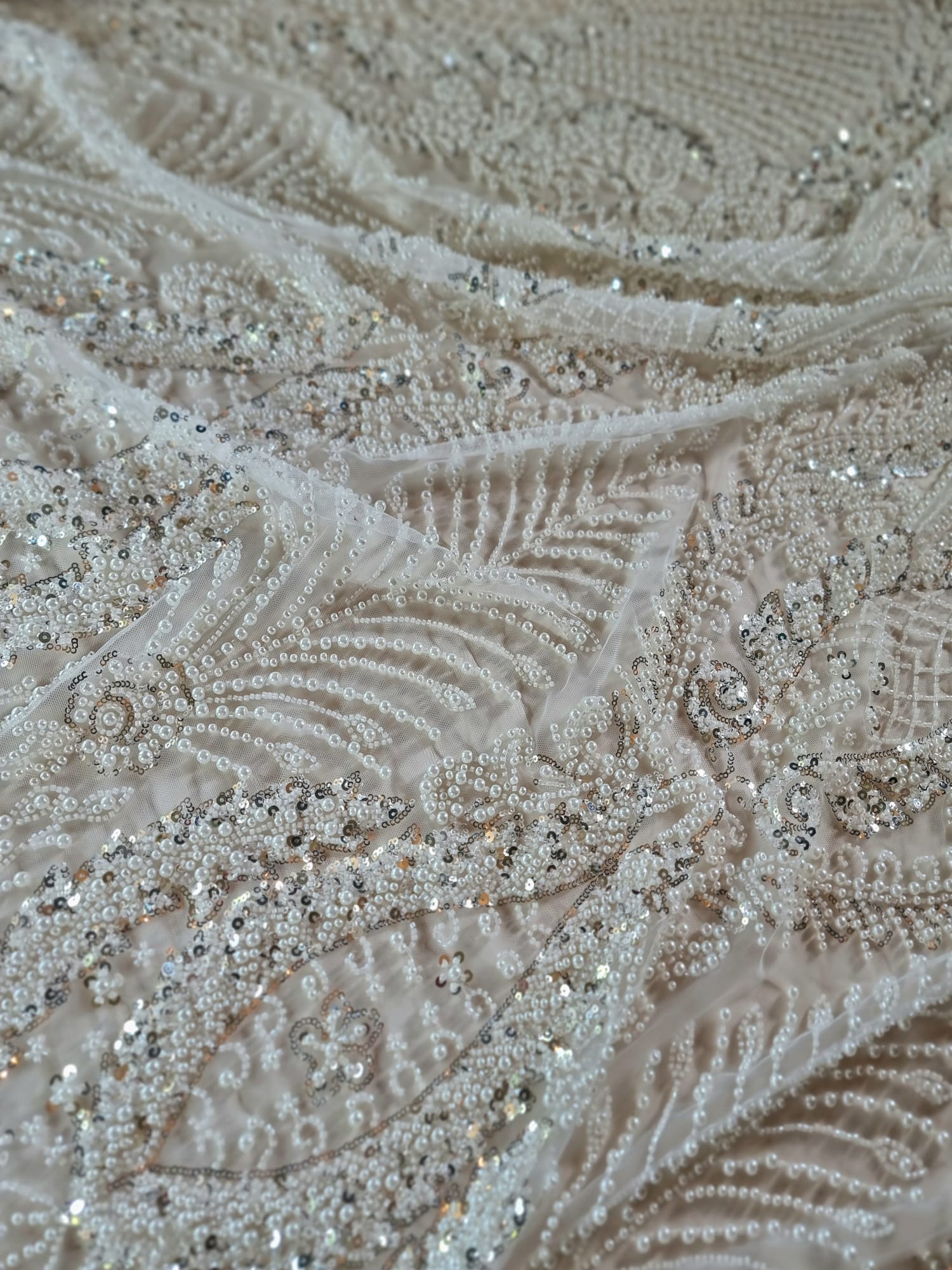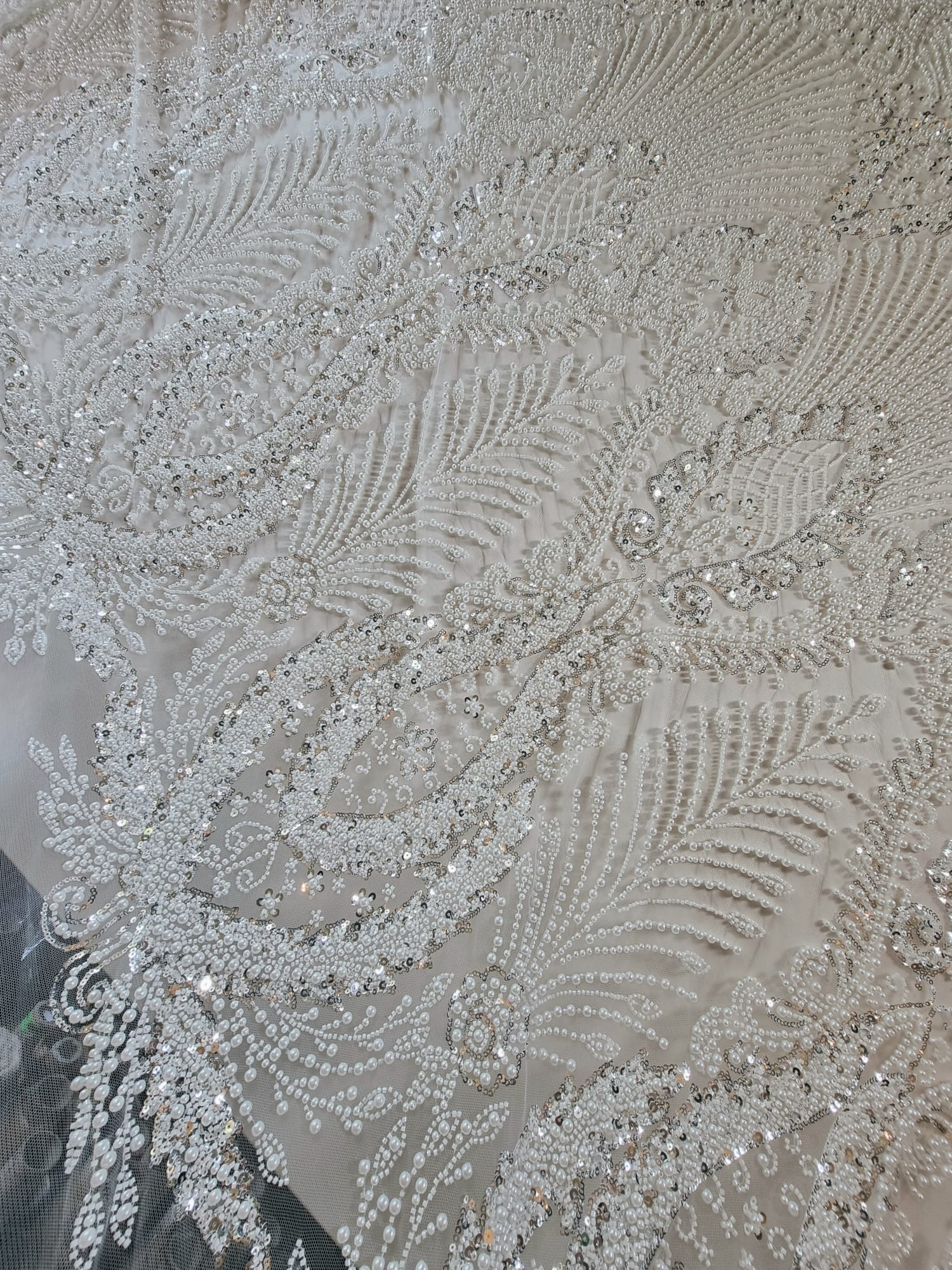 Tesatura cu broderie bogată cu perle, mărgele și paiete pe suport de tulle, Alb