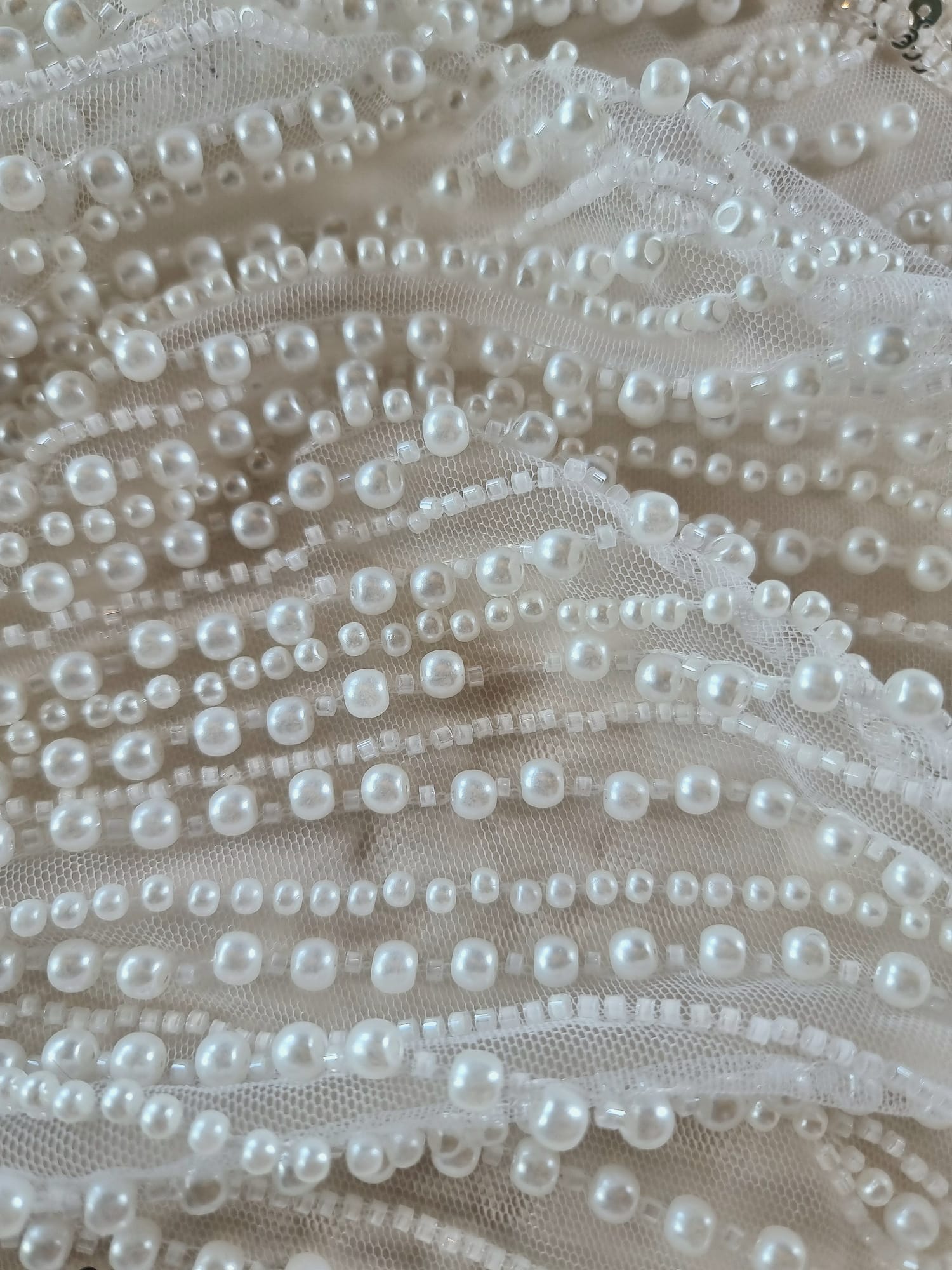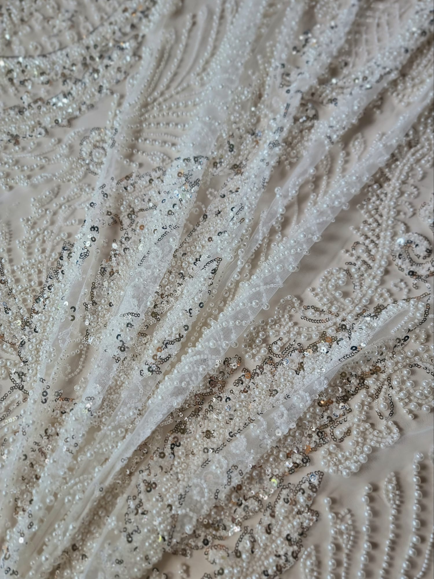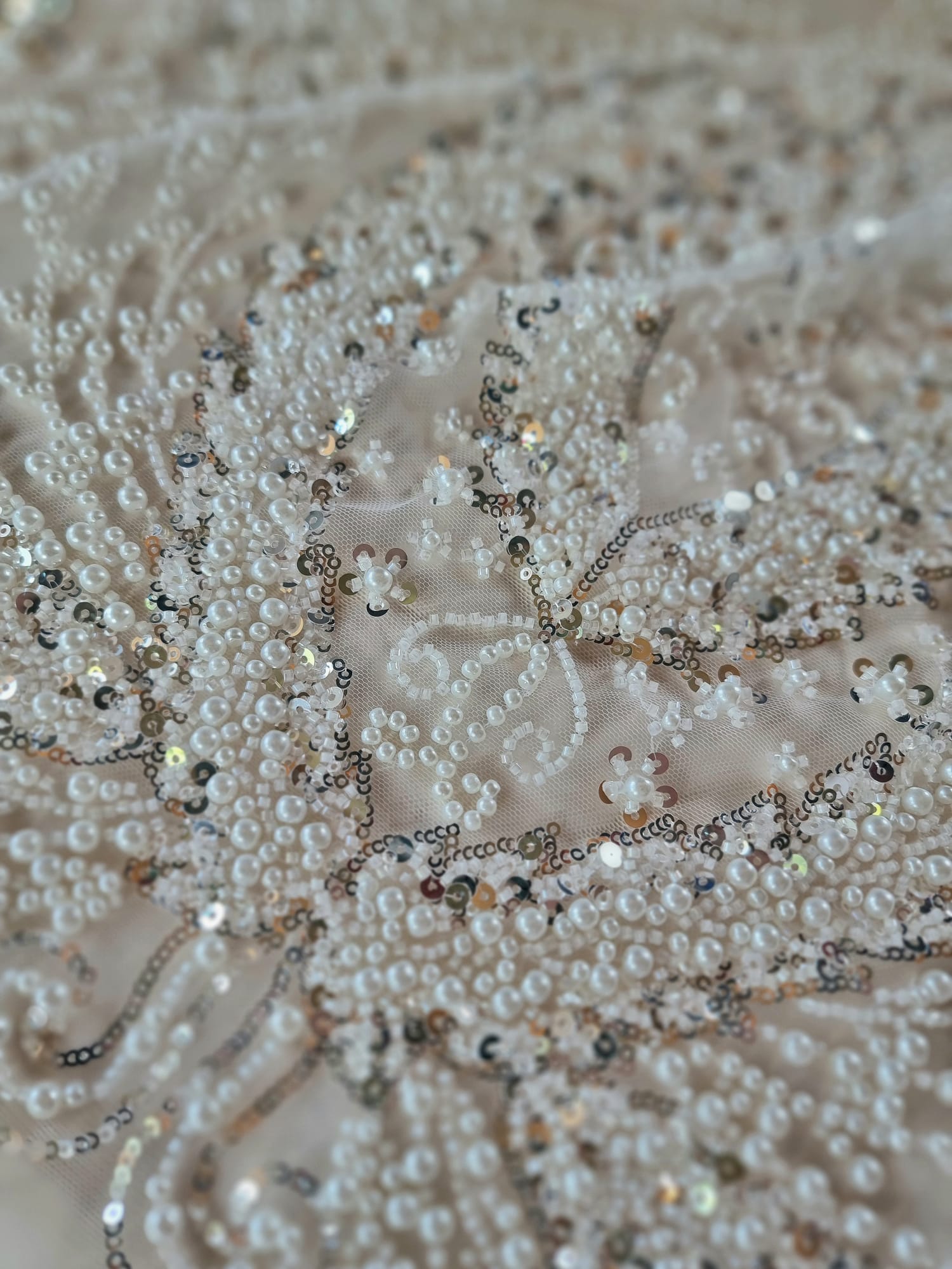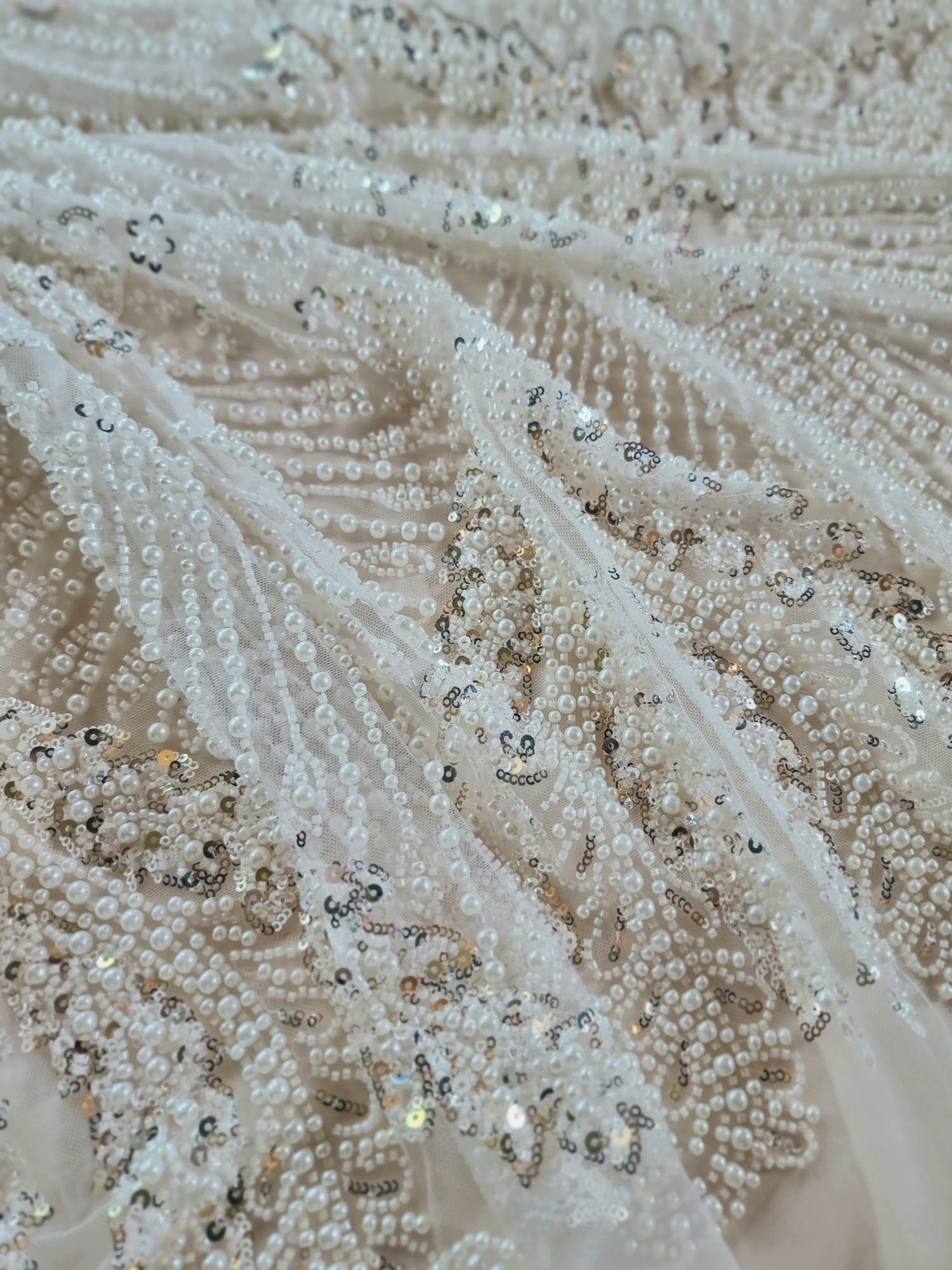 Tesatura cu broderie bogată cu perle, mărgele și paiete pe suport de tulle, Alb