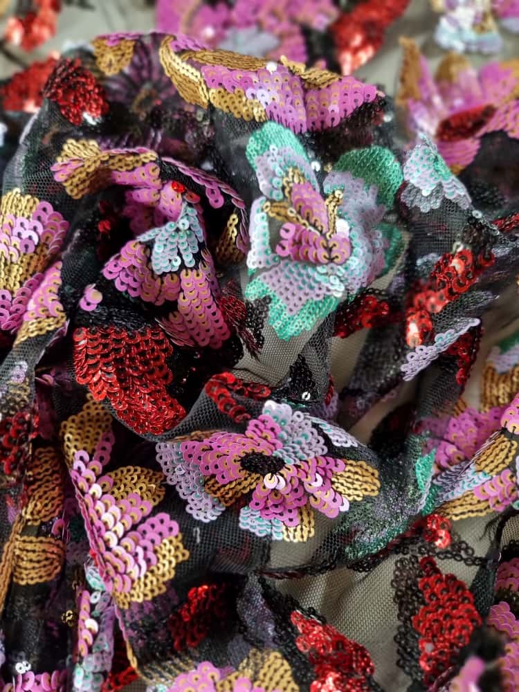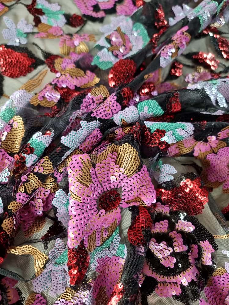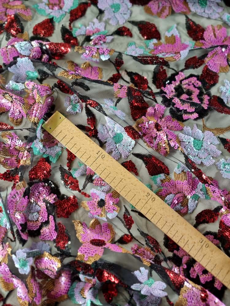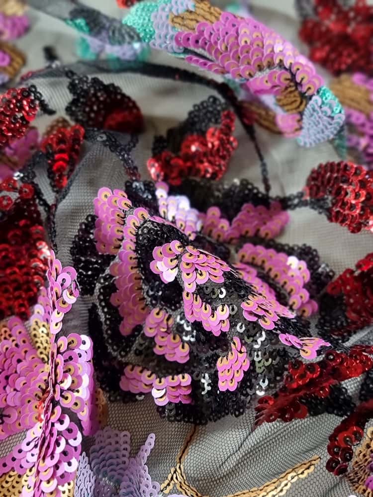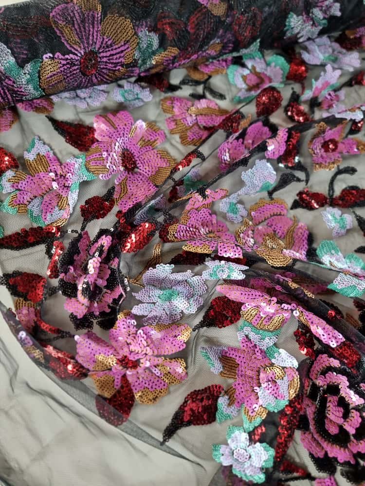 Tesatura cu broderie cu paiete pe suport de tulle Negru ușor elastic , brodat cu flori in nuanțe de Cyclamen / Rosu