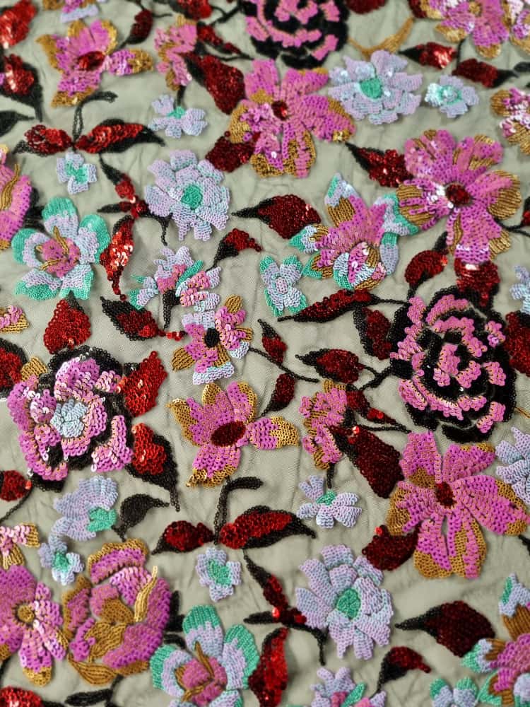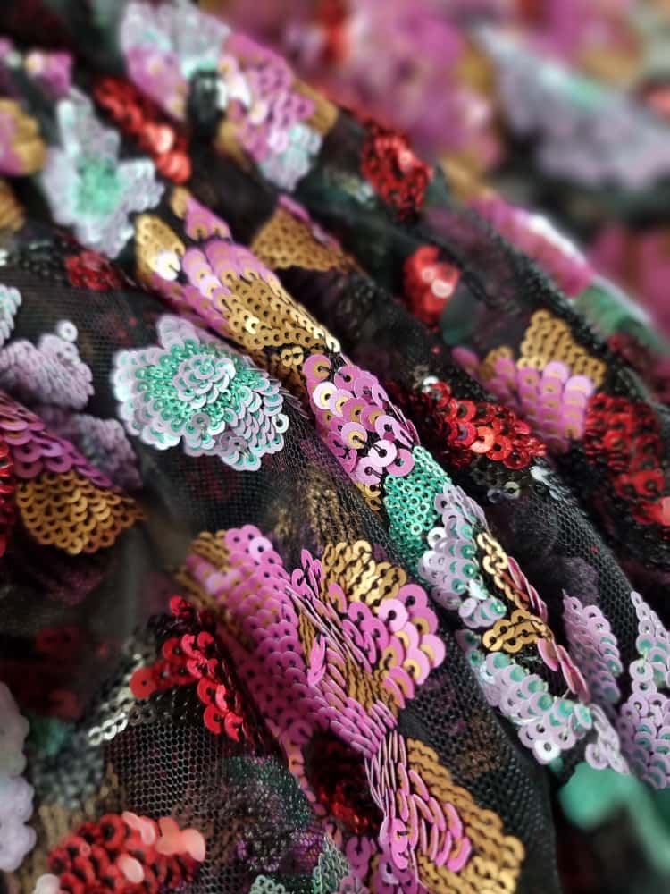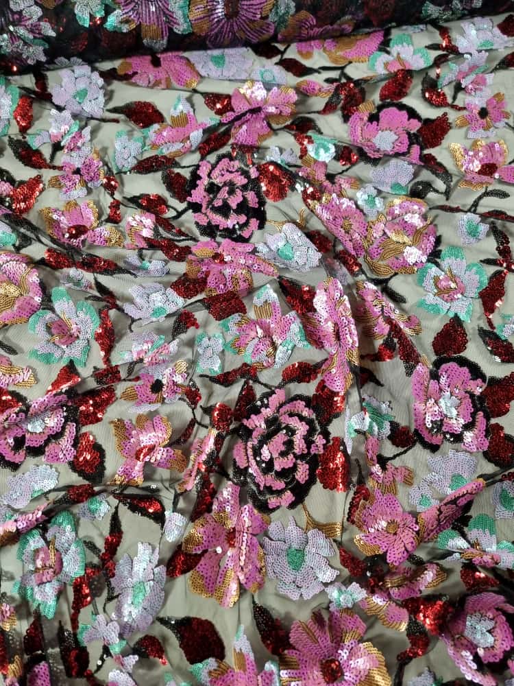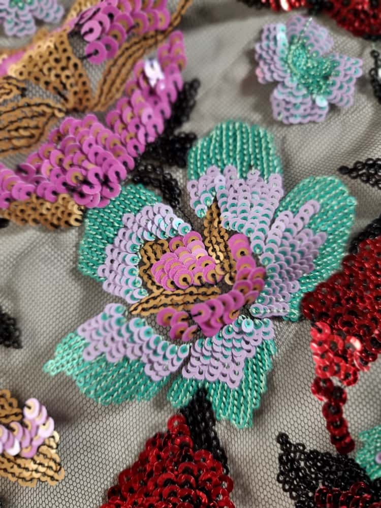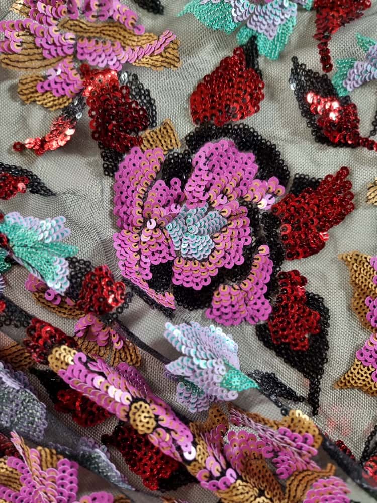 Tesatura cu broderie cu paiete pe suport de tulle Negru ușor elastic , brodat cu flori in nuanțe de Cyclamen / Rosu