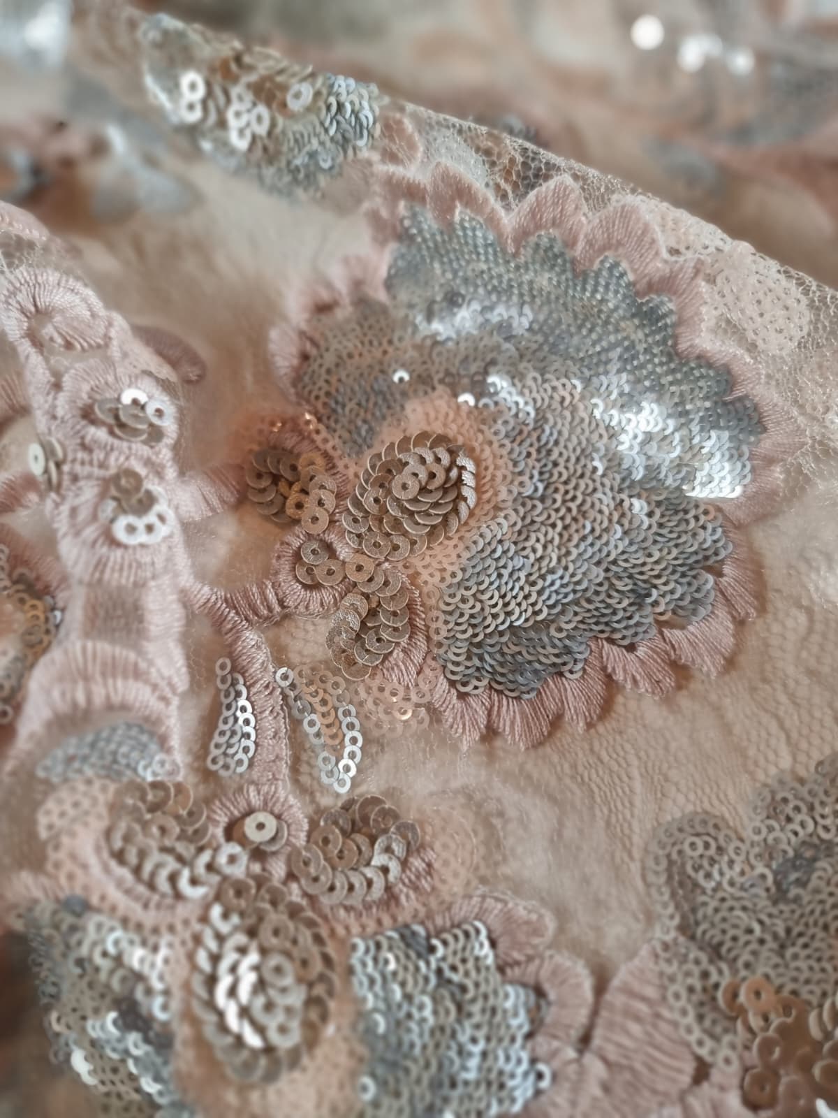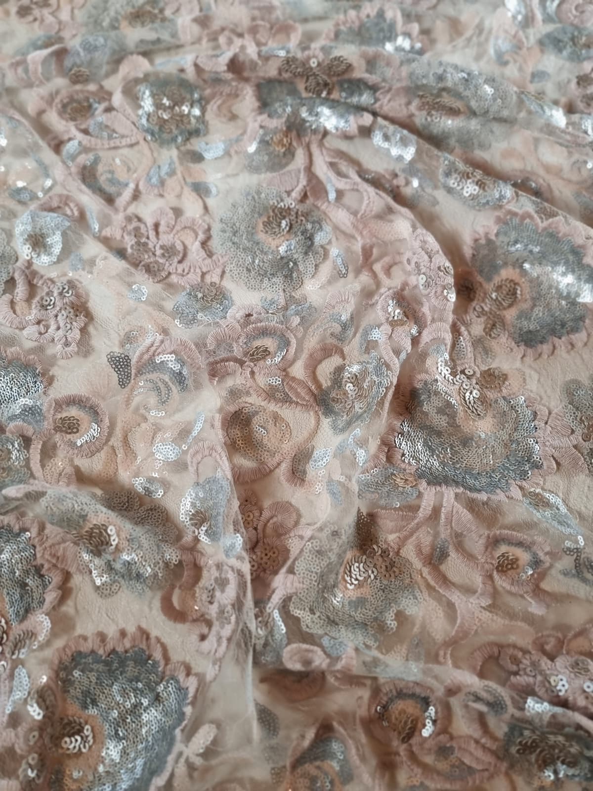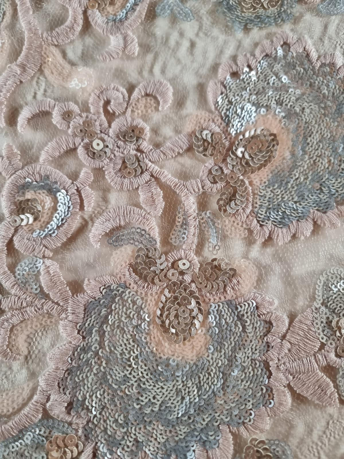 Tesatura cu Broderie Roz vintage si flori cu paiete, Argintiu Satinat