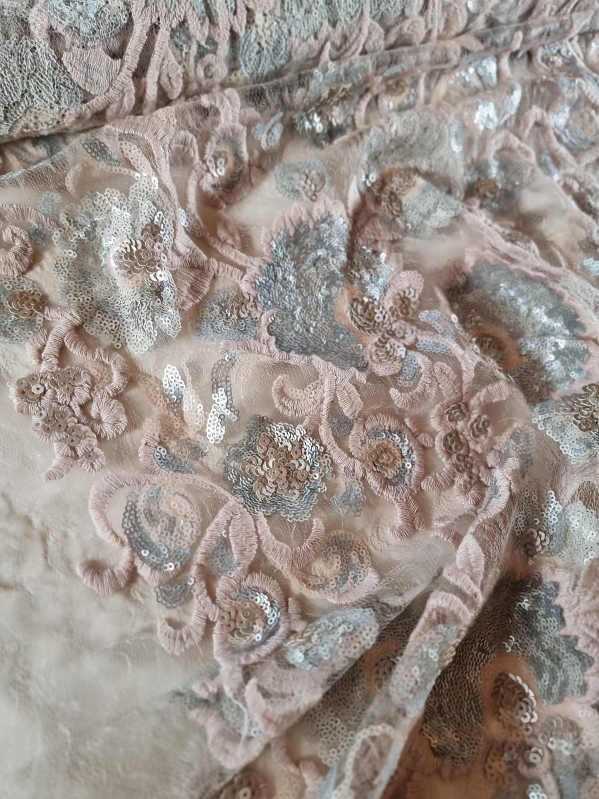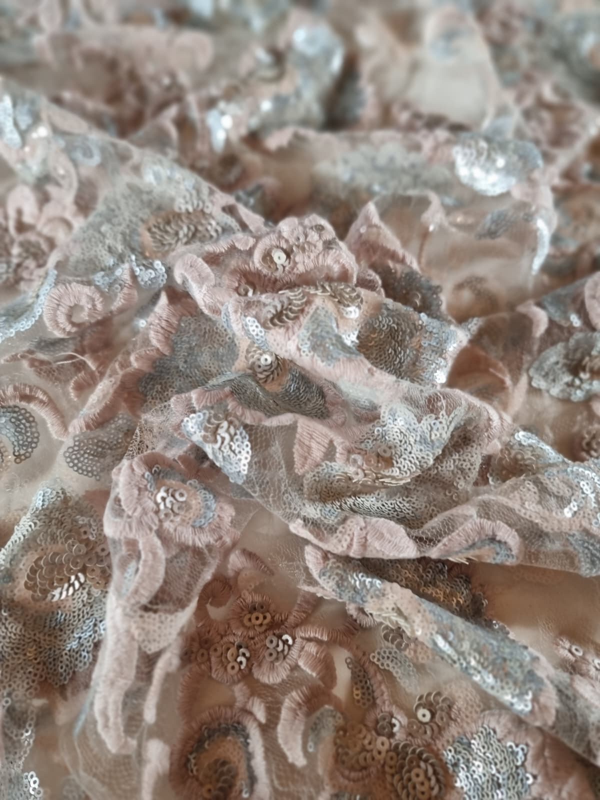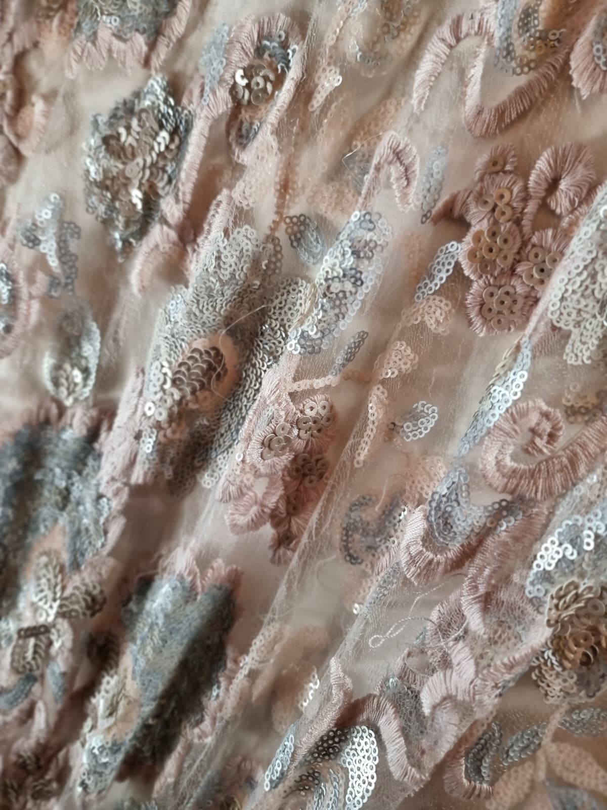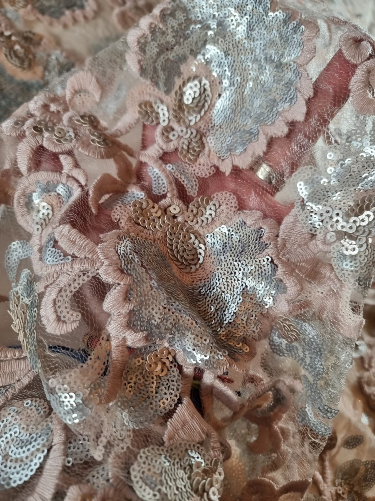 Tesatura cu Broderie Roz vintage si flori cu paiete, Argintiu Satinat