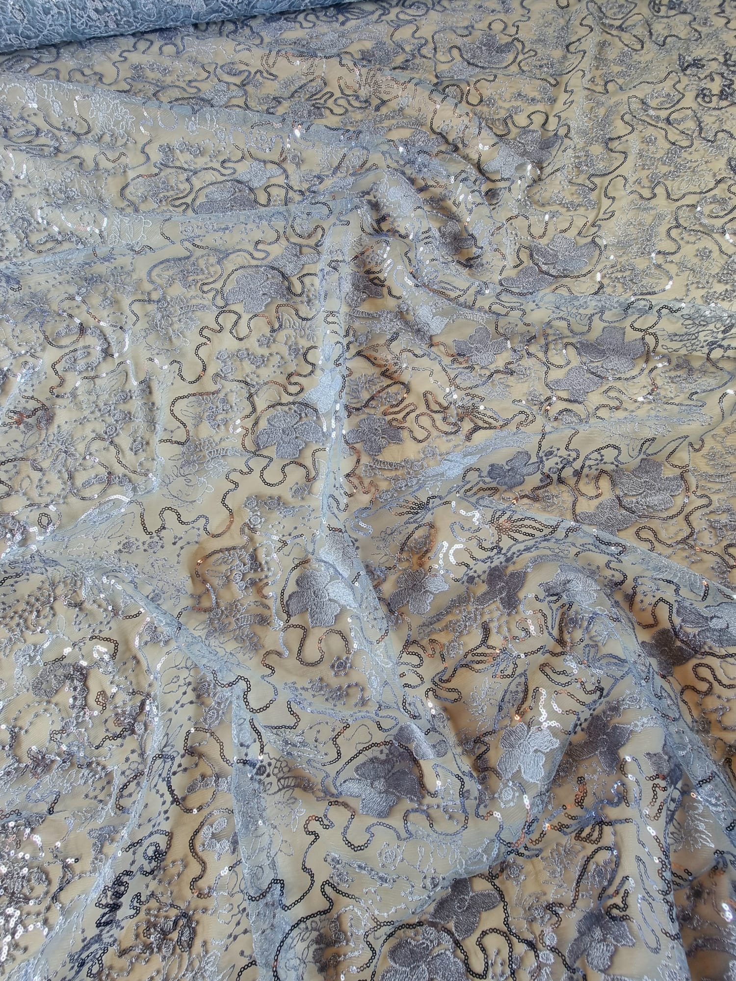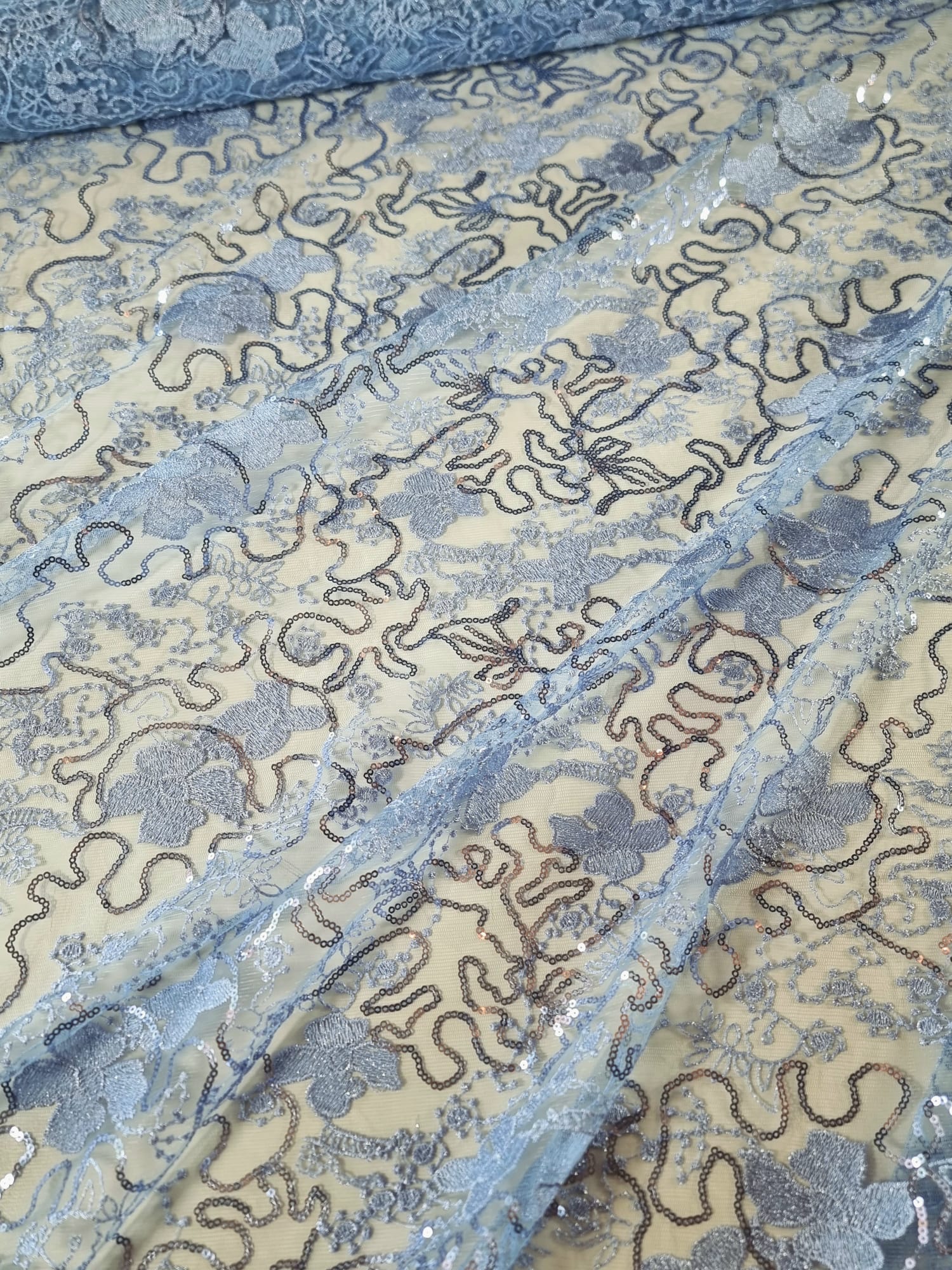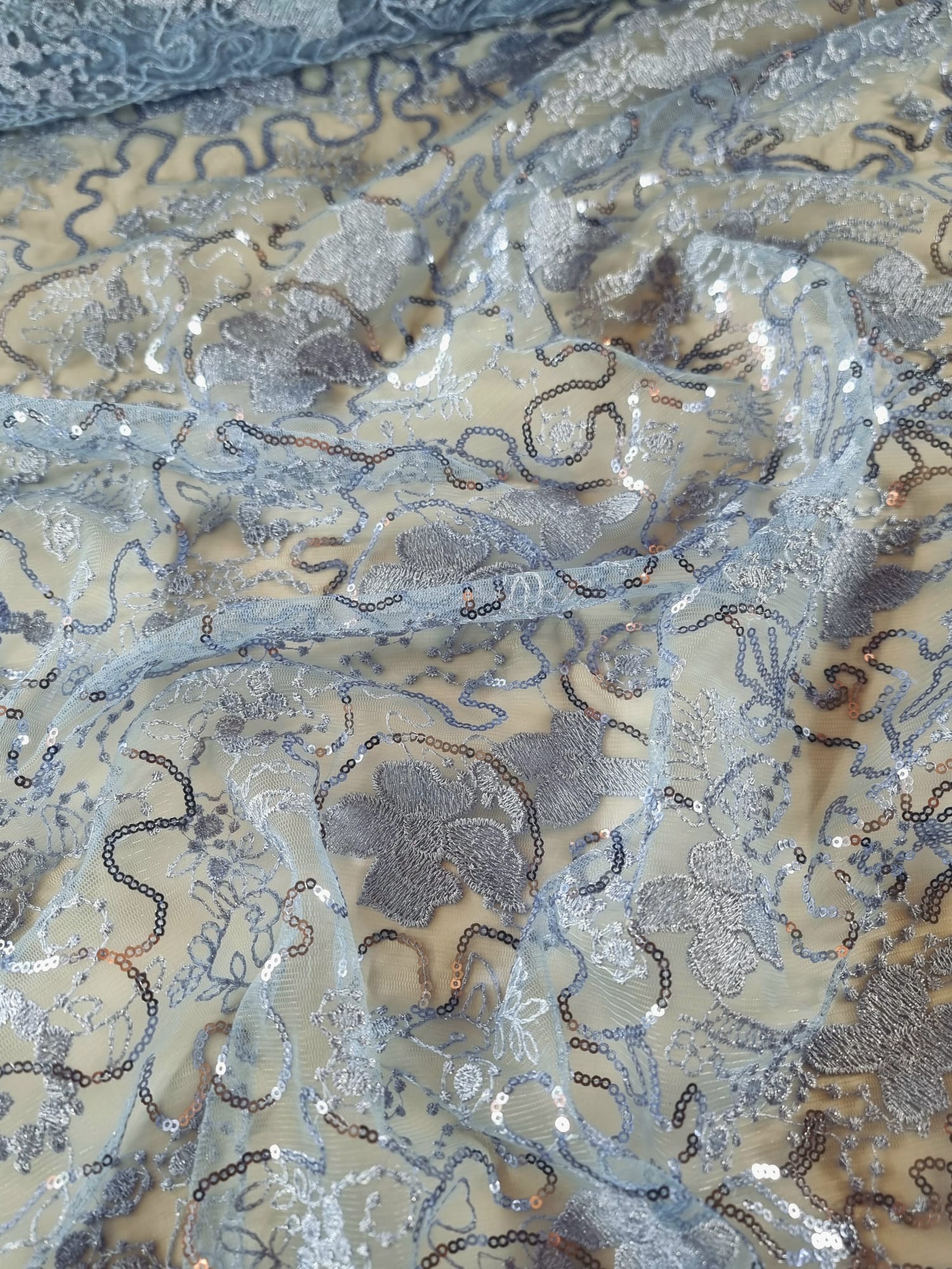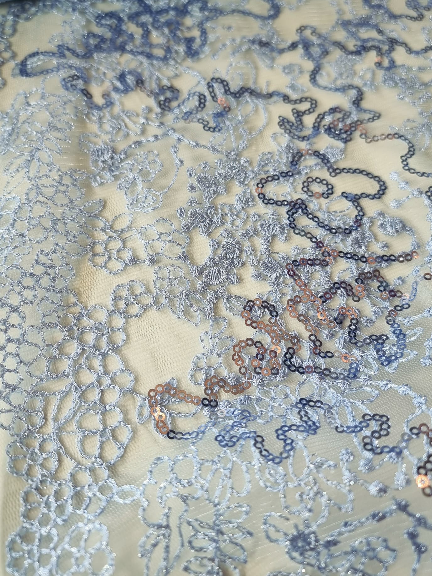 Tesatura cu broderie si aplicații cu micropaiete – Model floral cu margini finite, Bleu