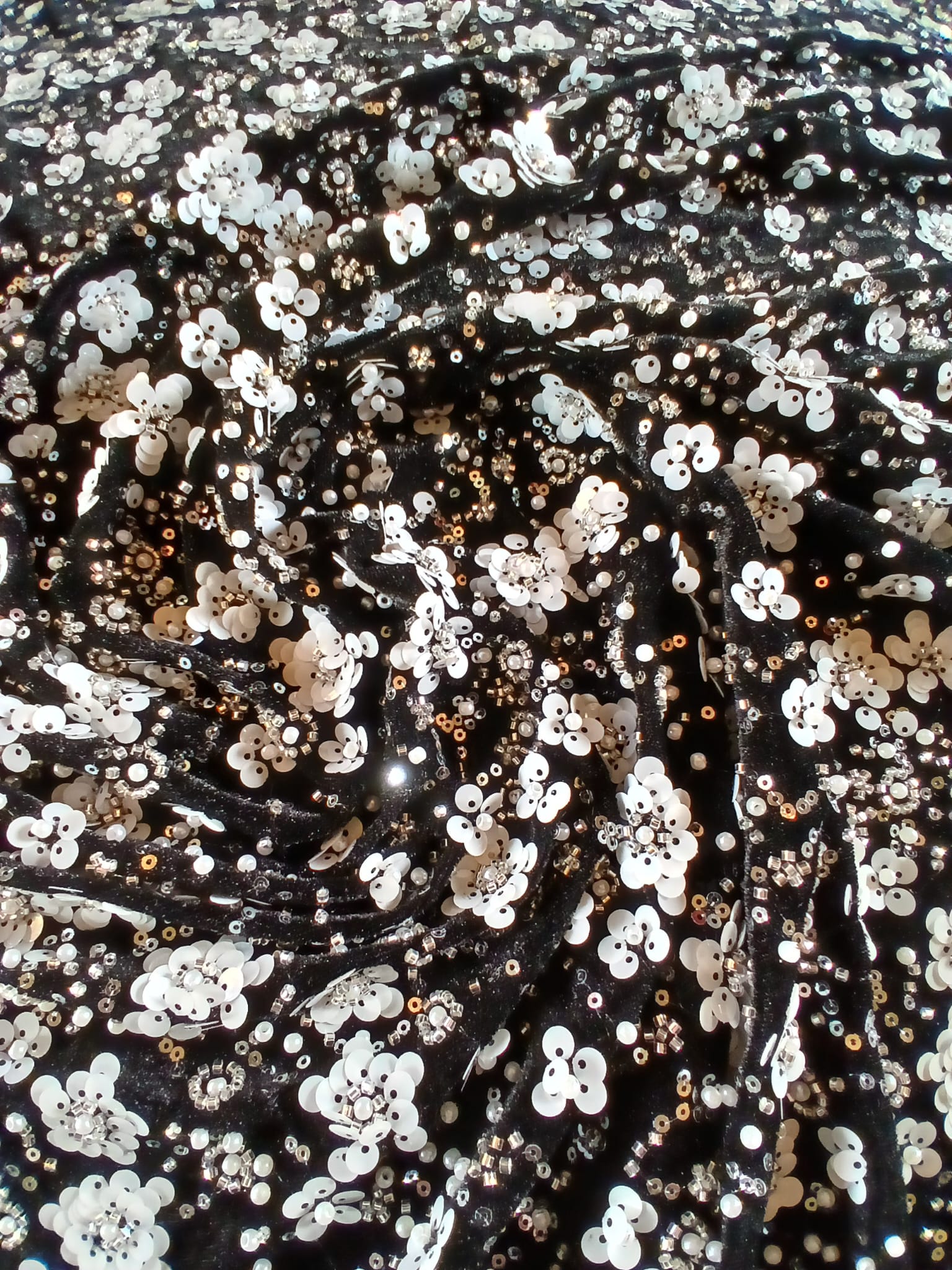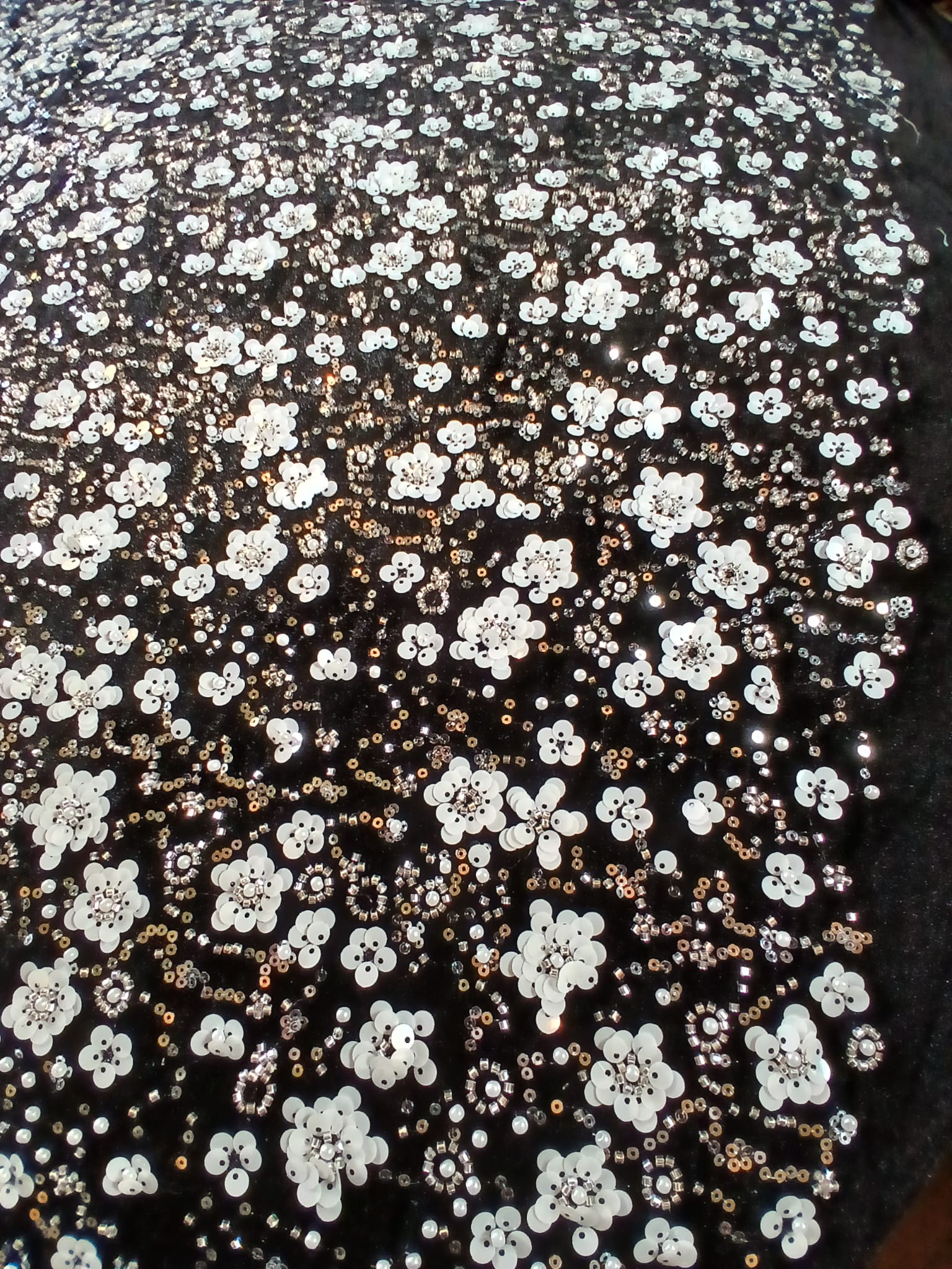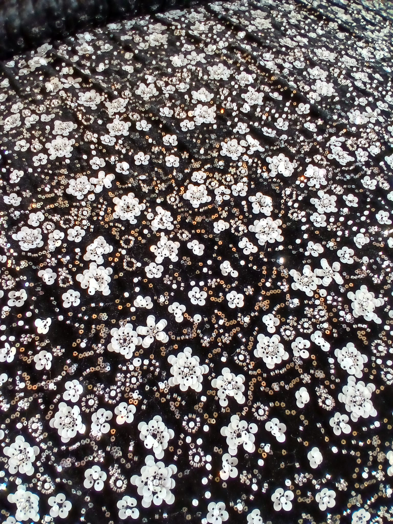 Tesatura cu broderie si paiete pe suport de catifea, Negru / Alb / Argintiu