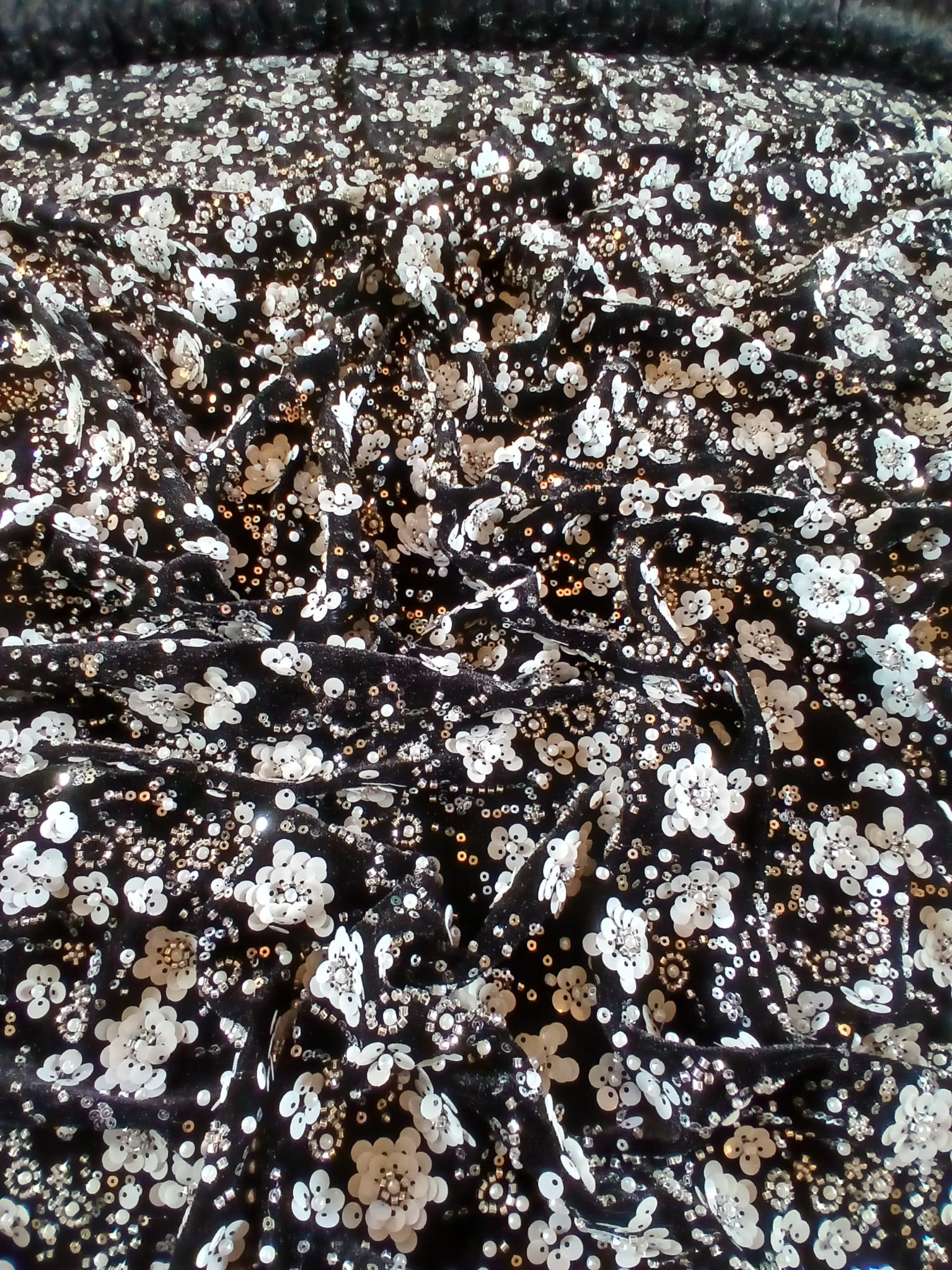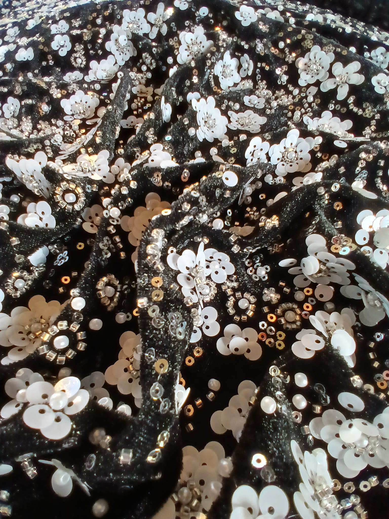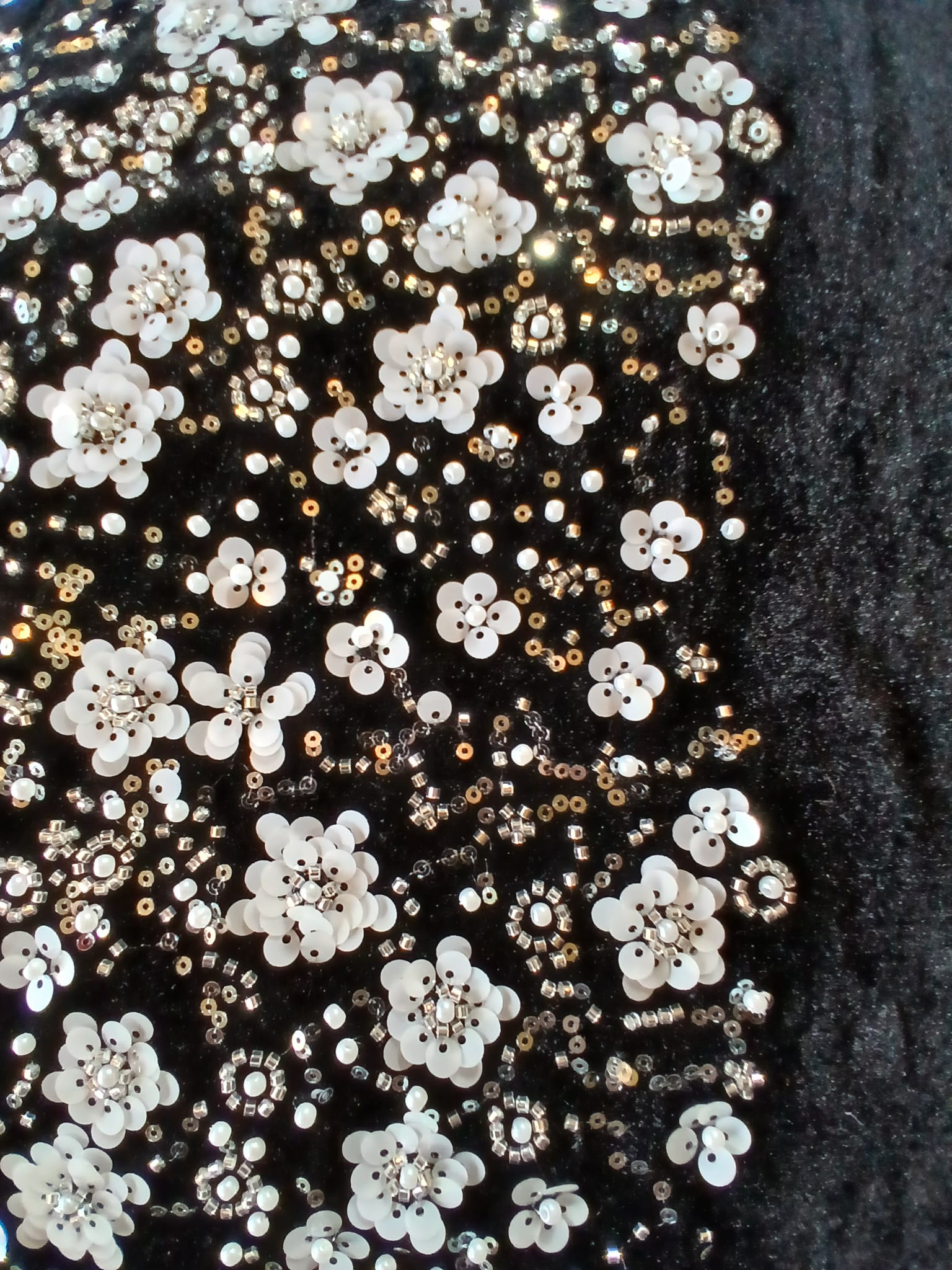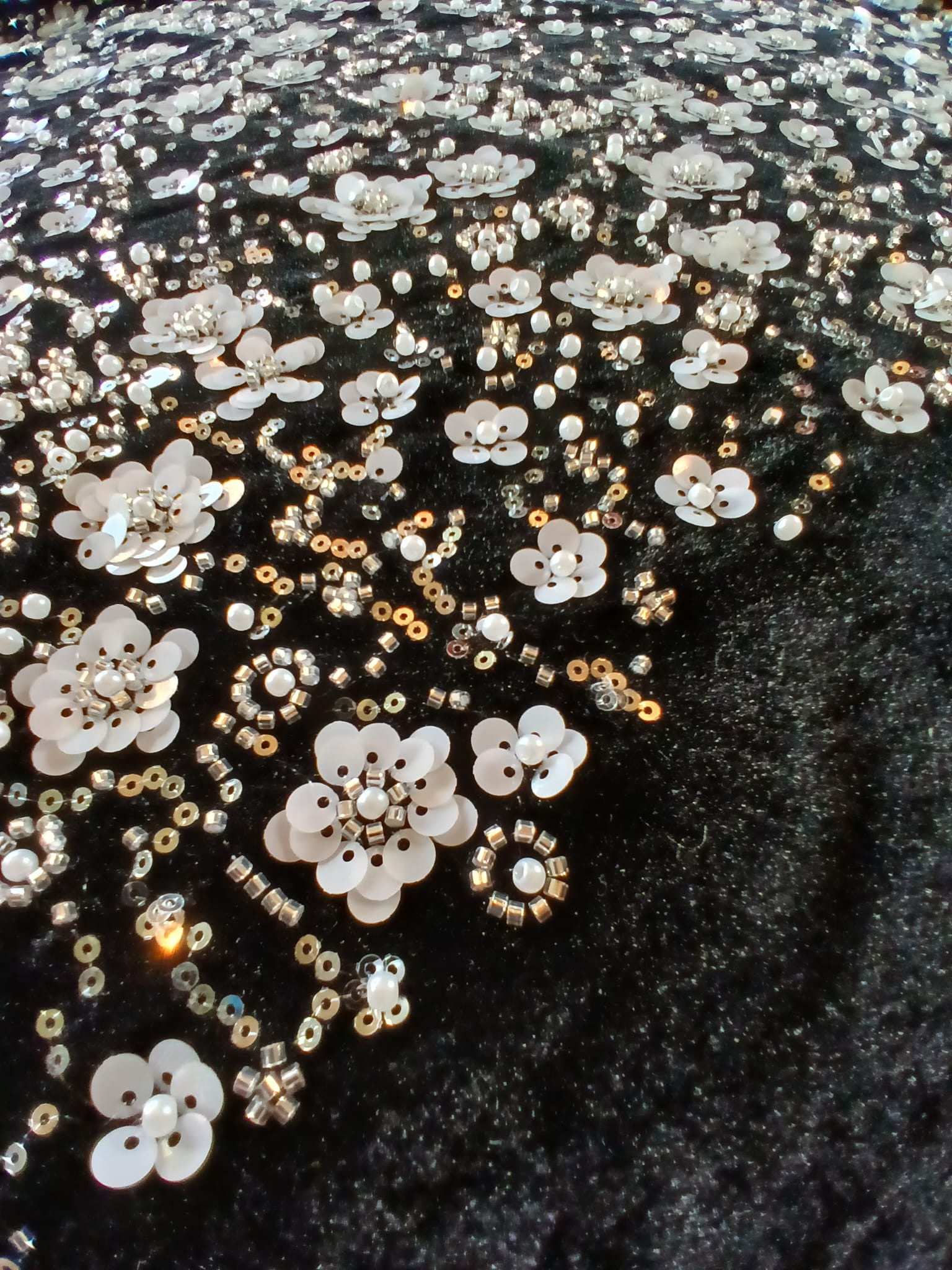 Tesatura cu broderie si paiete pe suport de catifea, Negru / Alb / Argintiu