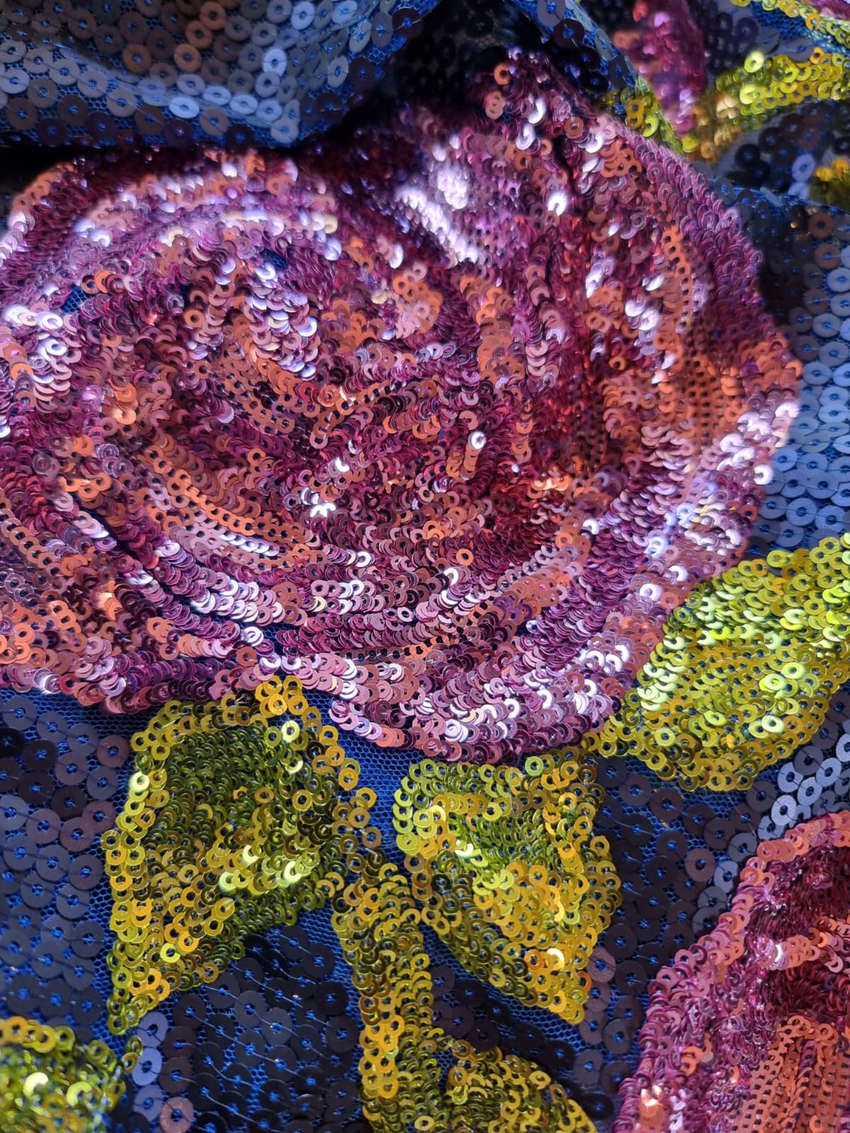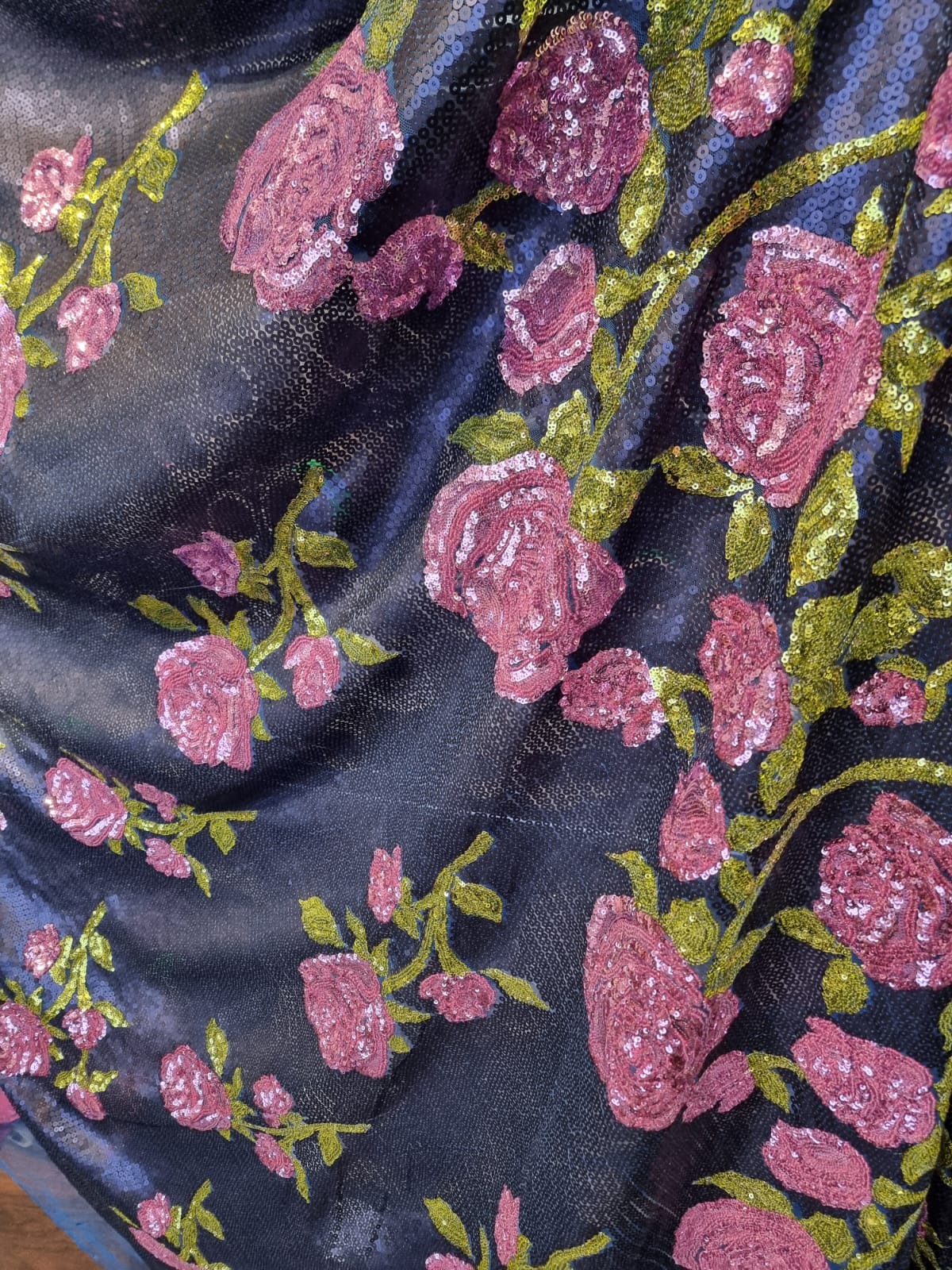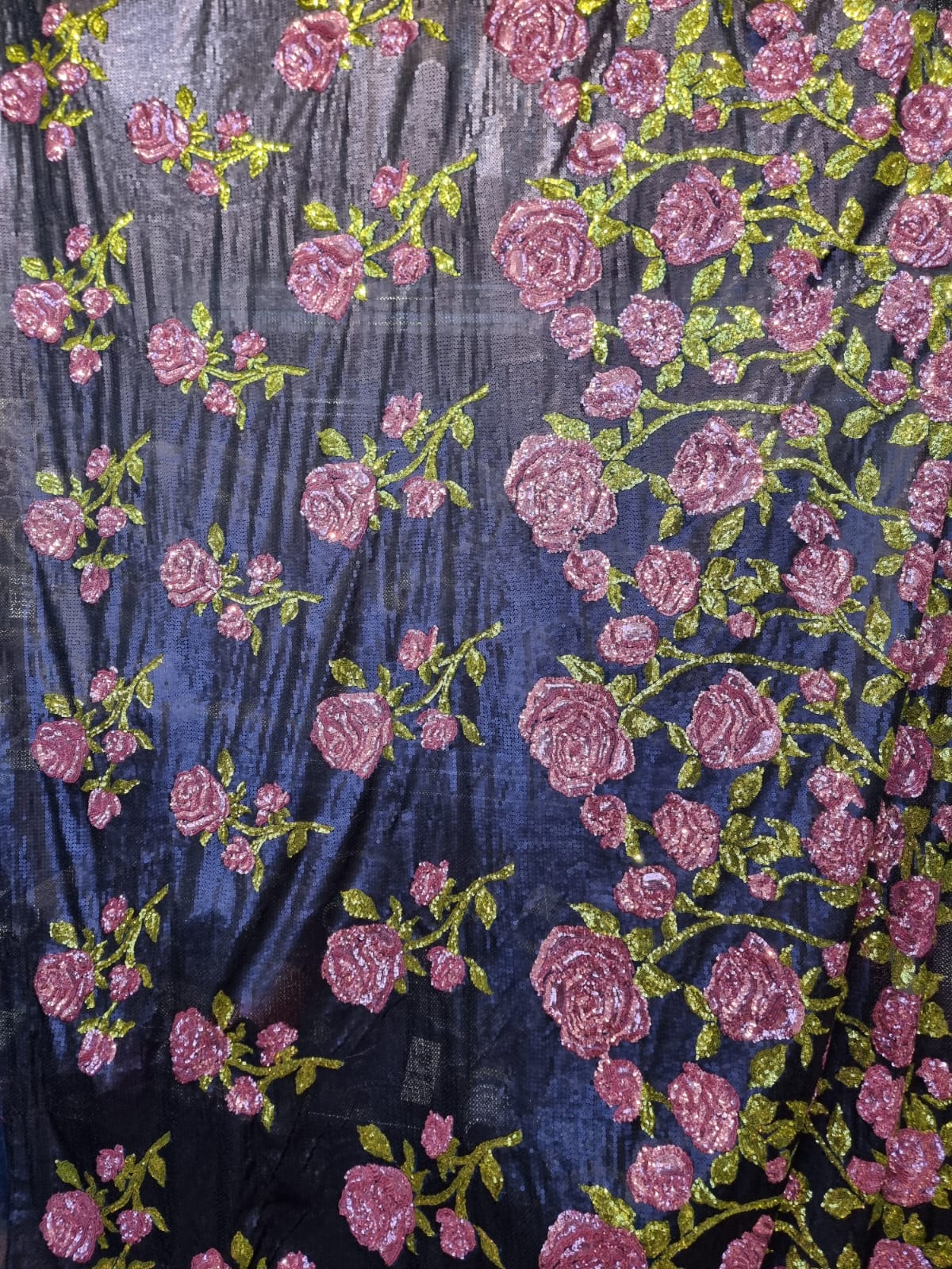 Tesatura cu broderie si paiete pe toată suprafața, pe suport de tulle elastic si bordură laterală – Trandafiri roz pe fond Bleumarin, mat