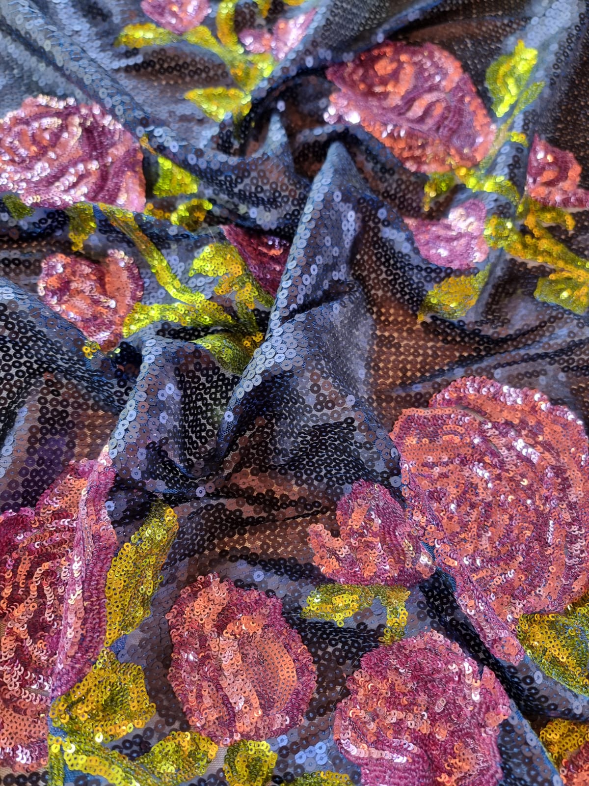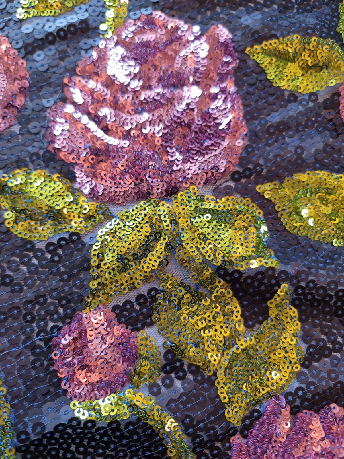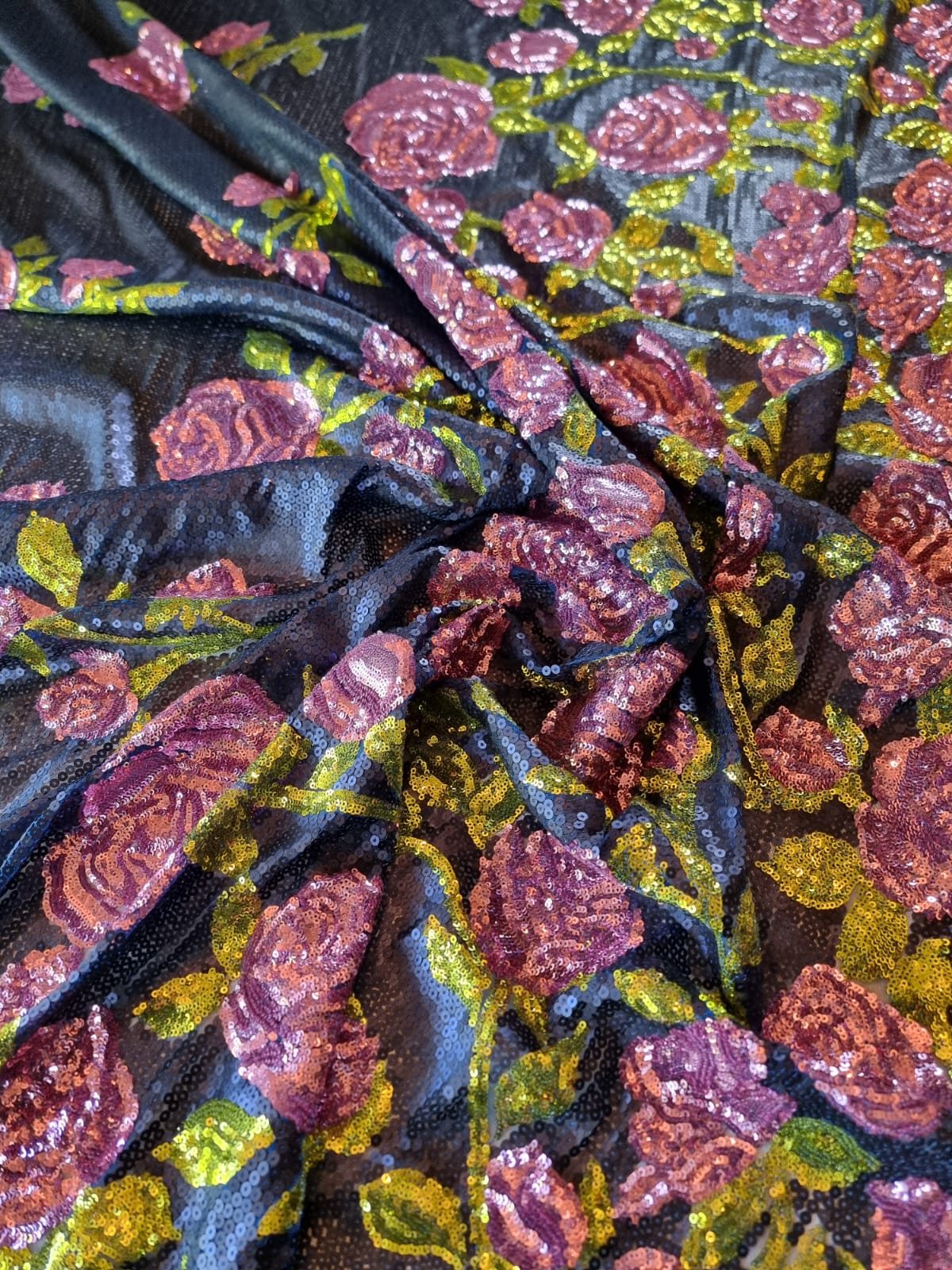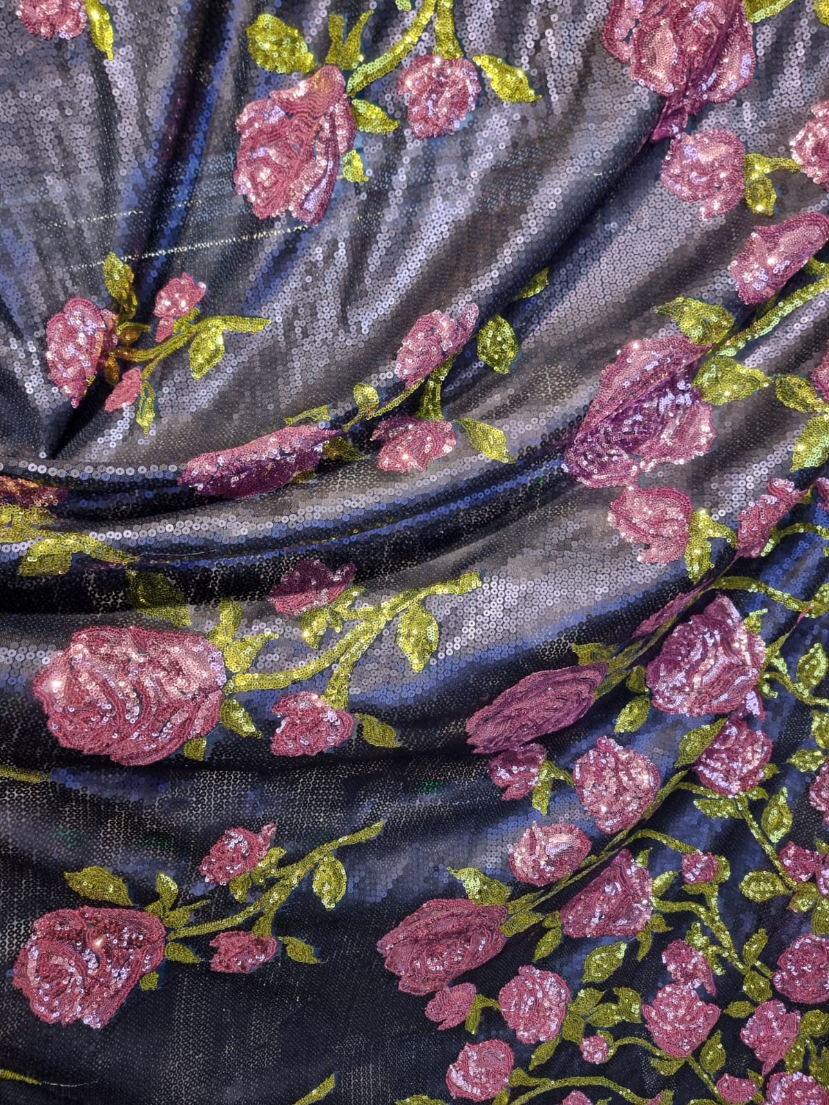Tesatura cu broderie si paiete pe toată suprafața, pe suport de tulle elastic si bordură laterală – Trandafiri roz pe fond Bleumarin, mat