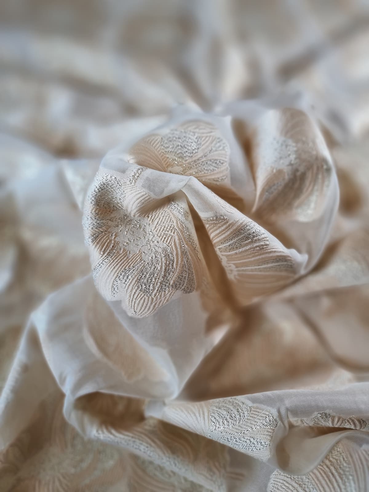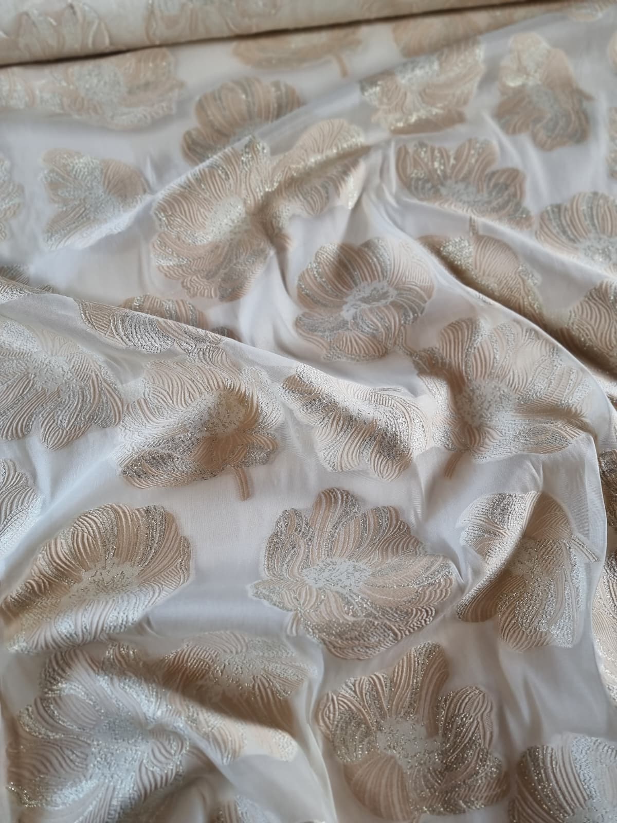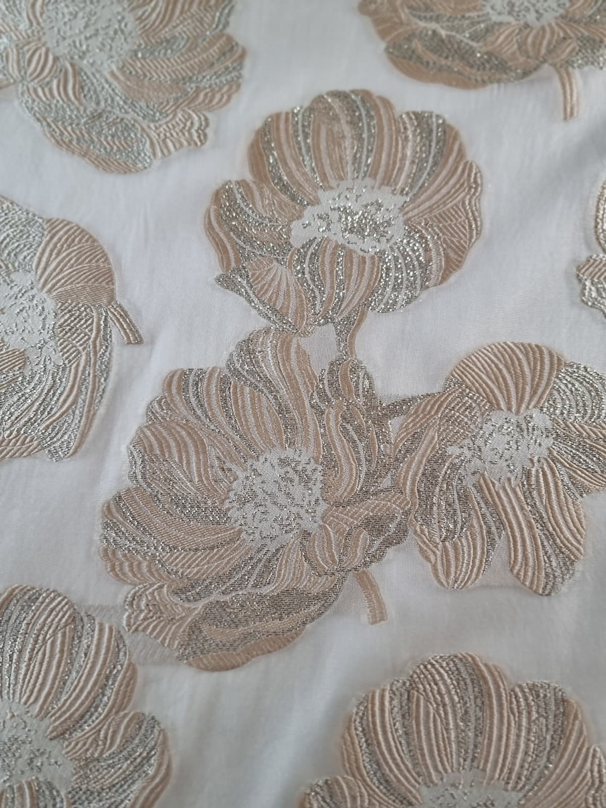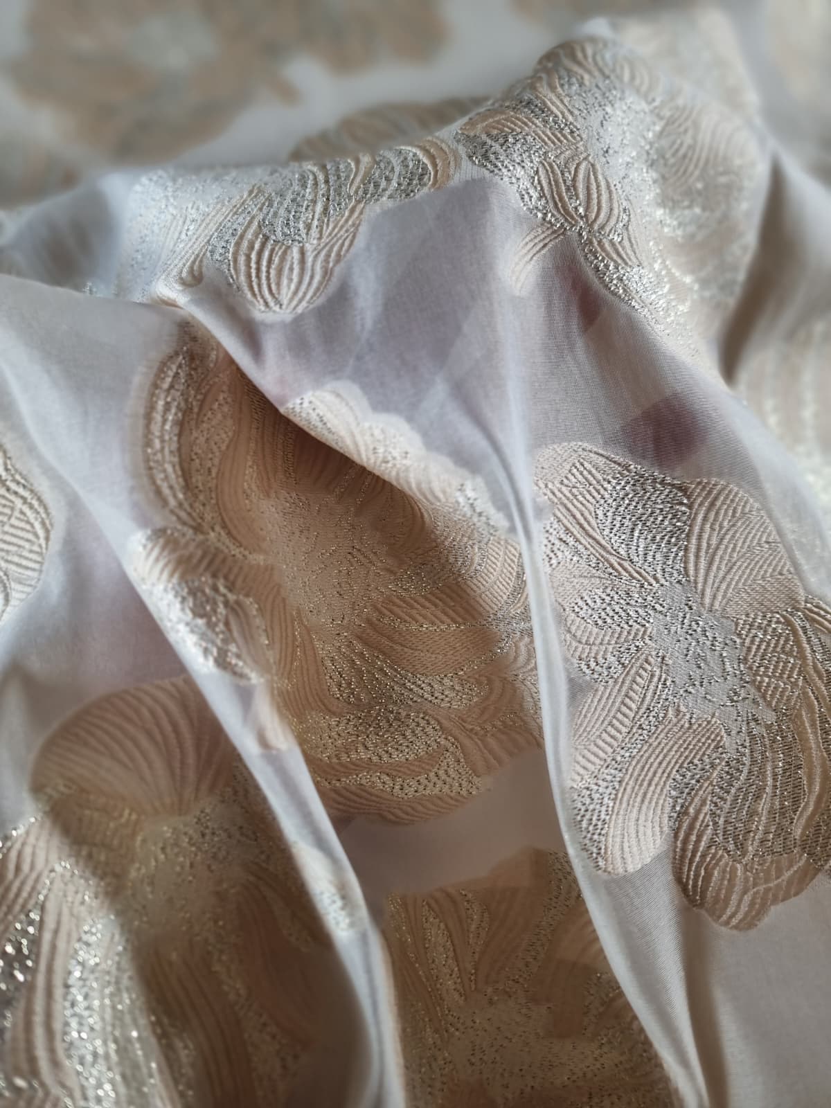 Tesatura cu matase naturala – Oraganza / Jacquard Devore – design floral, Ivoire / Auriu pastel