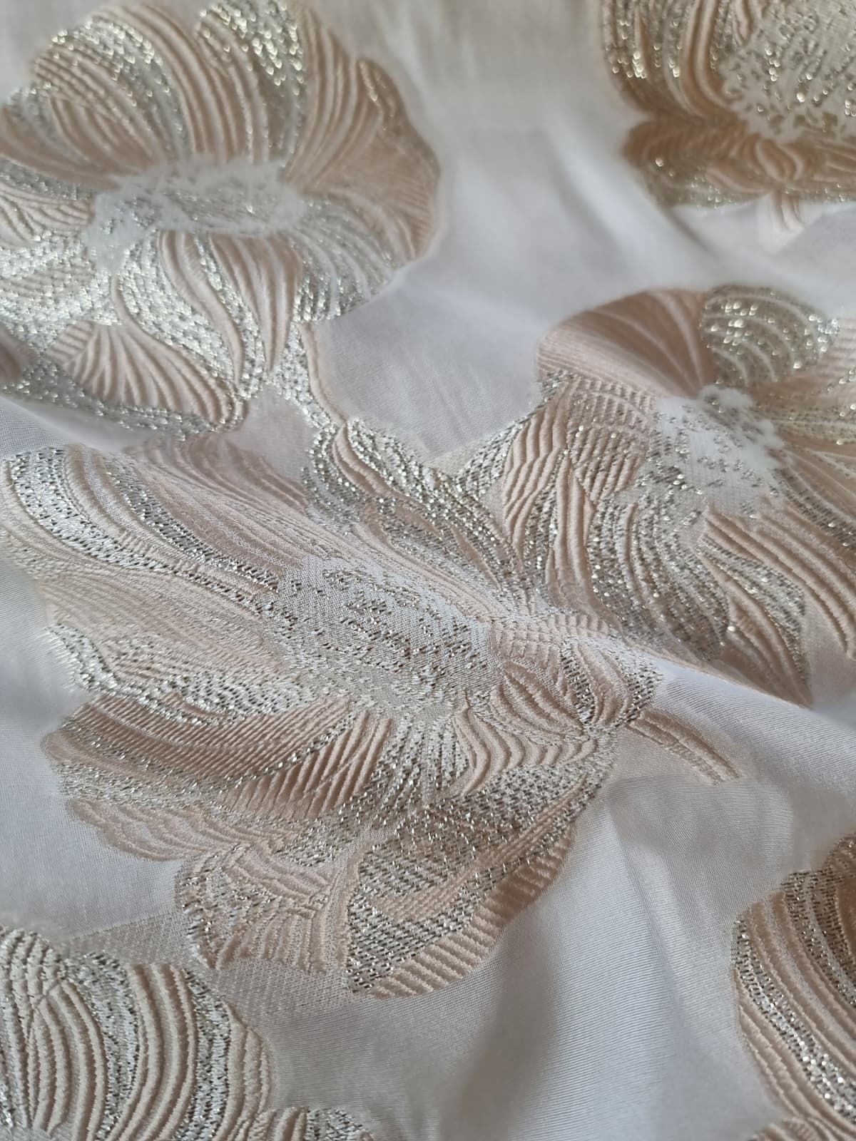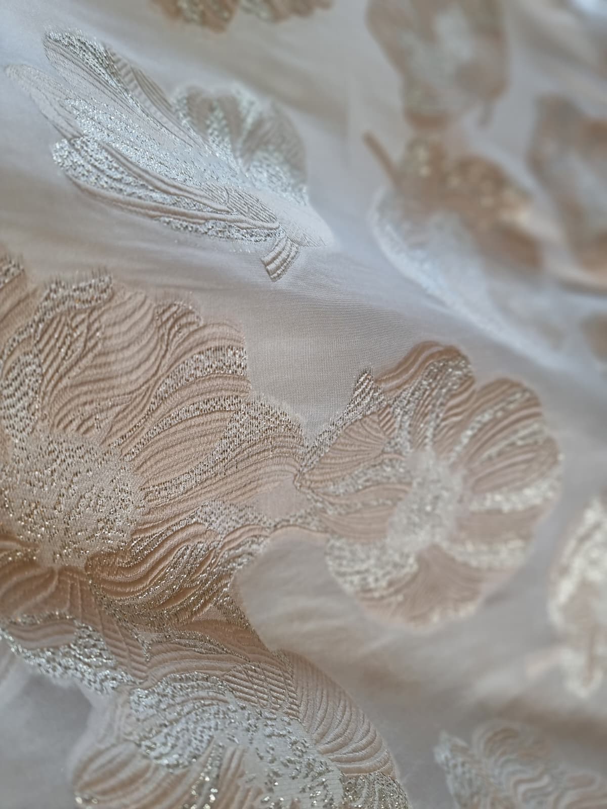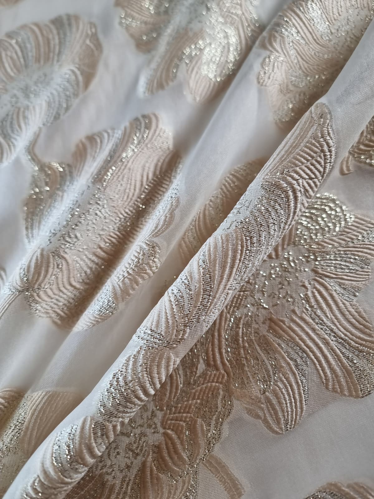 Tesatura cu matase naturala – Oraganza / Jacquard Devore – design floral, Ivoire / Auriu pastel