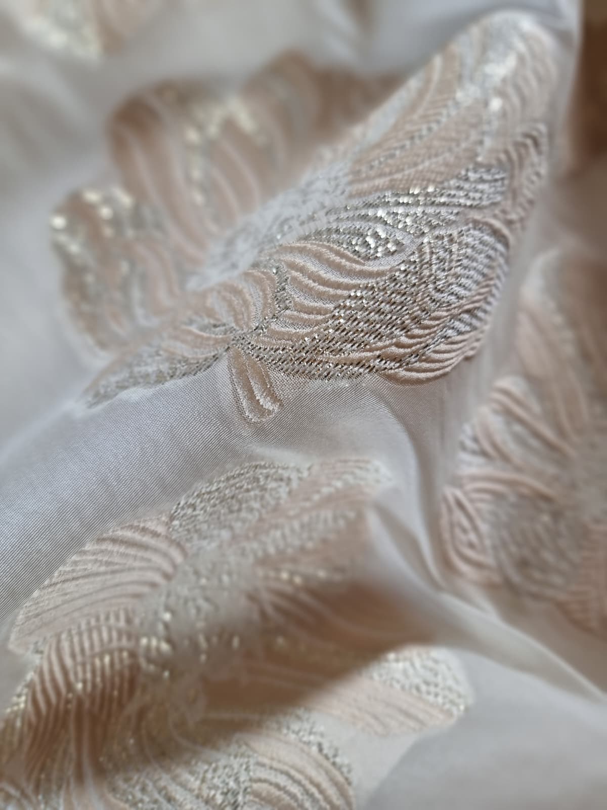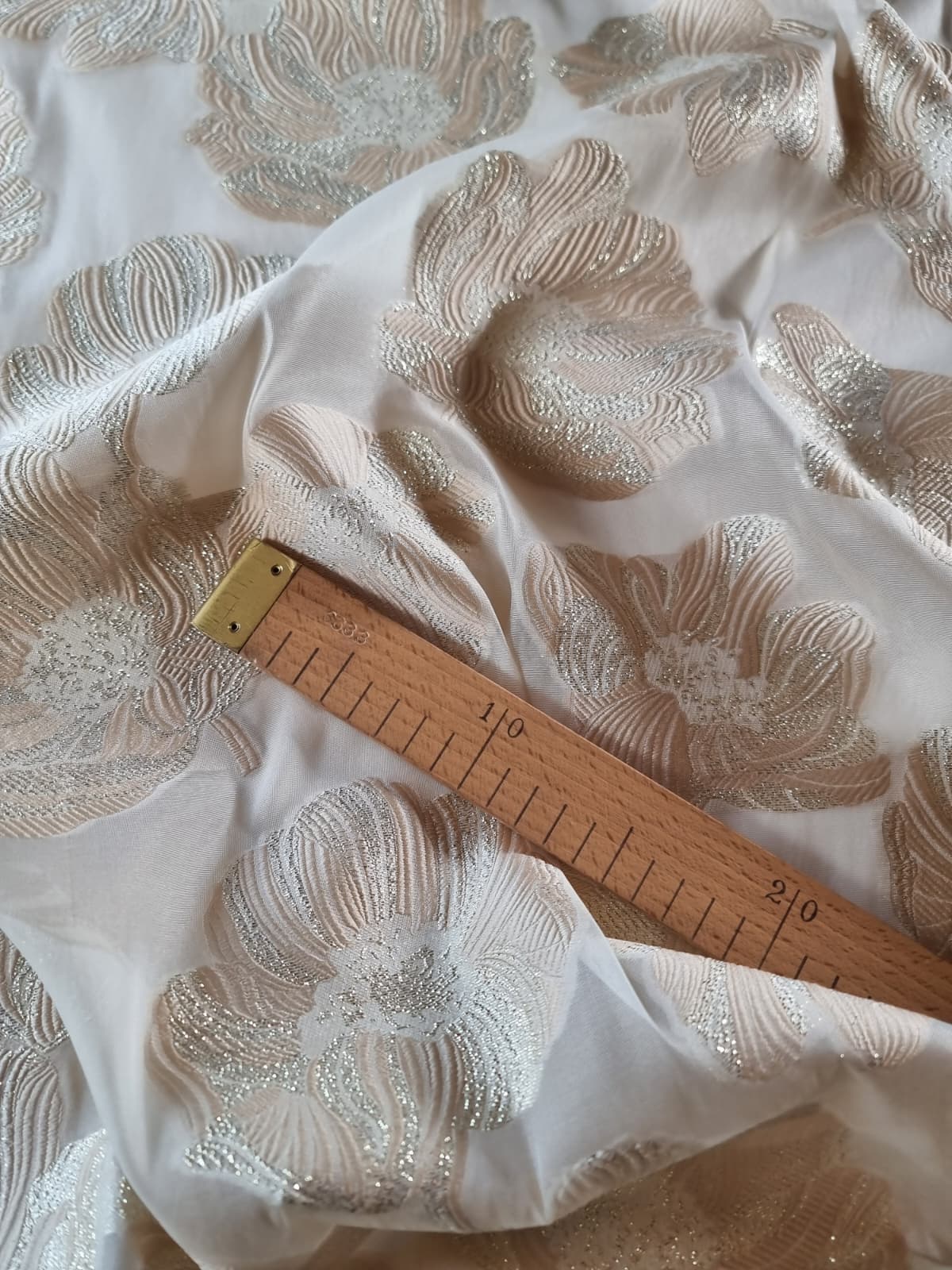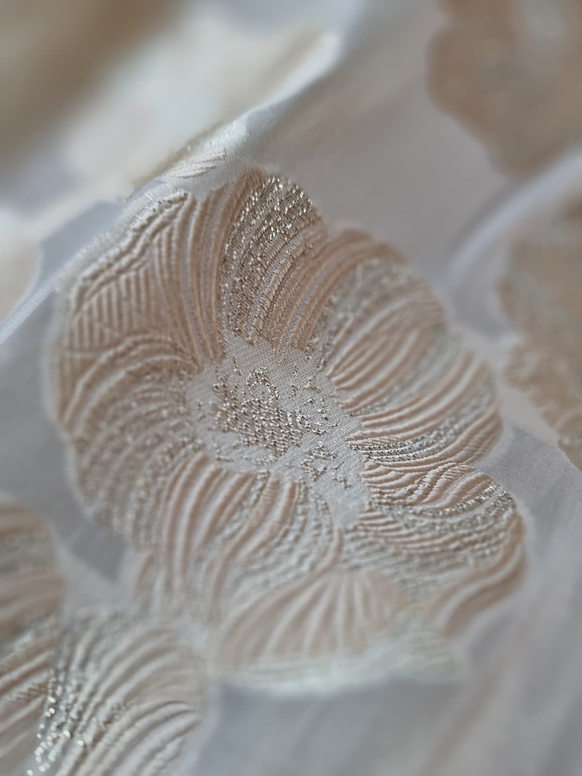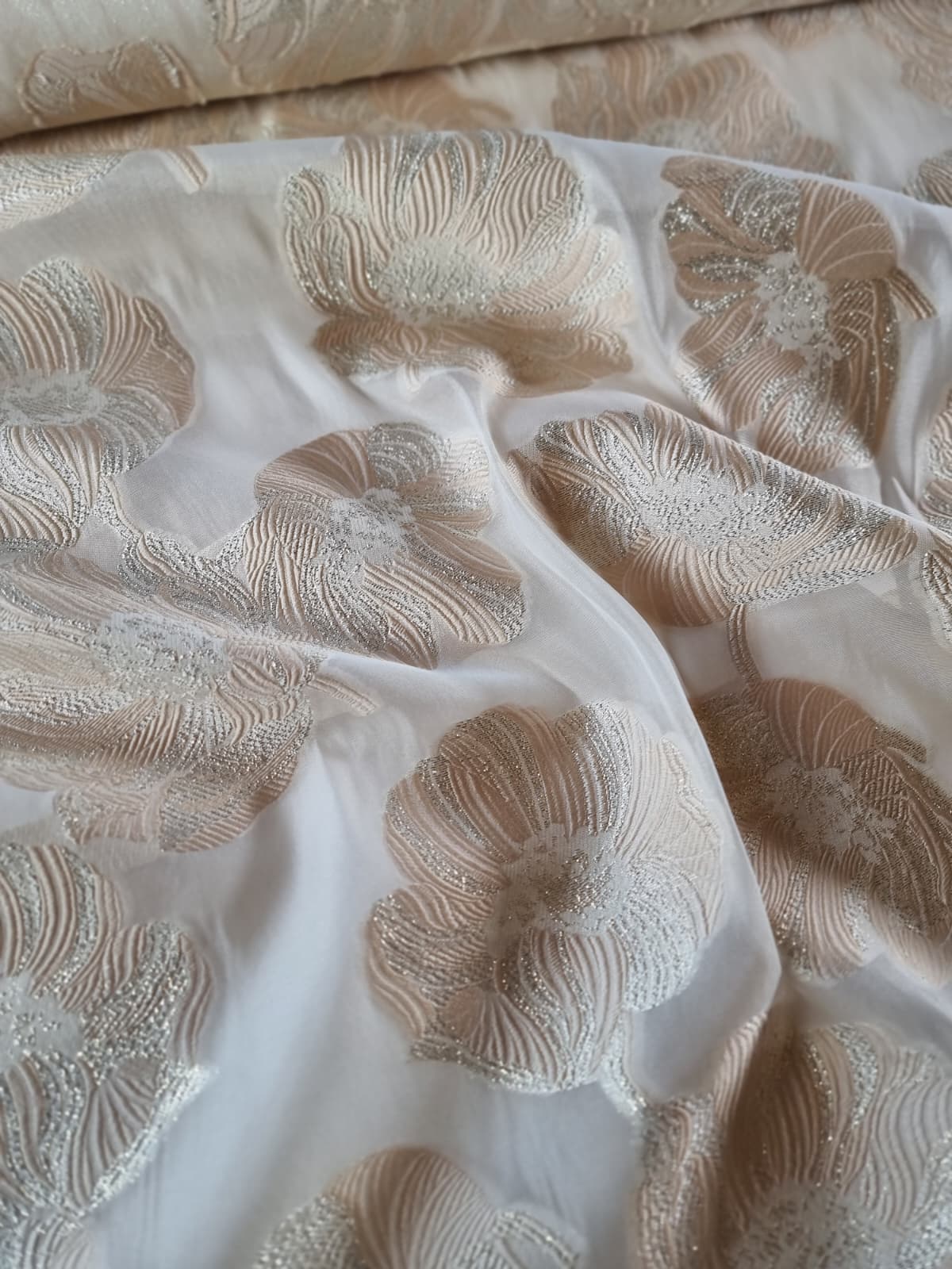 Tesatura cu matase naturala – Oraganza / Jacquard Devore – design floral, Ivoire / Auriu pastel