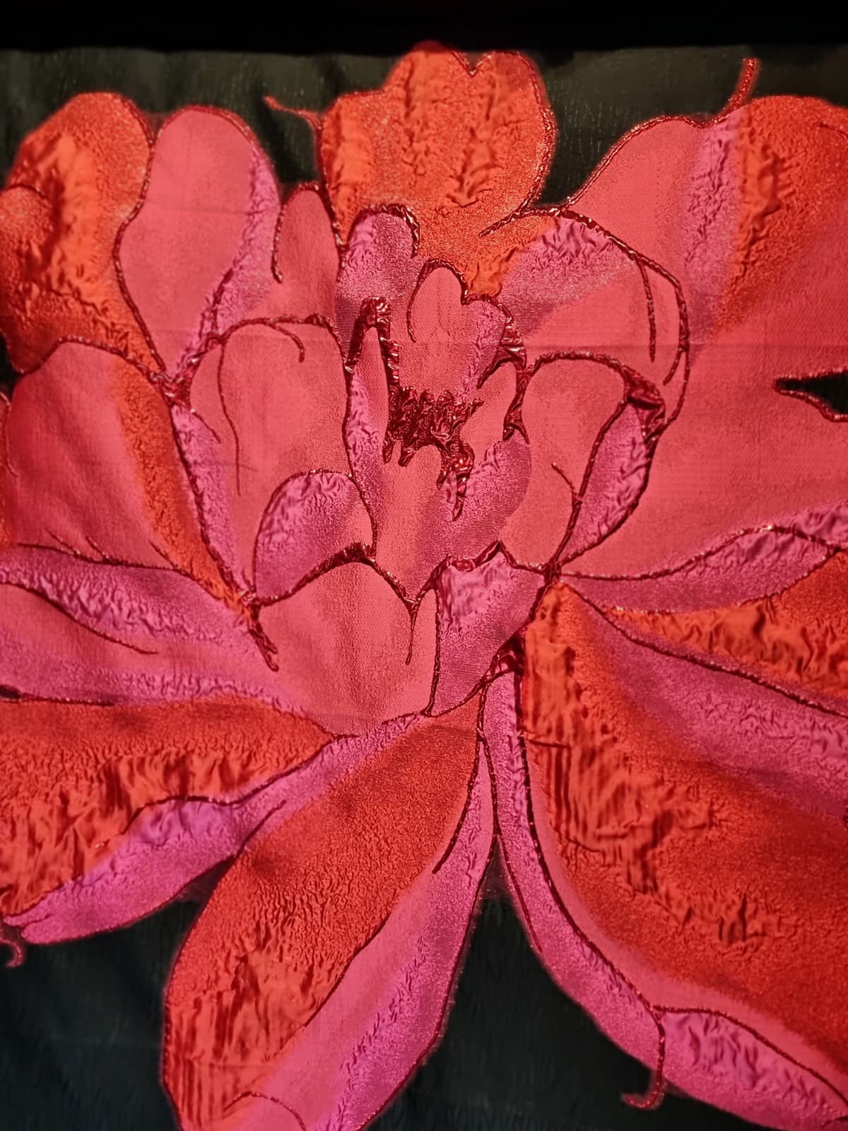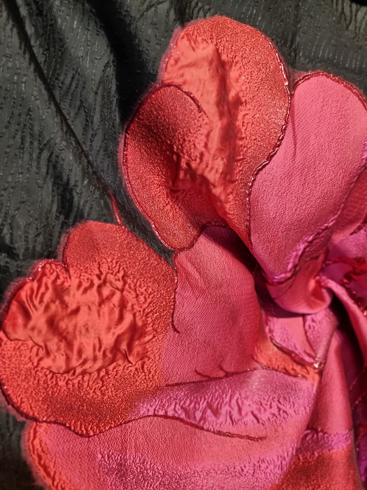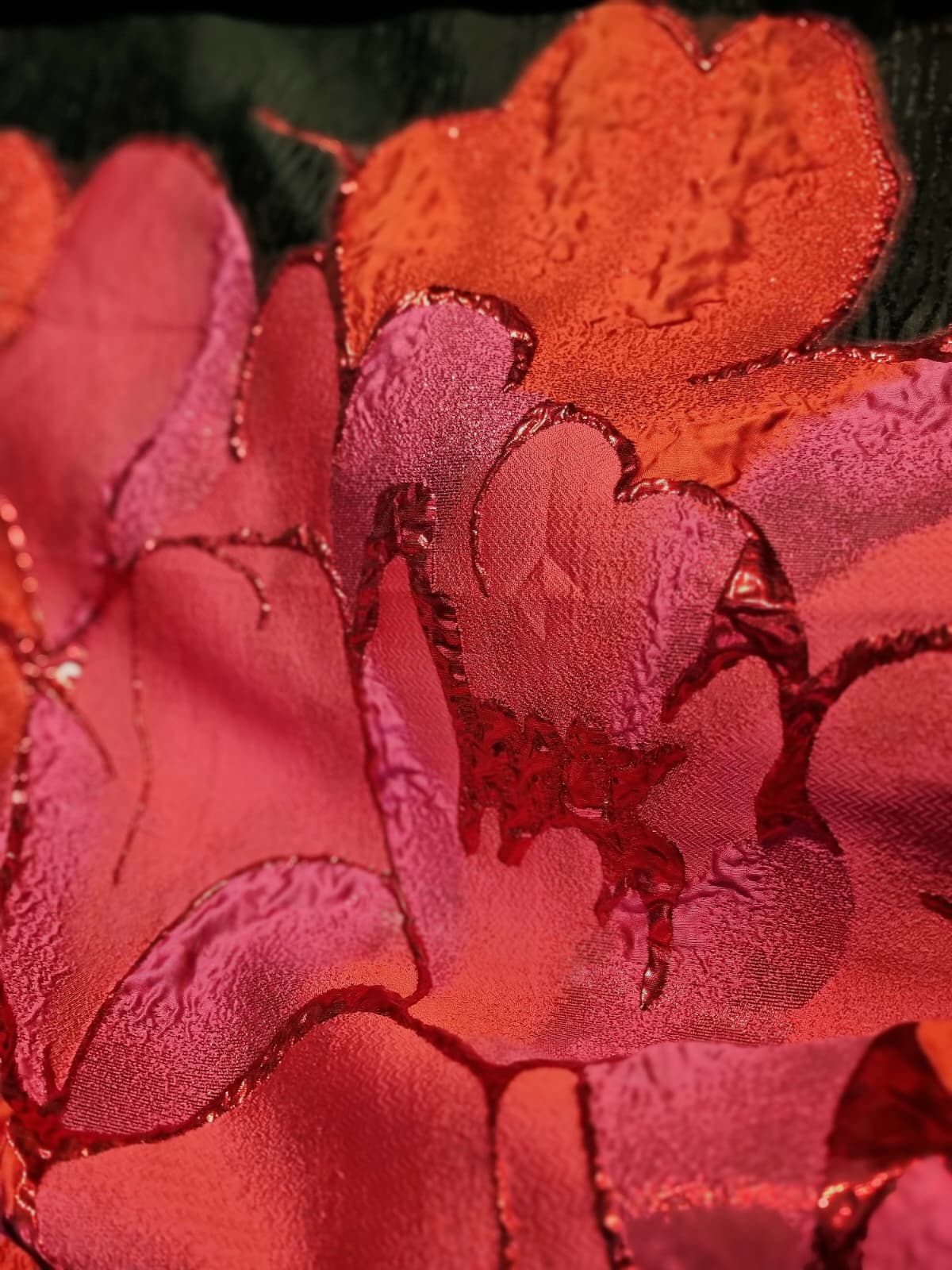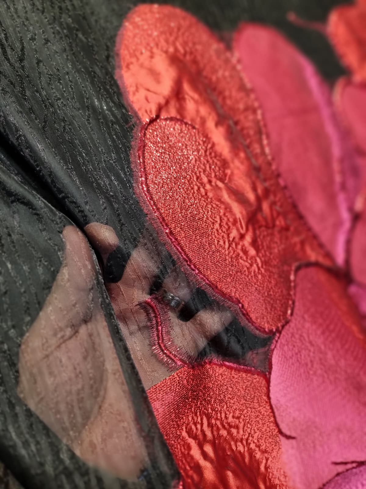 Tesatura devore tip panou cu trandafir imens roșu si cyclame, insertii de fir lurex pe suport de Organza neagră