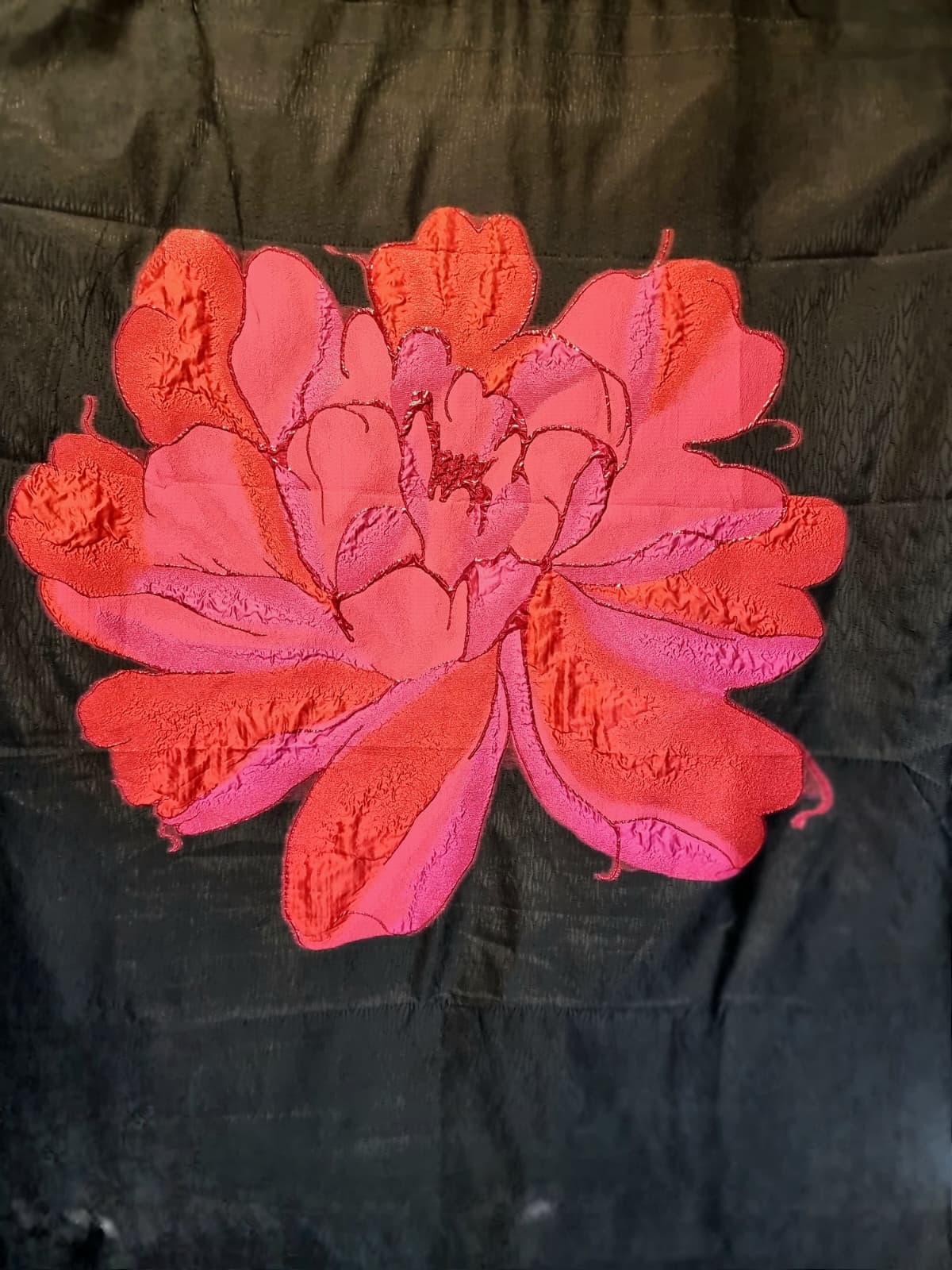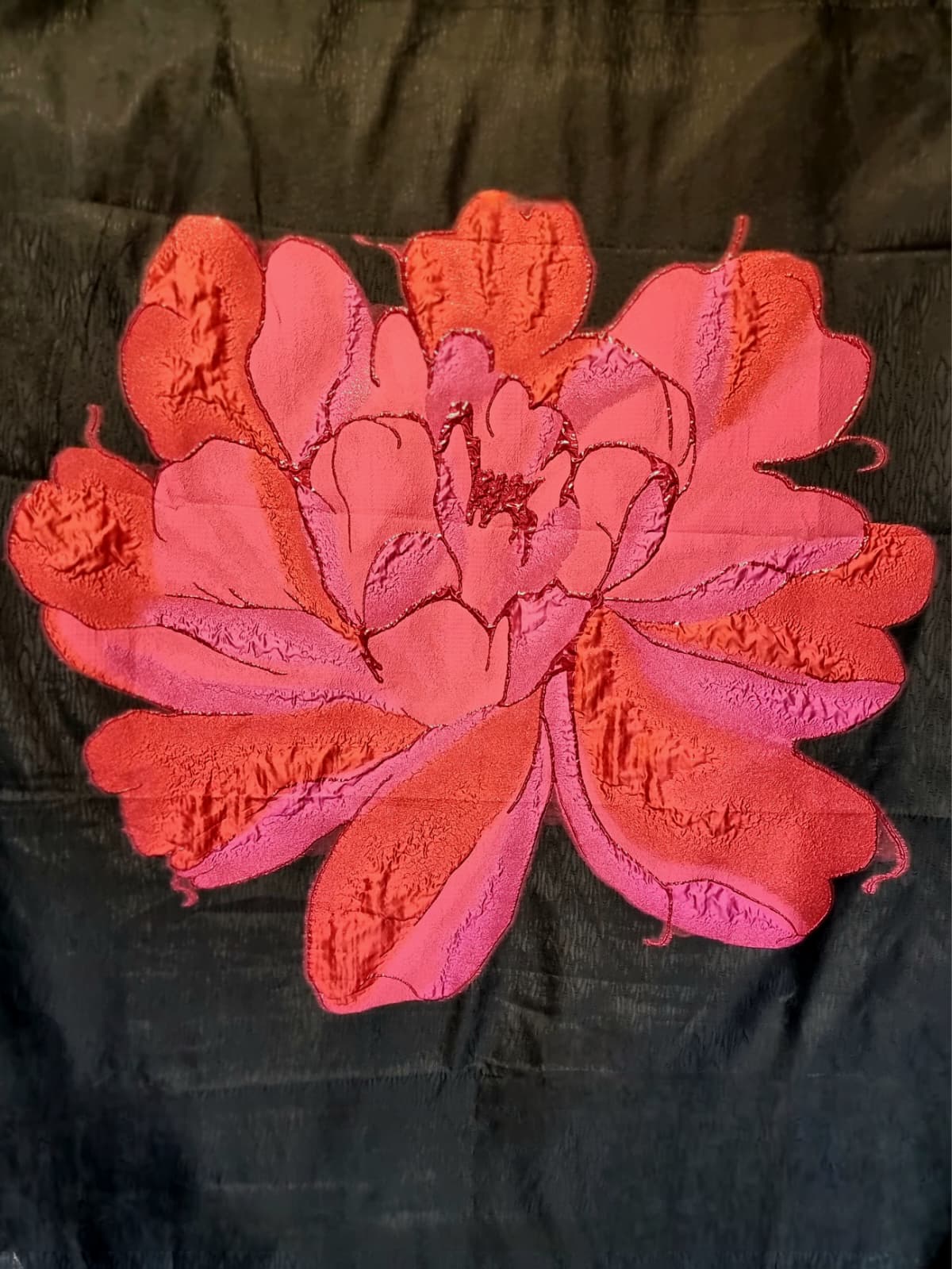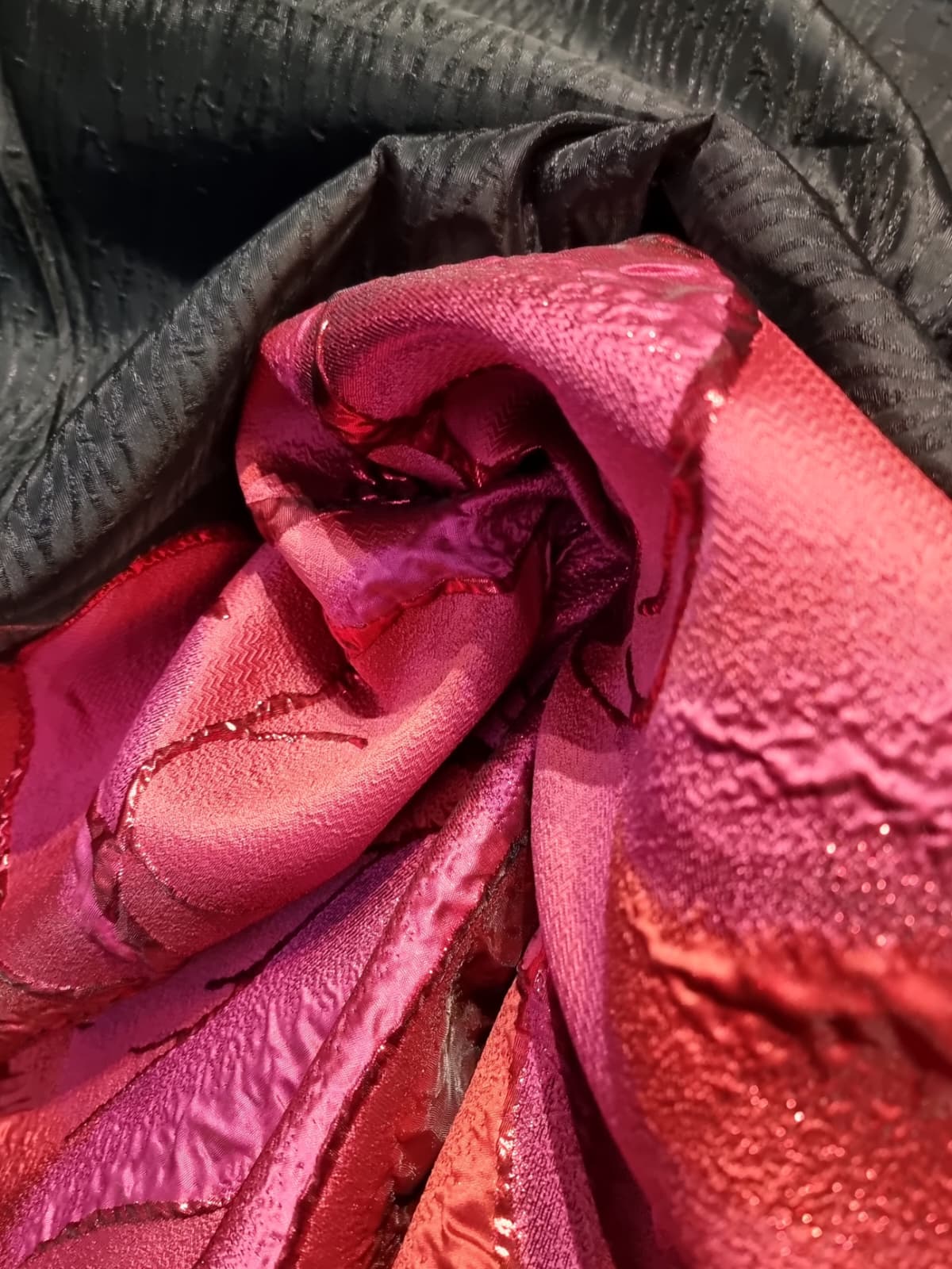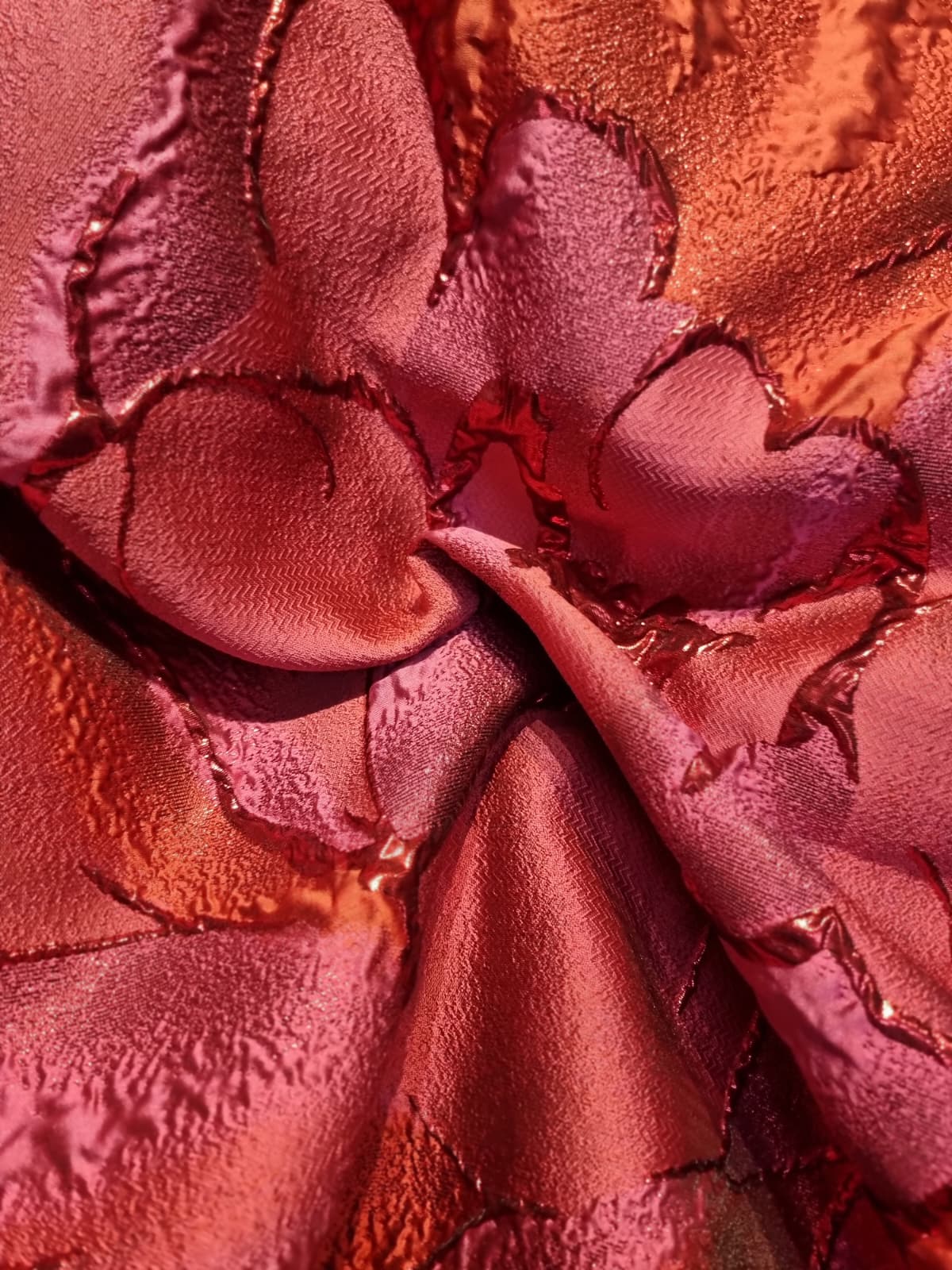 Tesatura devore tip panou cu trandafir imens roșu si cyclame, insertii de fir lurex pe suport de Organza neagră