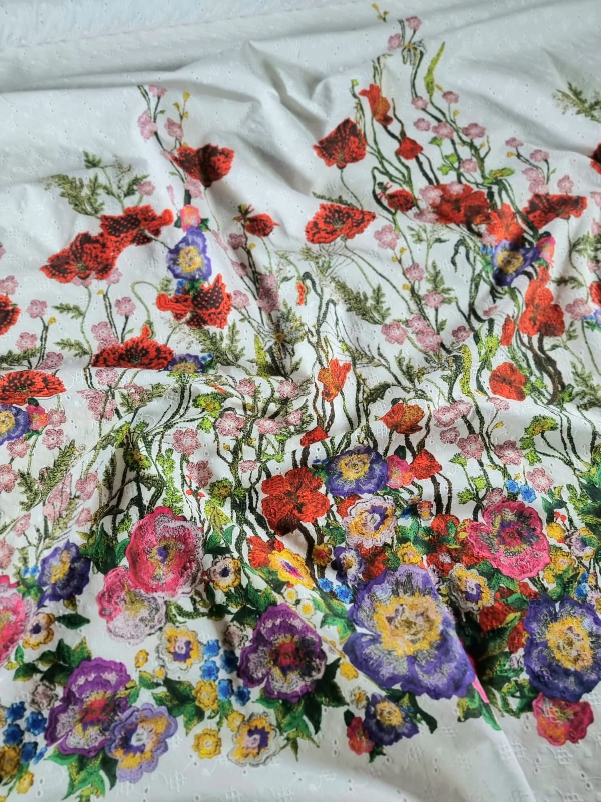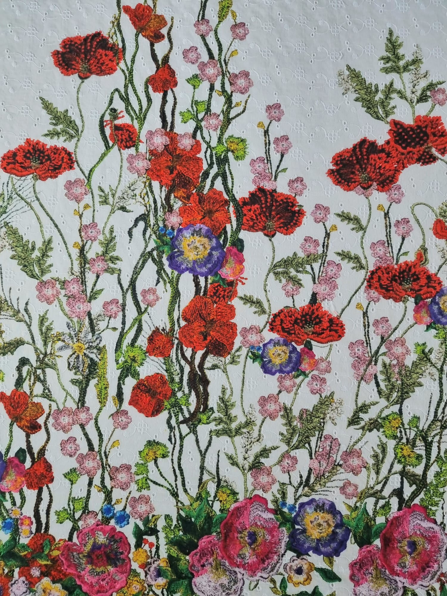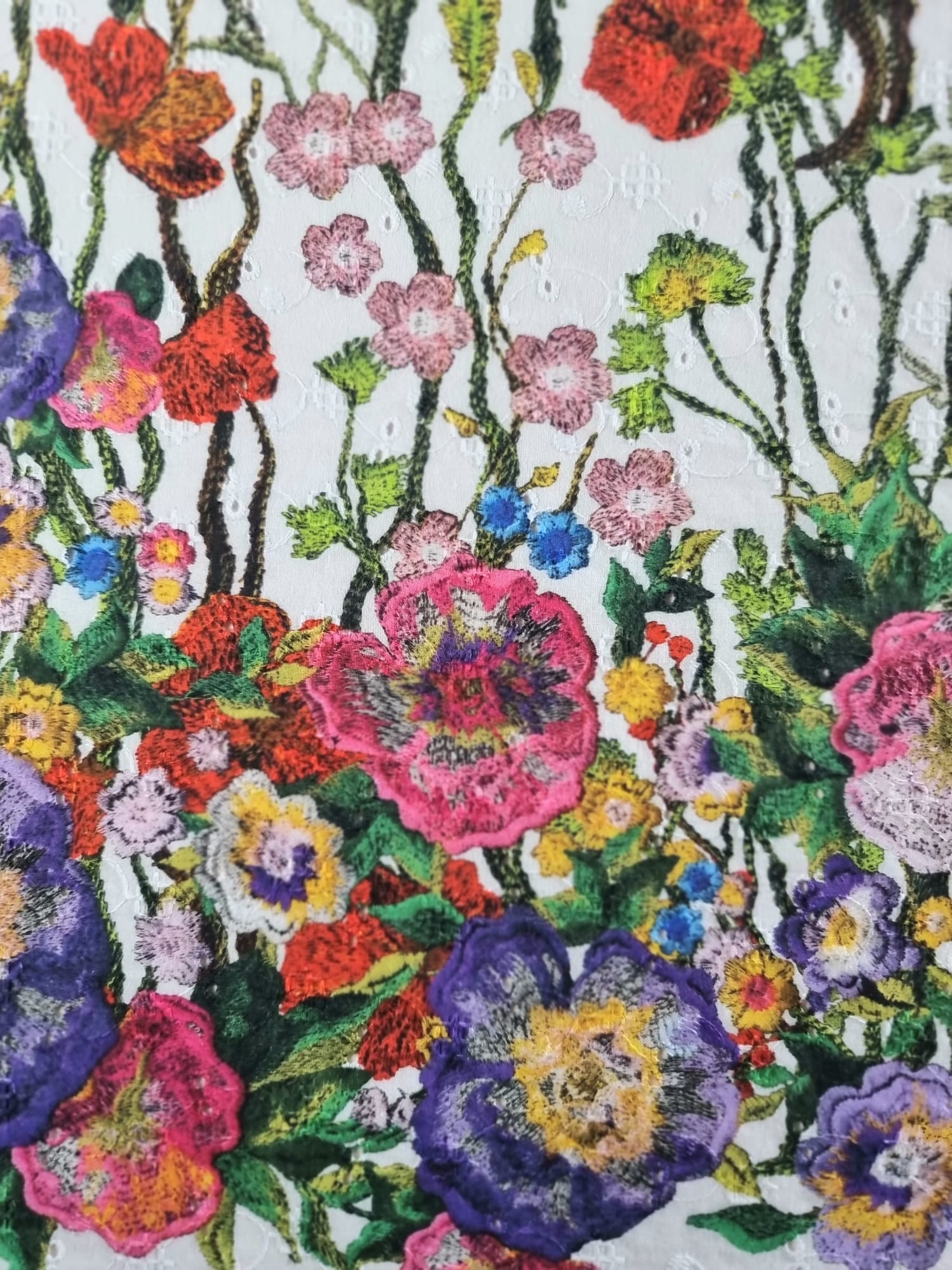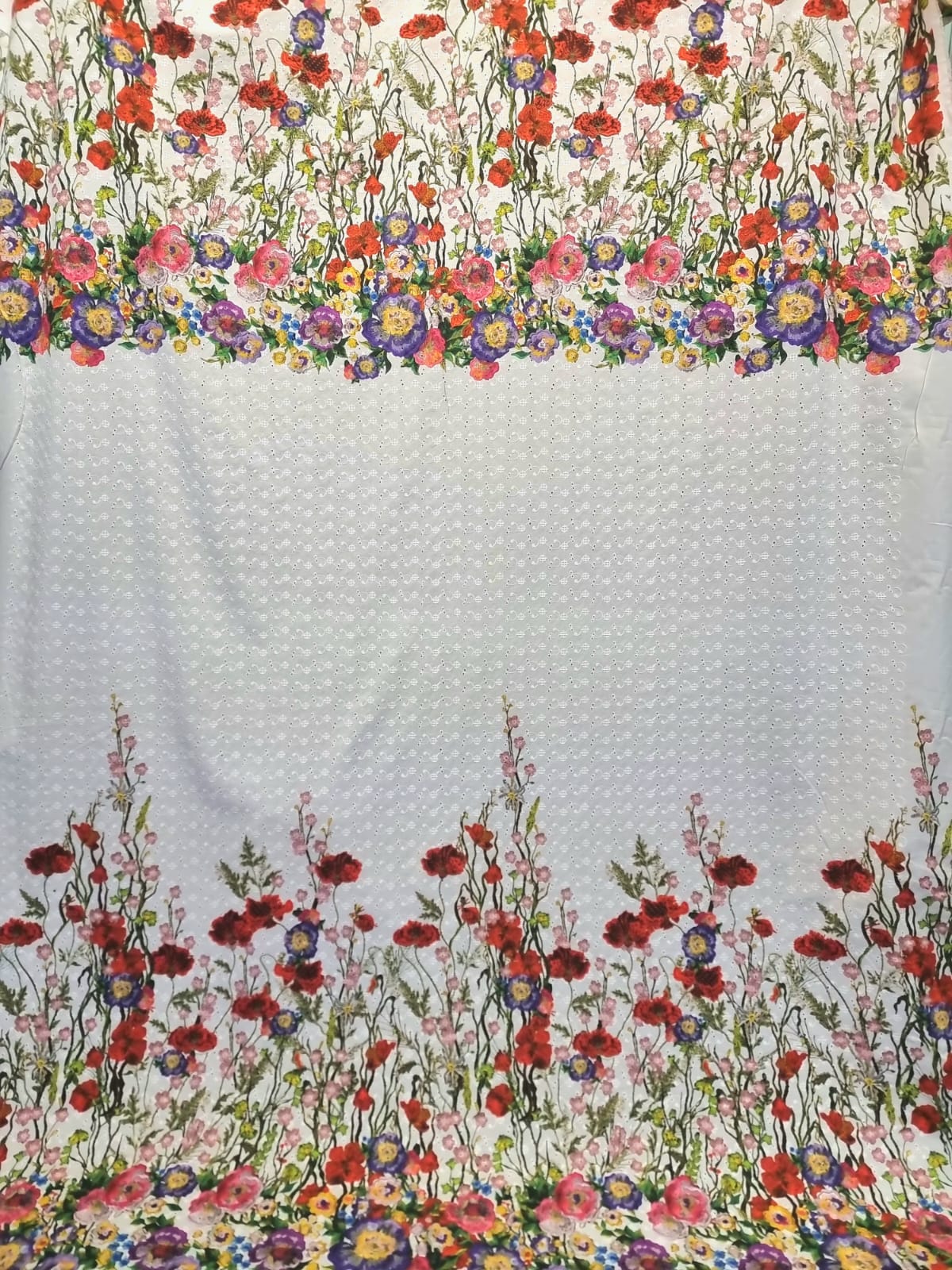 Tesatura din bumbac brodat și imprimat sub formă de panou – floral, multicolor pe fond alb
