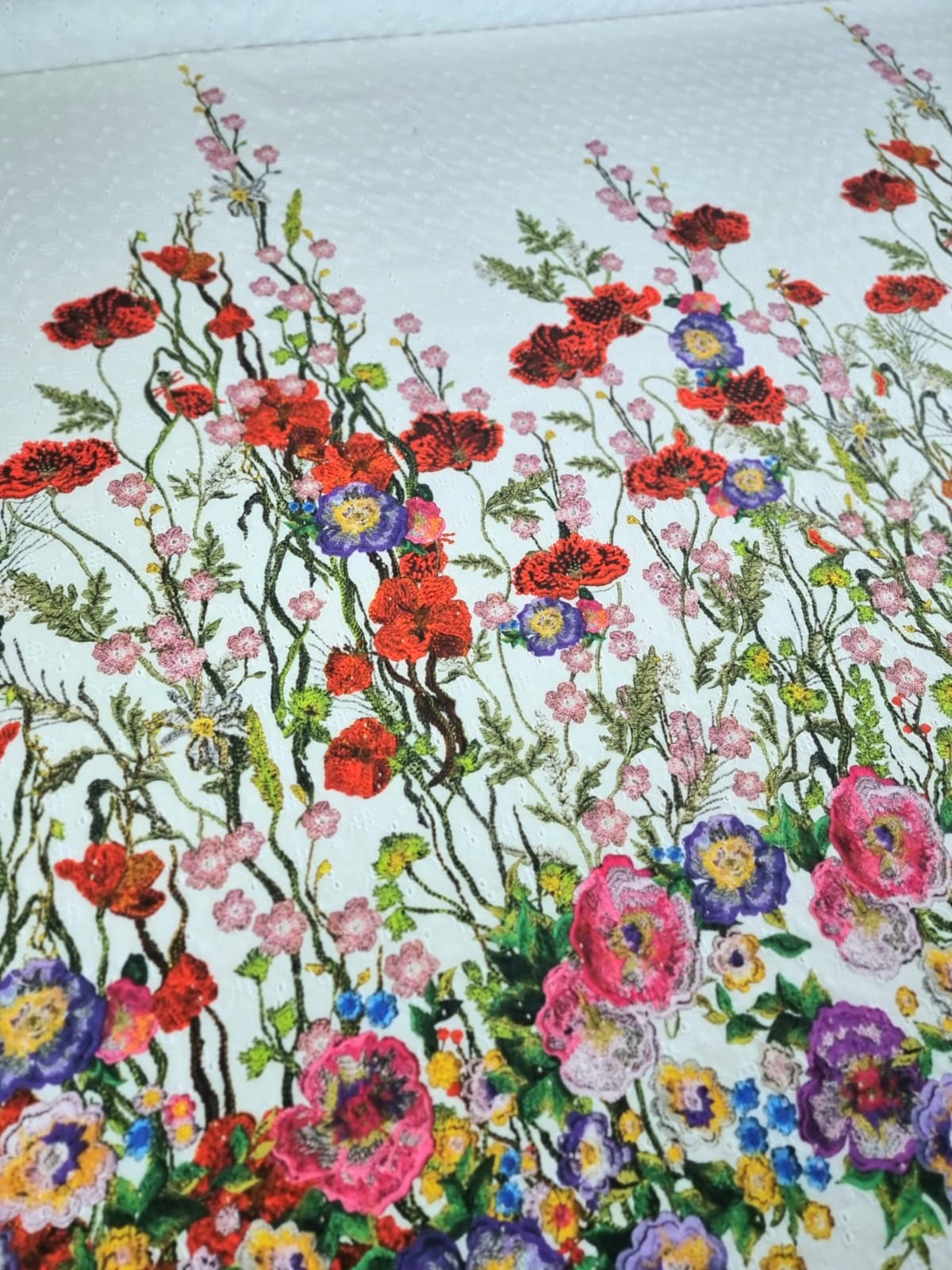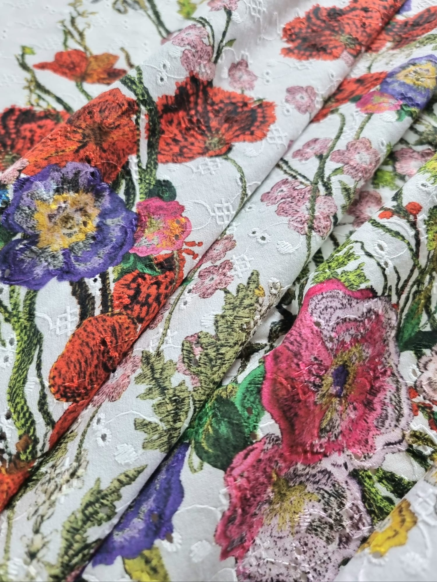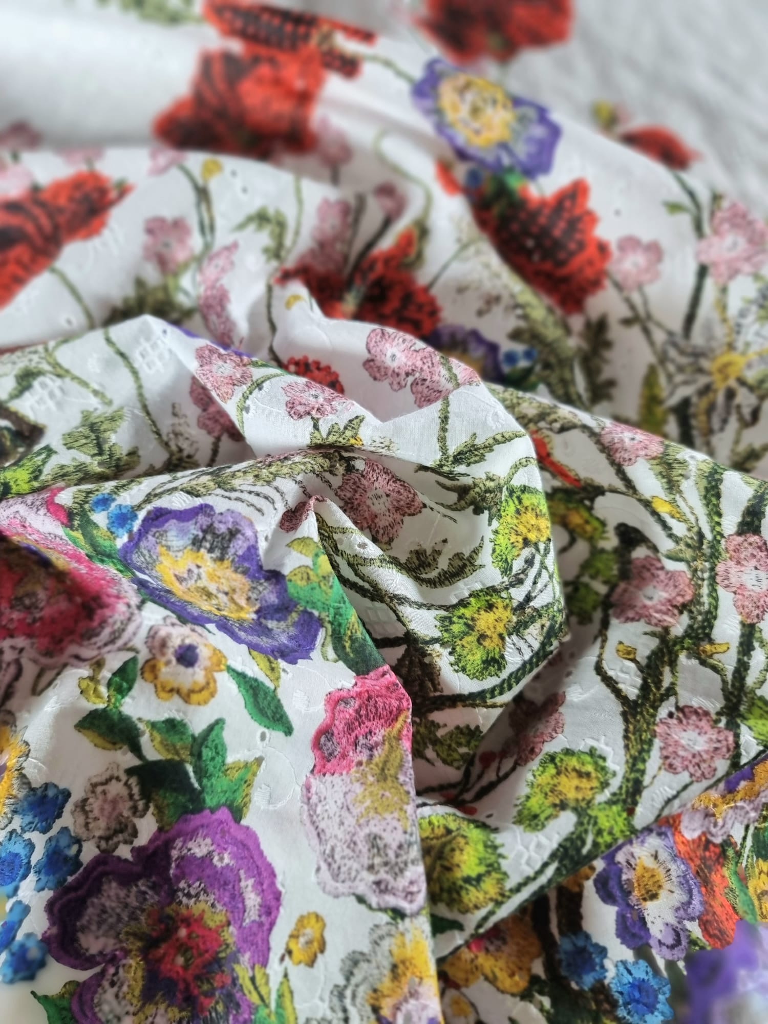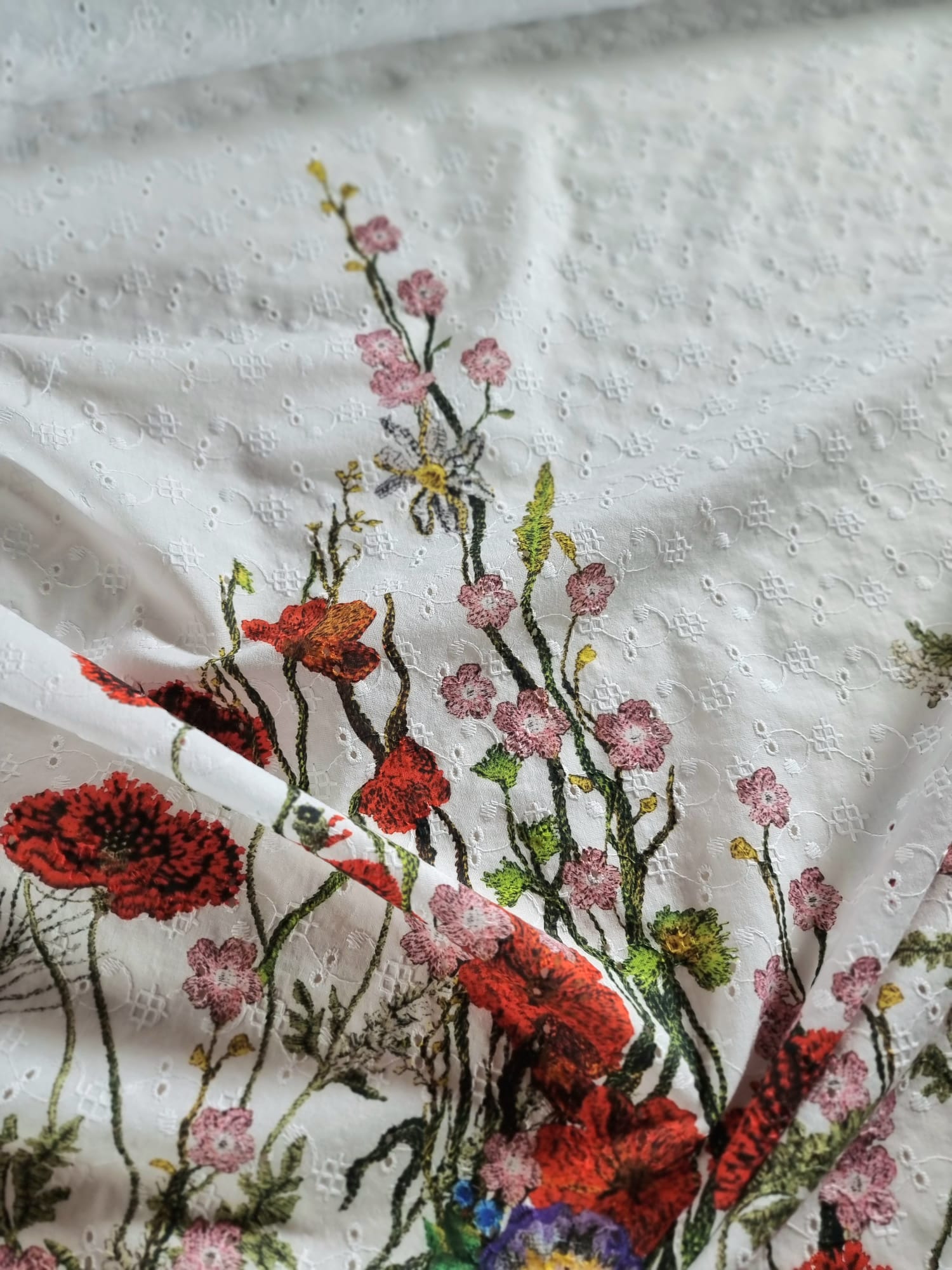 Tesatura din bumbac brodat și imprimat sub formă de panou – floral, multicolor pe fond alb