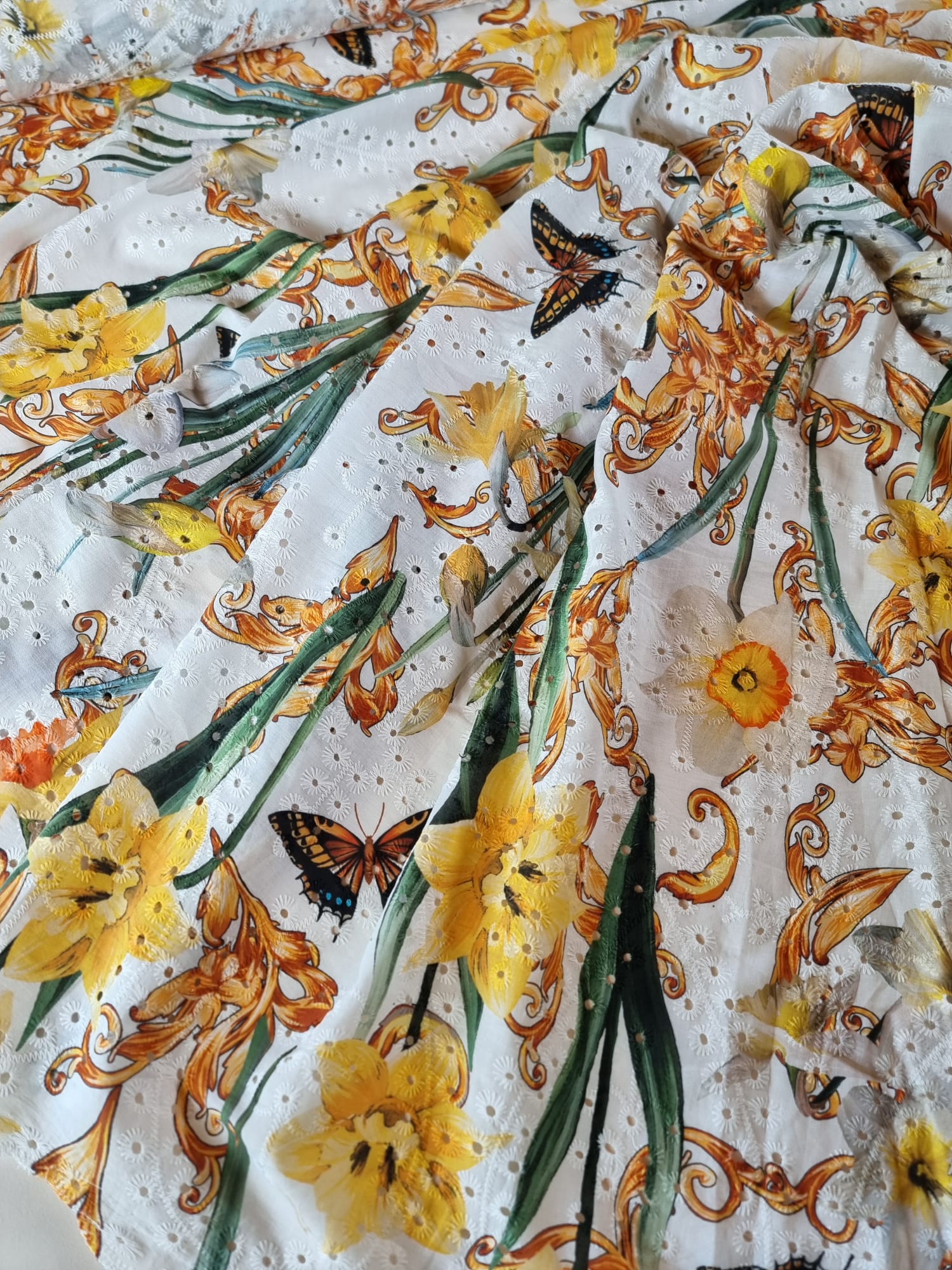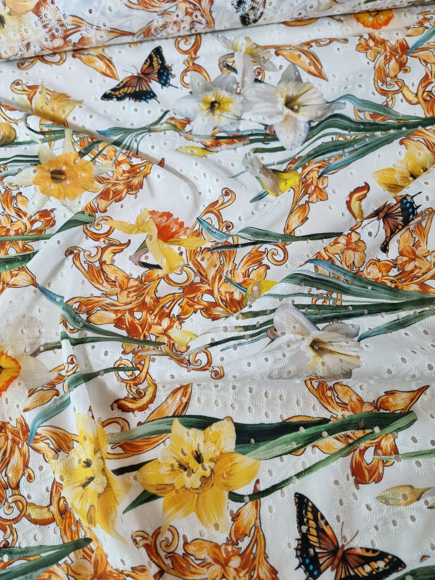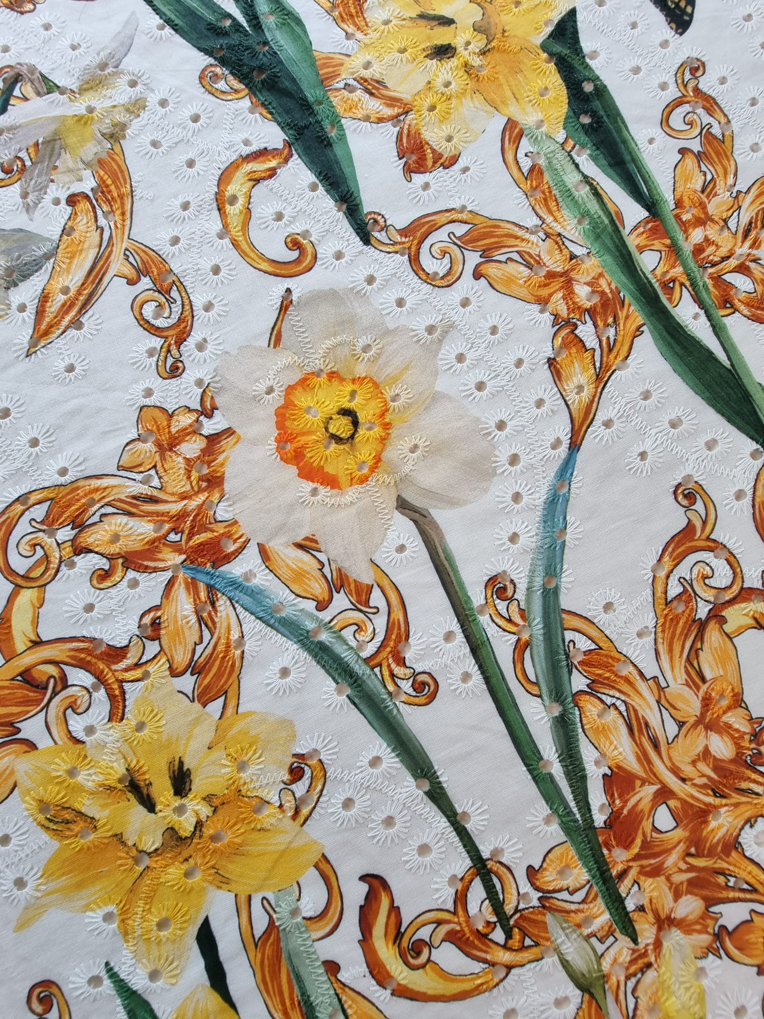 Tesatura din bumbac cu broderie spartă – Imprimeu cu narcise Galbene pe fond Alb