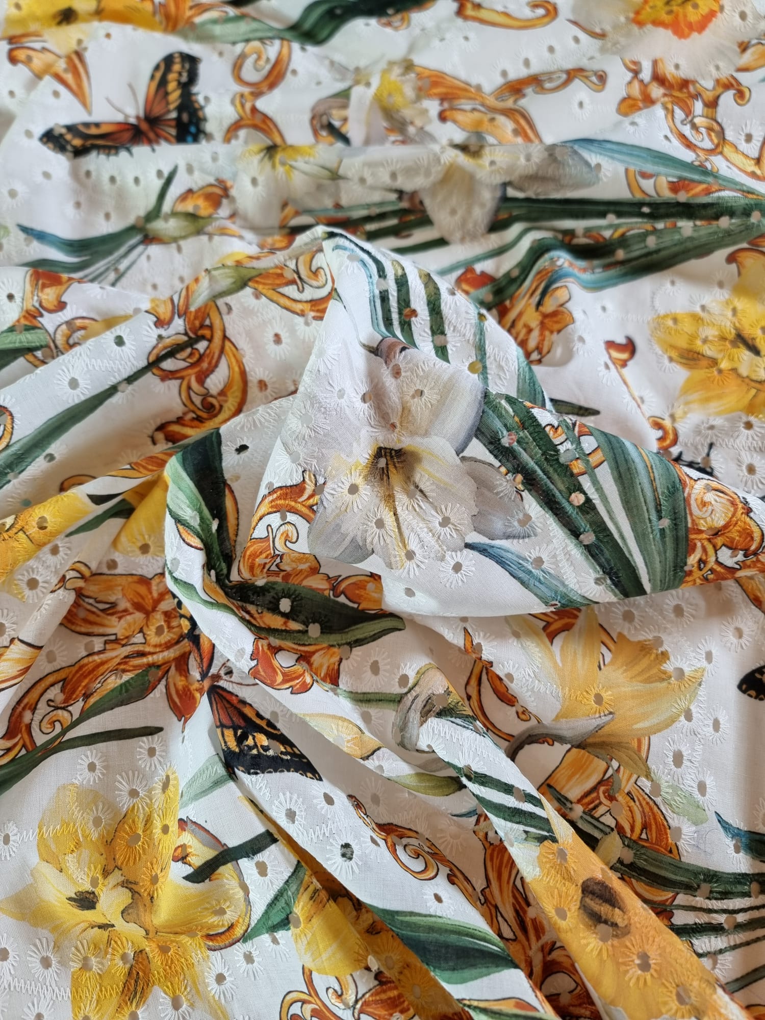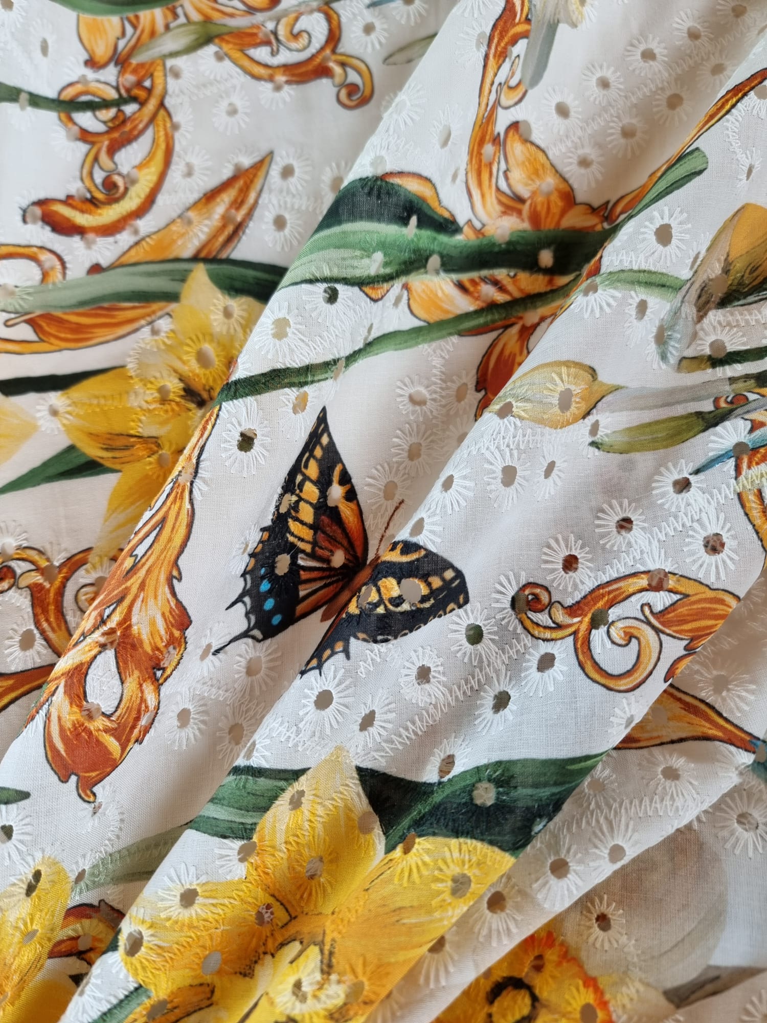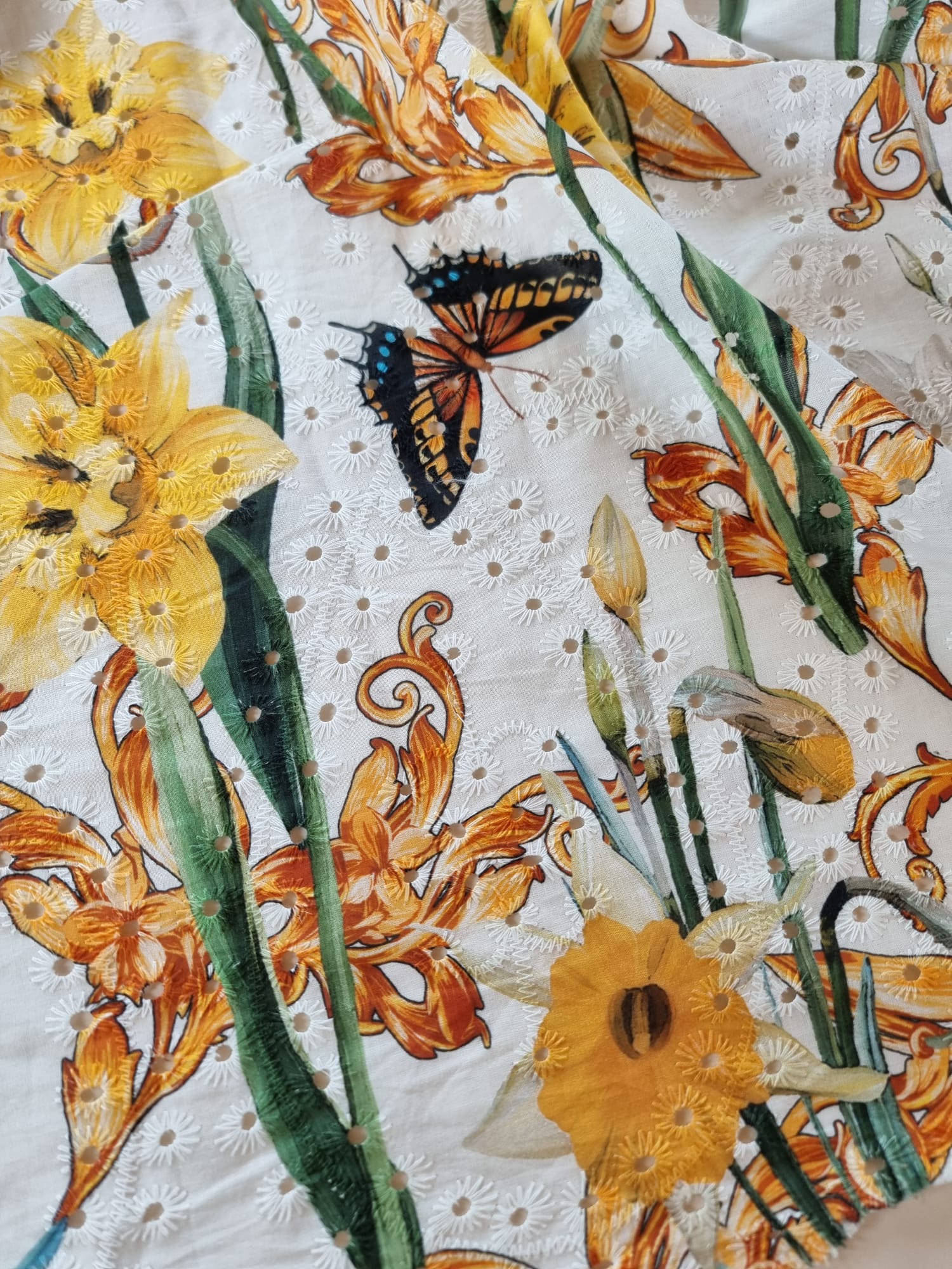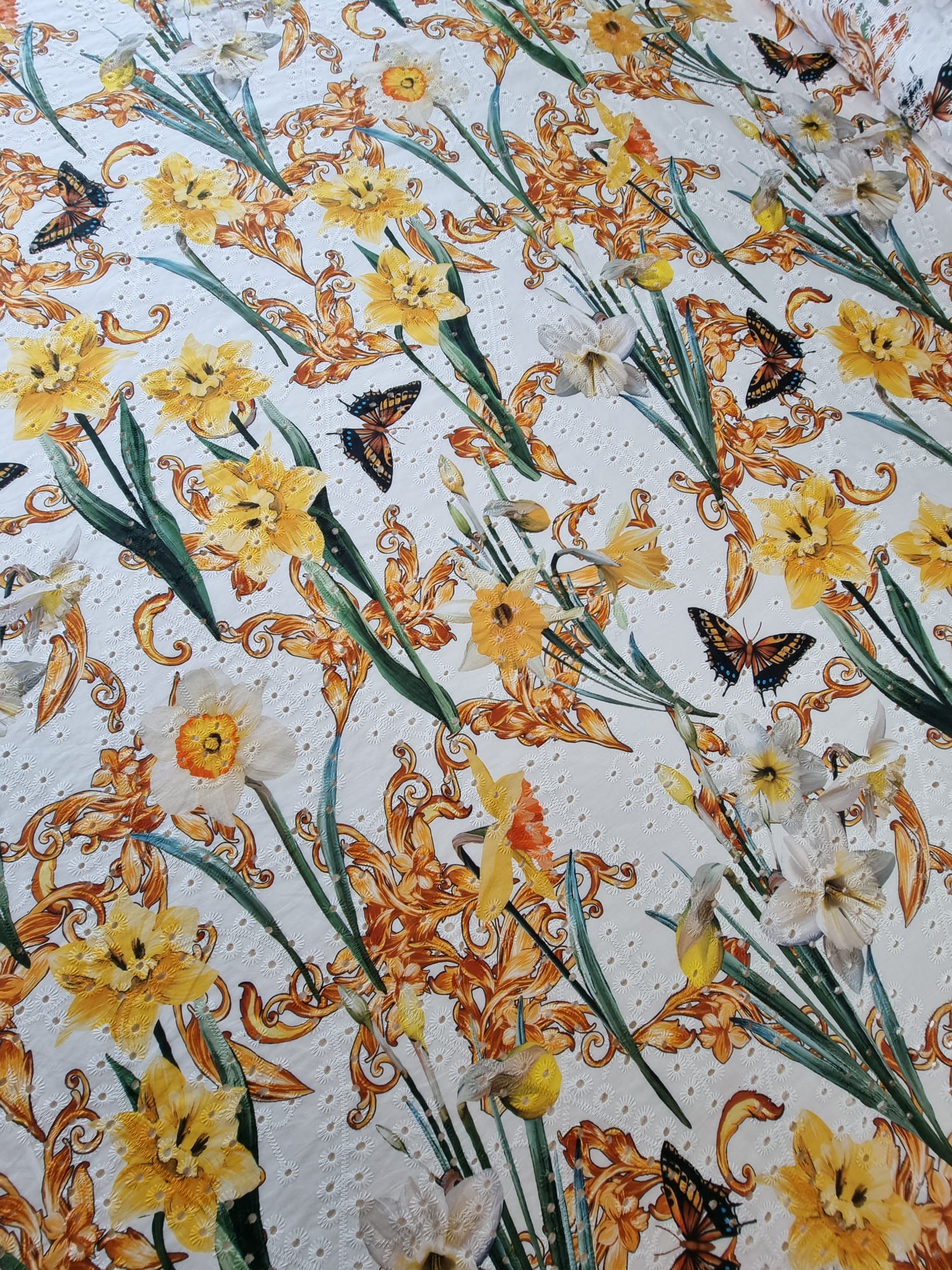Tesatura din bumbac cu broderie spartă – Imprimeu cu narcise Galbene pe fond Alb