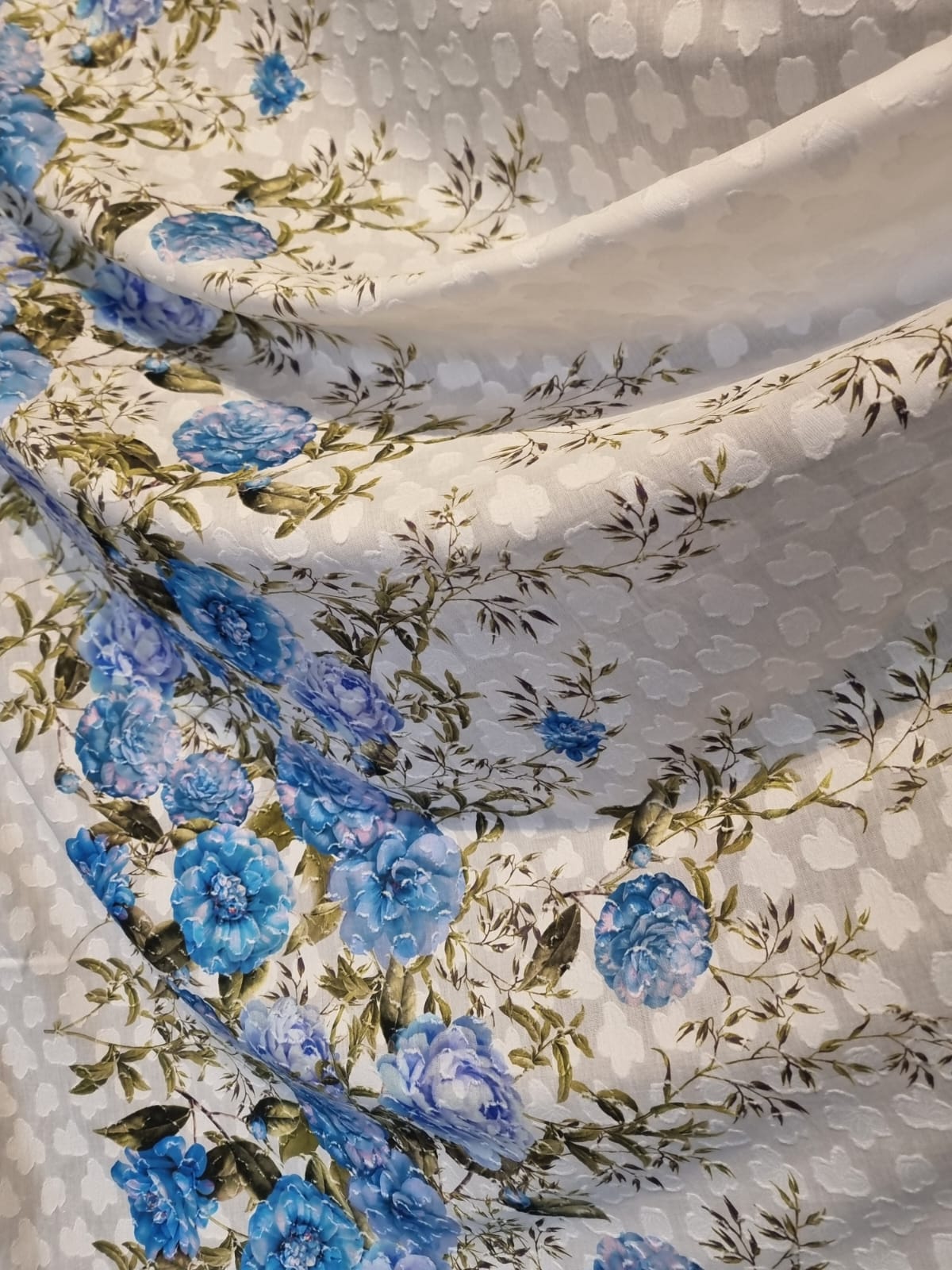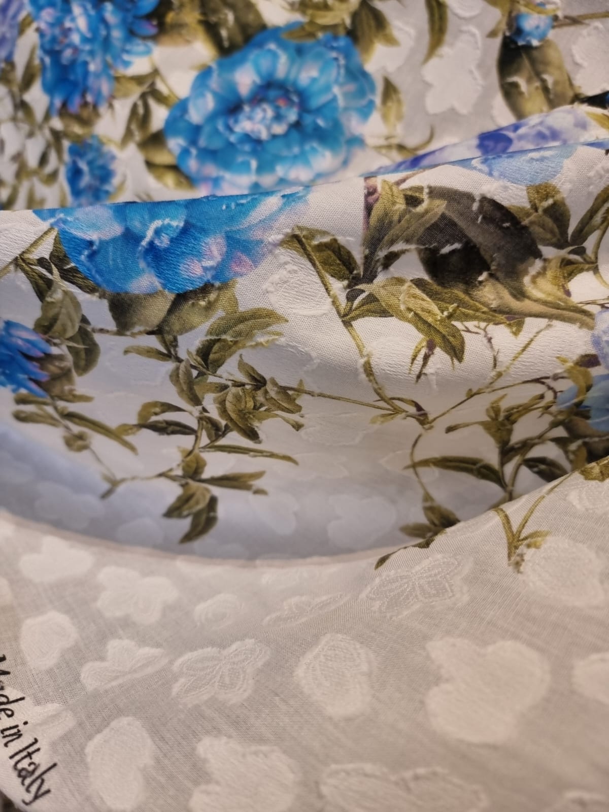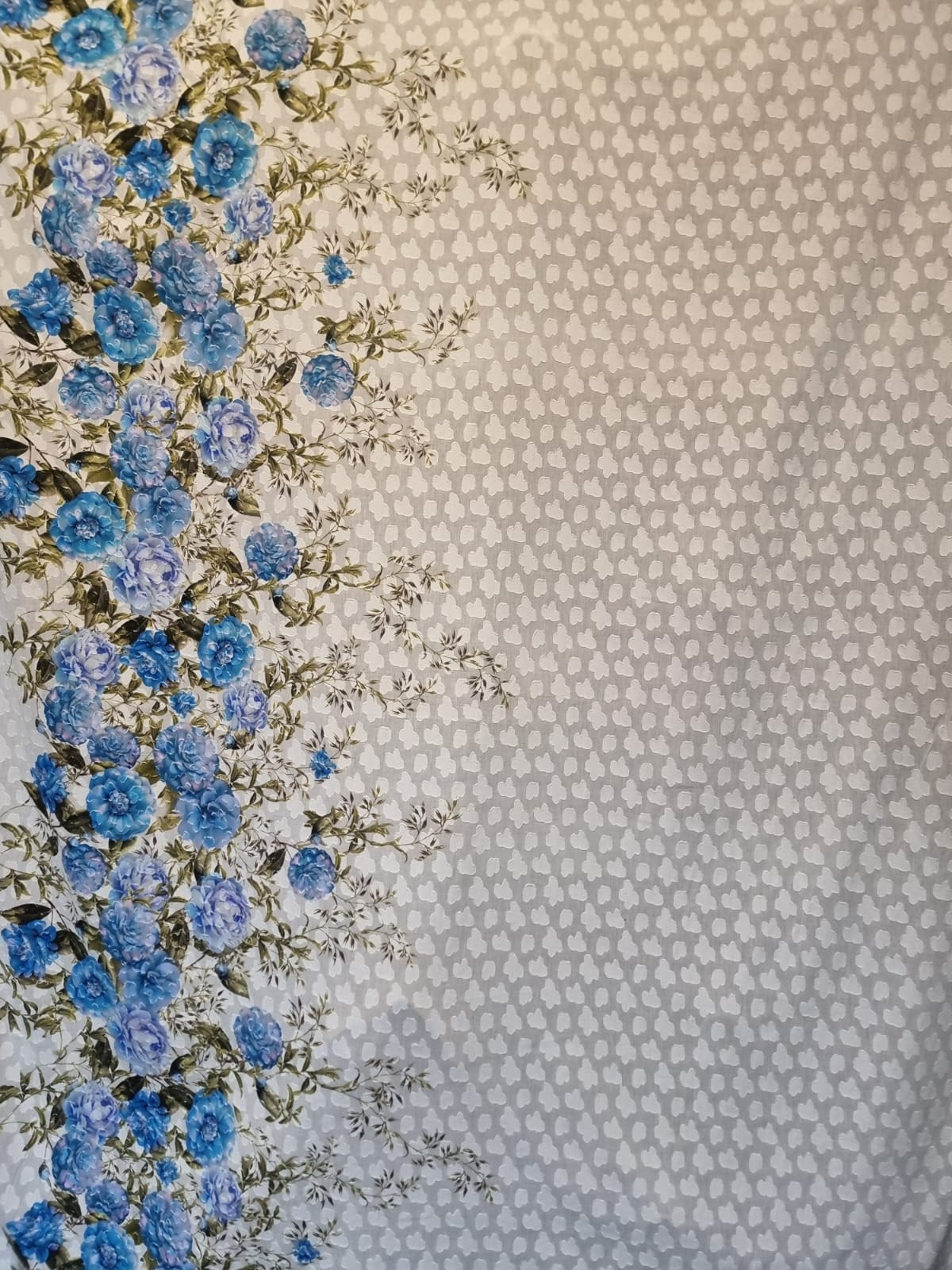 Tesatura din bumbac fil coupe – model cu bordură laterală si flori Albastre pe fond Alb