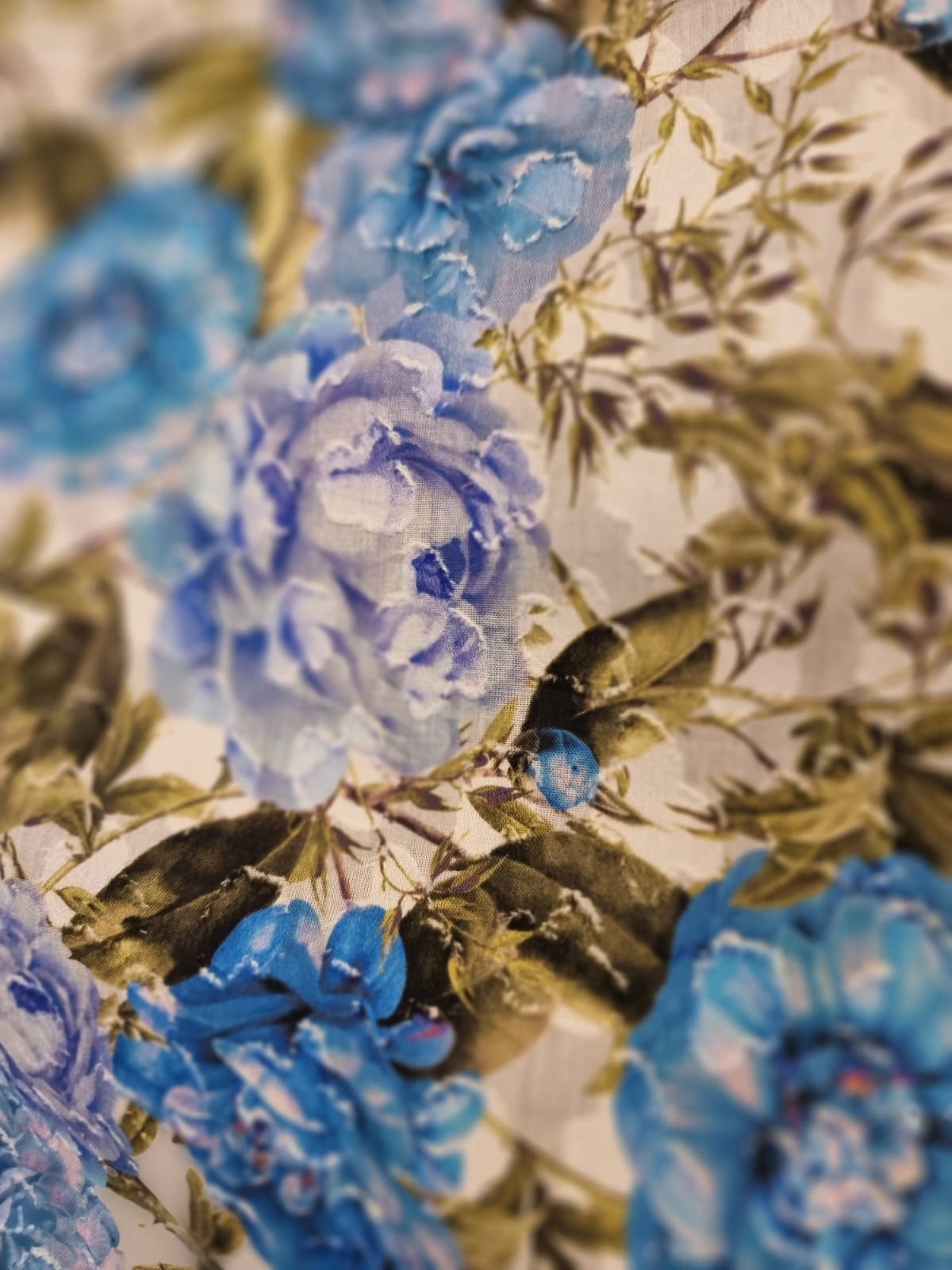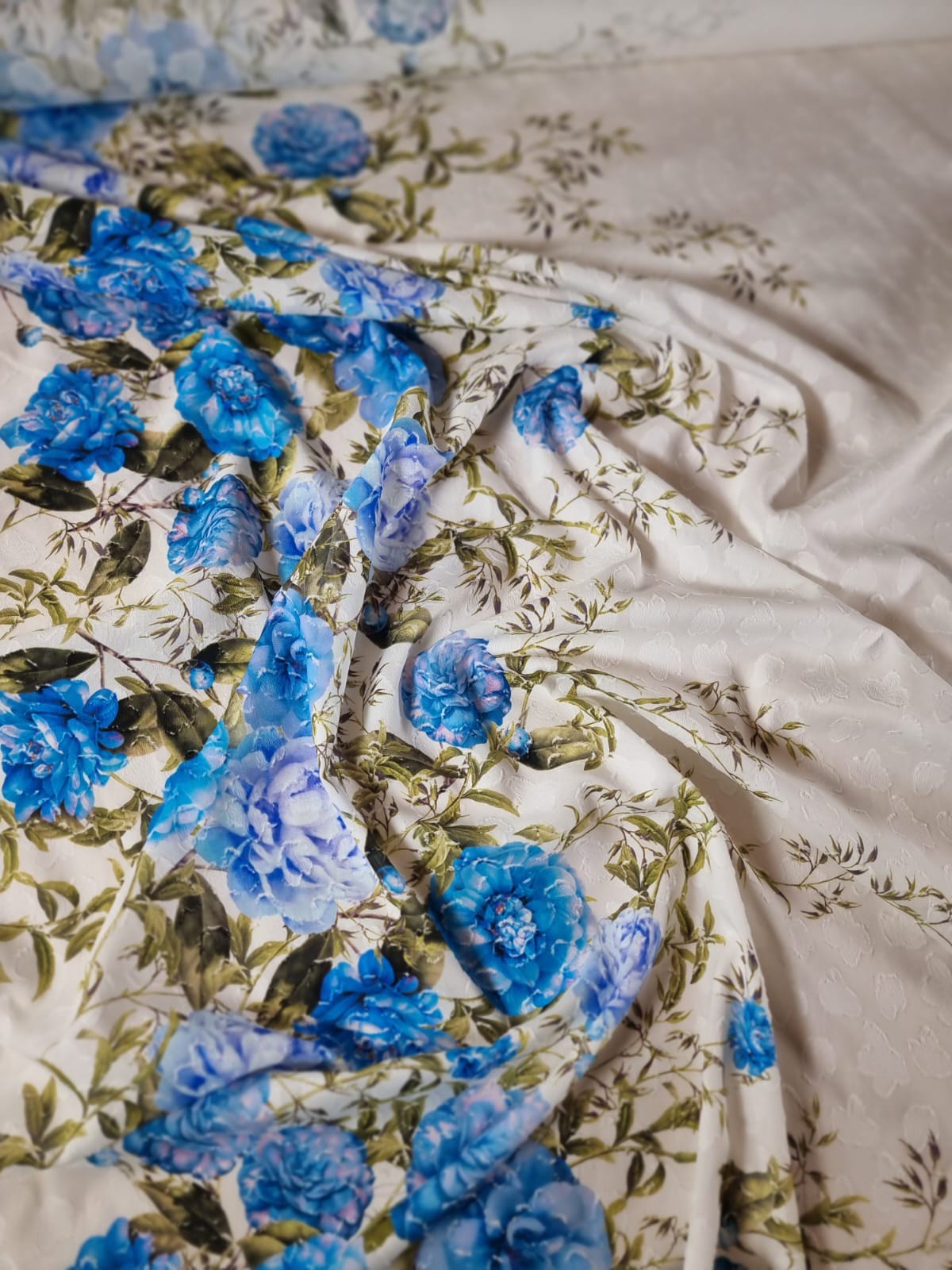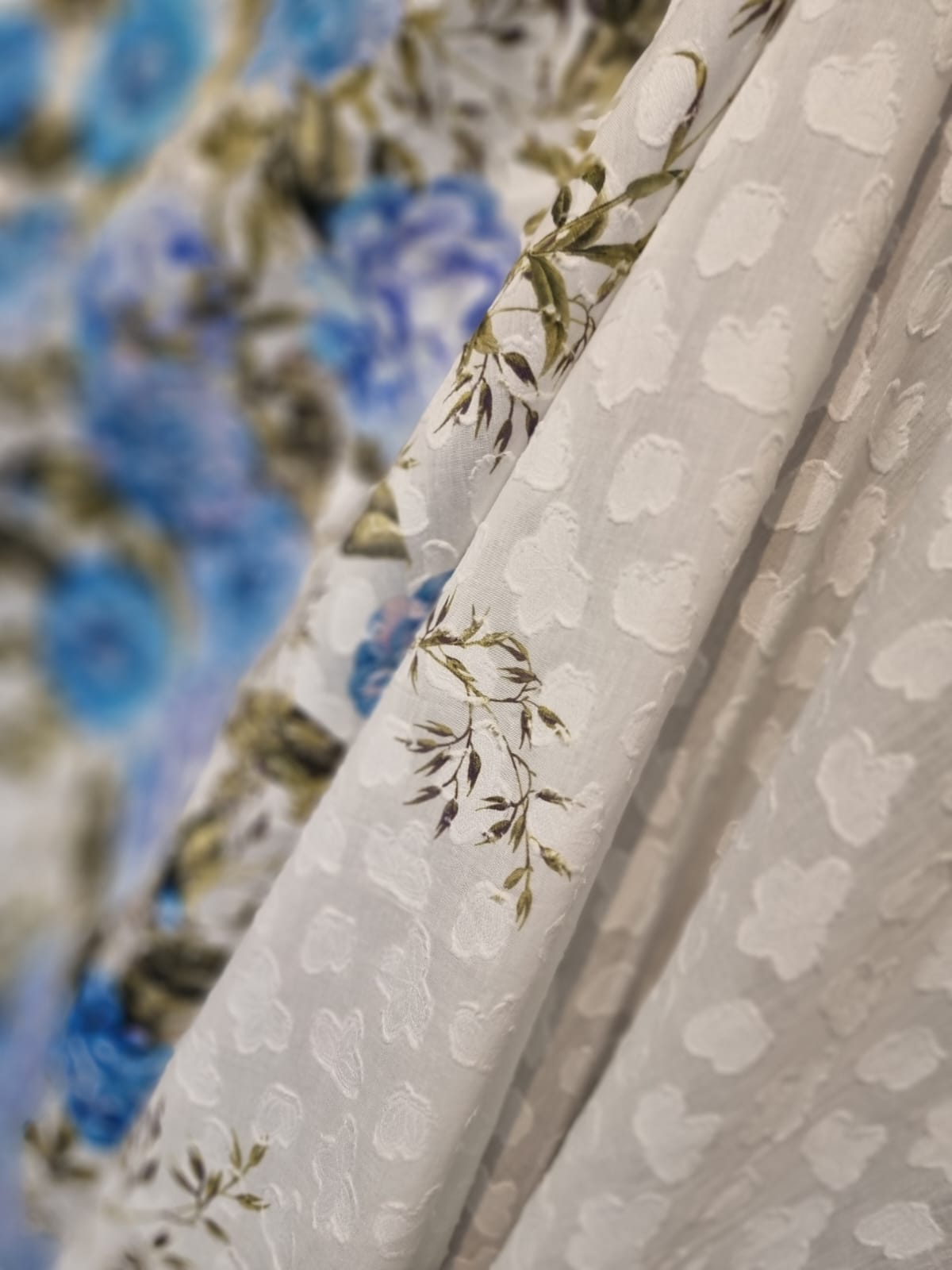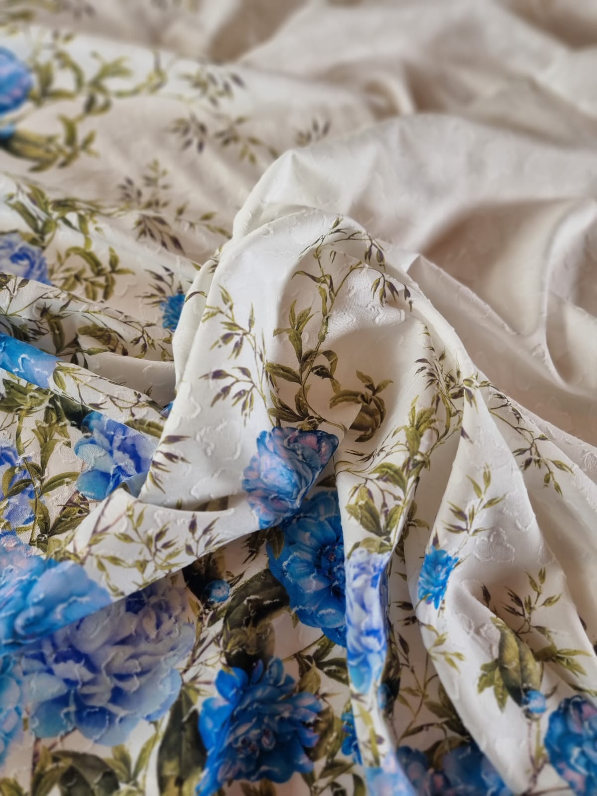 Tesatura din bumbac fil coupe – model cu bordură laterală si flori Albastre pe fond Alb