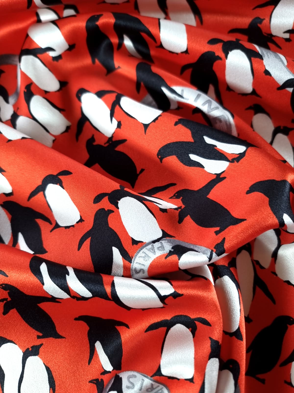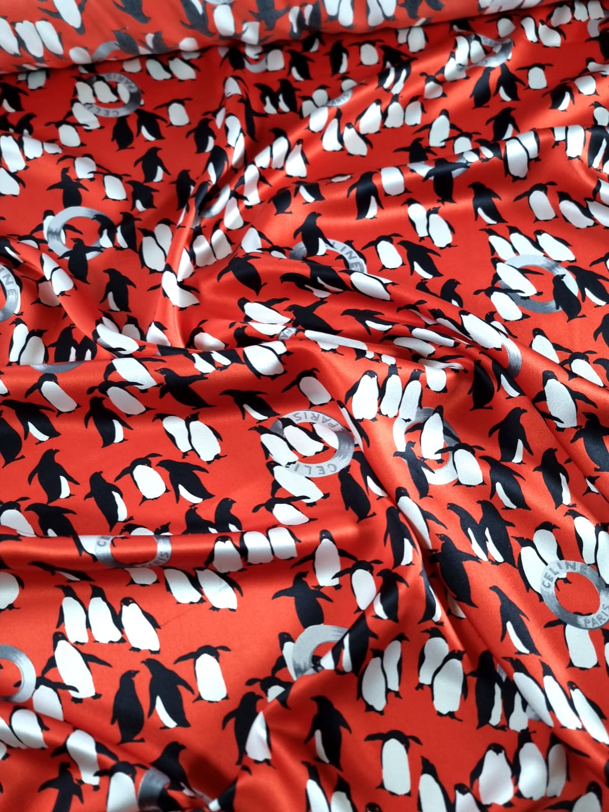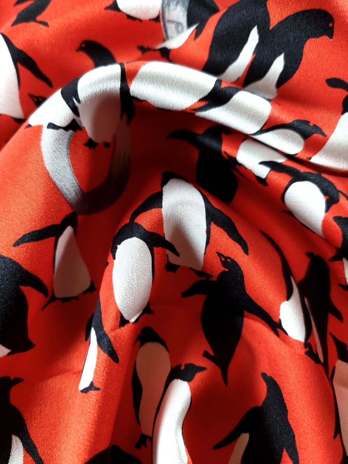 Tesatura din matase naturala – satinată cu imprimeu de pinguini albi-negrii pe fond Rosu