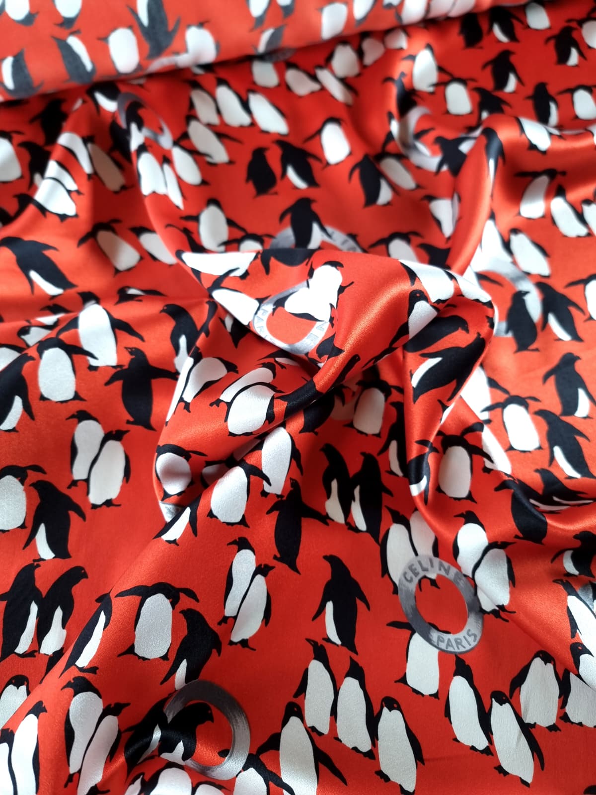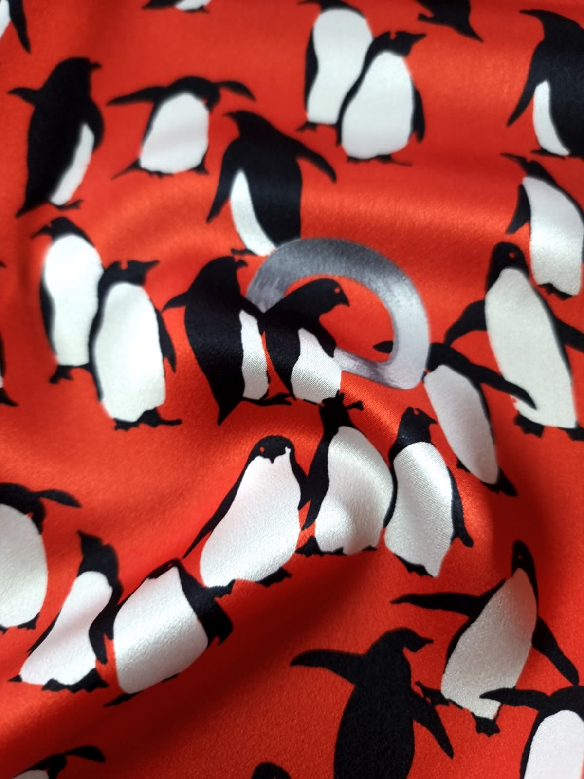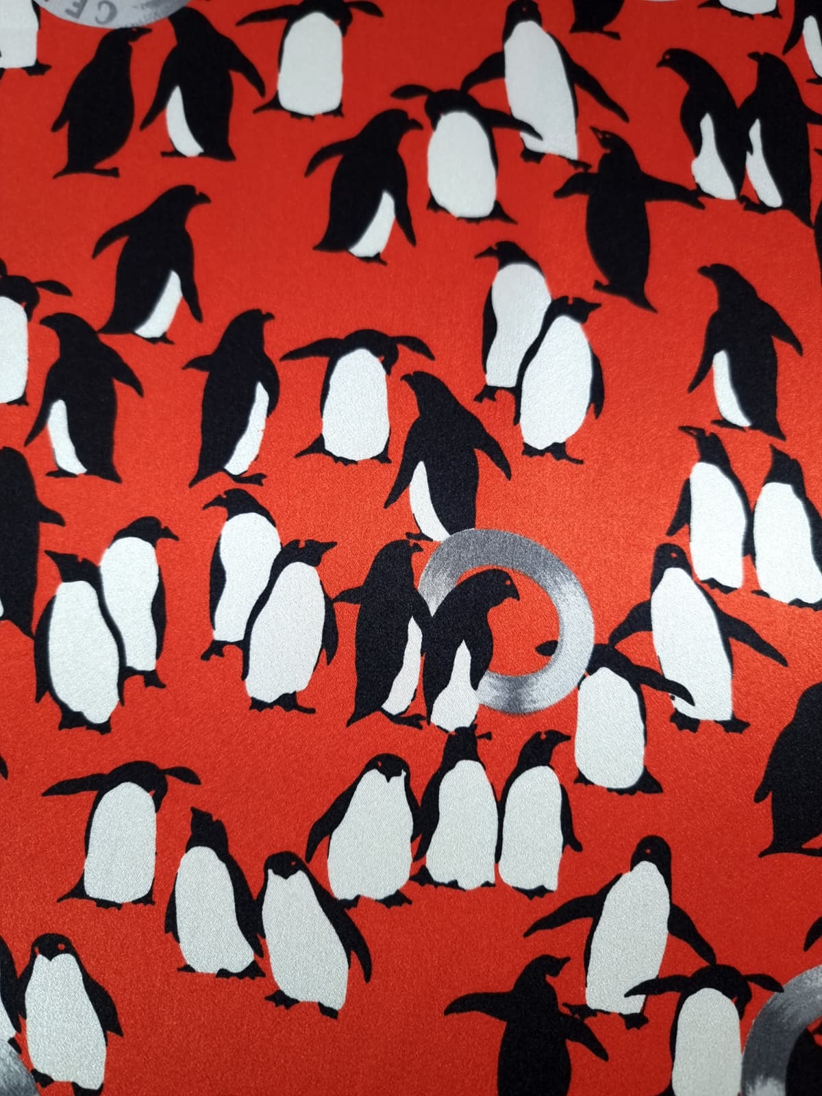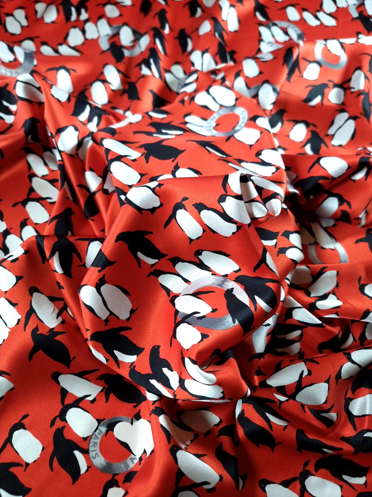 Tesatura din matase naturala – satinată cu imprimeu de pinguini albi-negrii pe fond Rosu