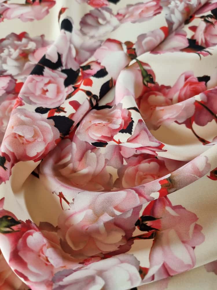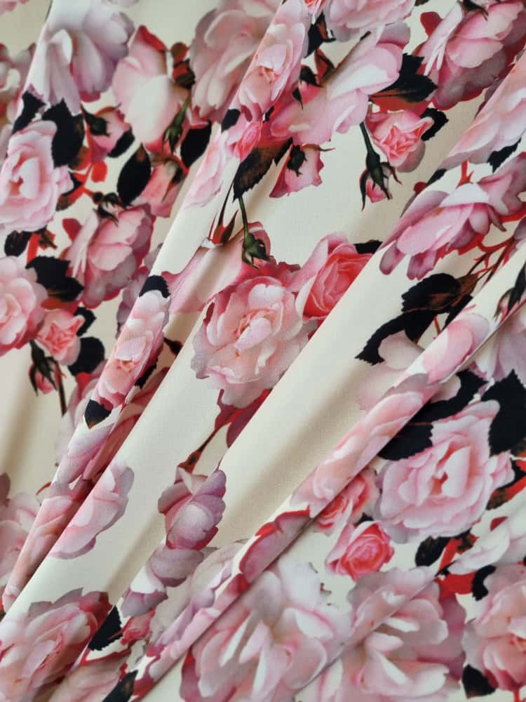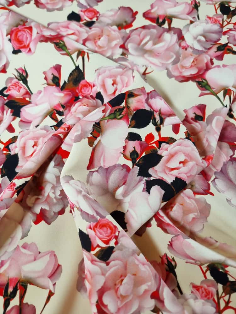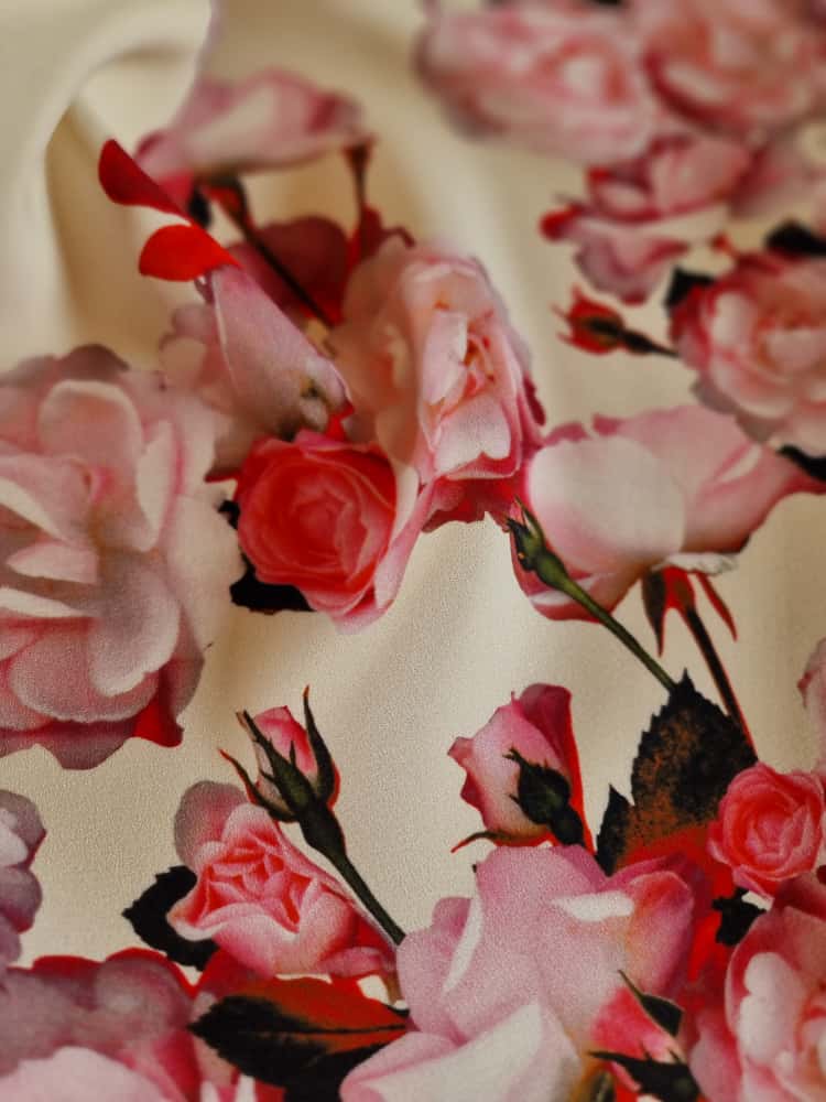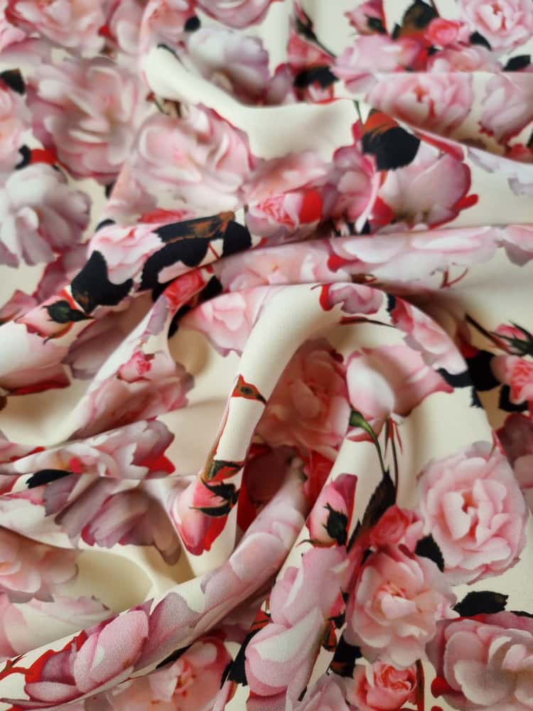Tesatura dublu crepe din matase naturala – model floral, Roz / Ivoire