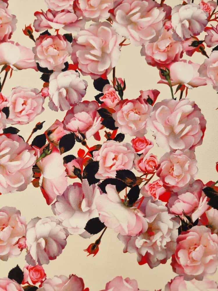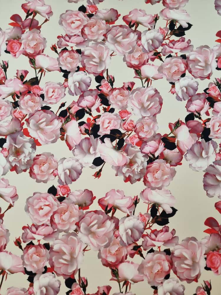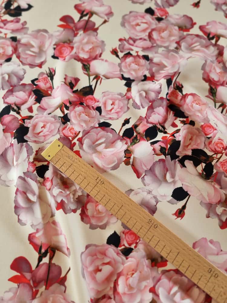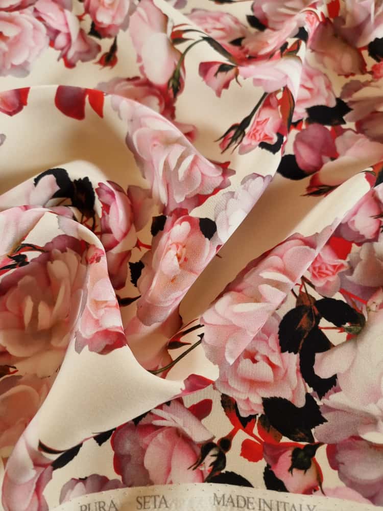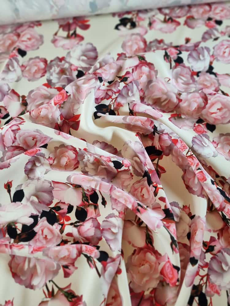Tesatura dublu crepe din matase naturala – model floral, Roz / Ivoire