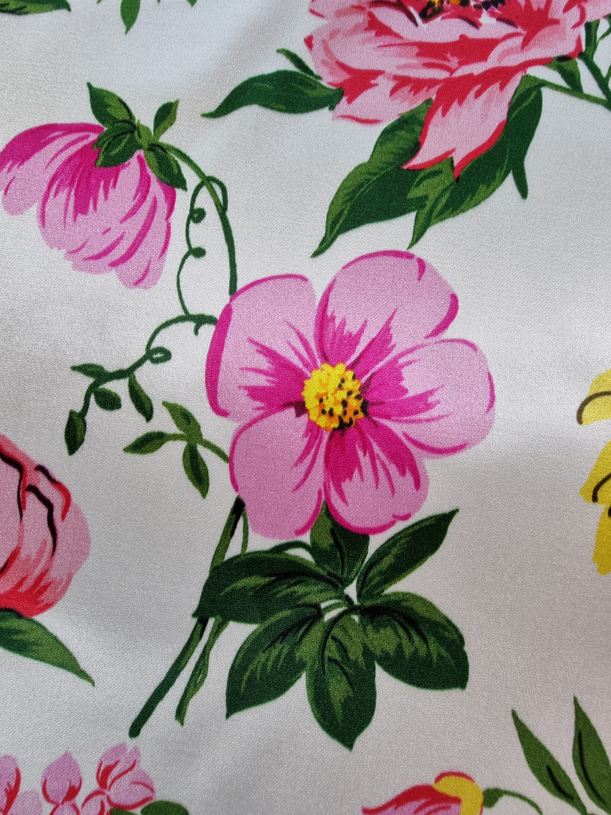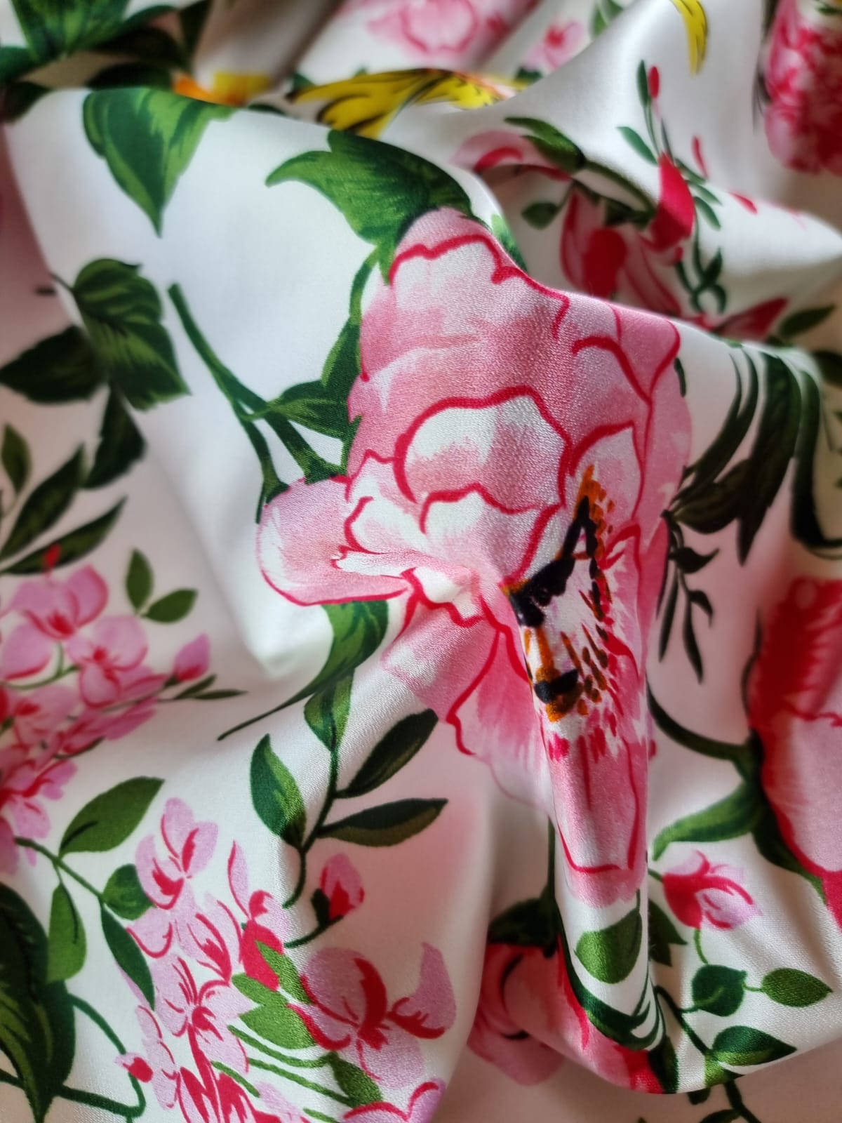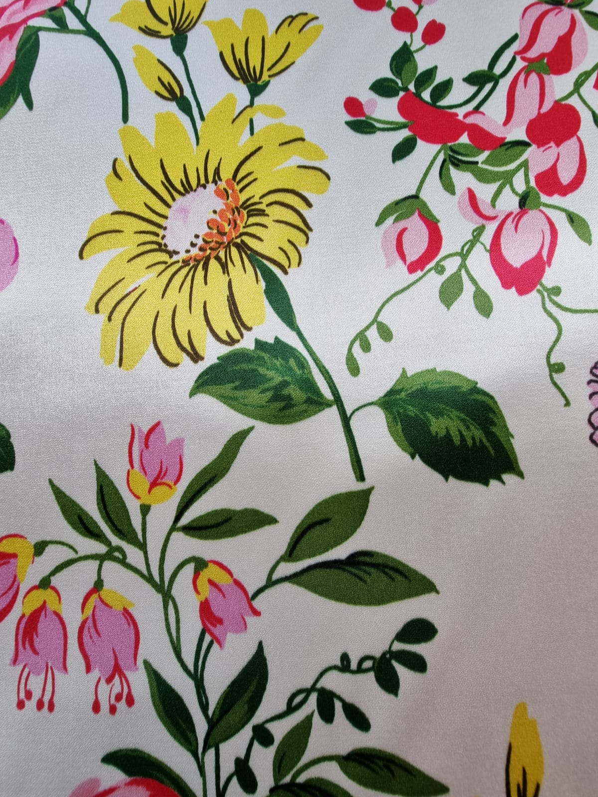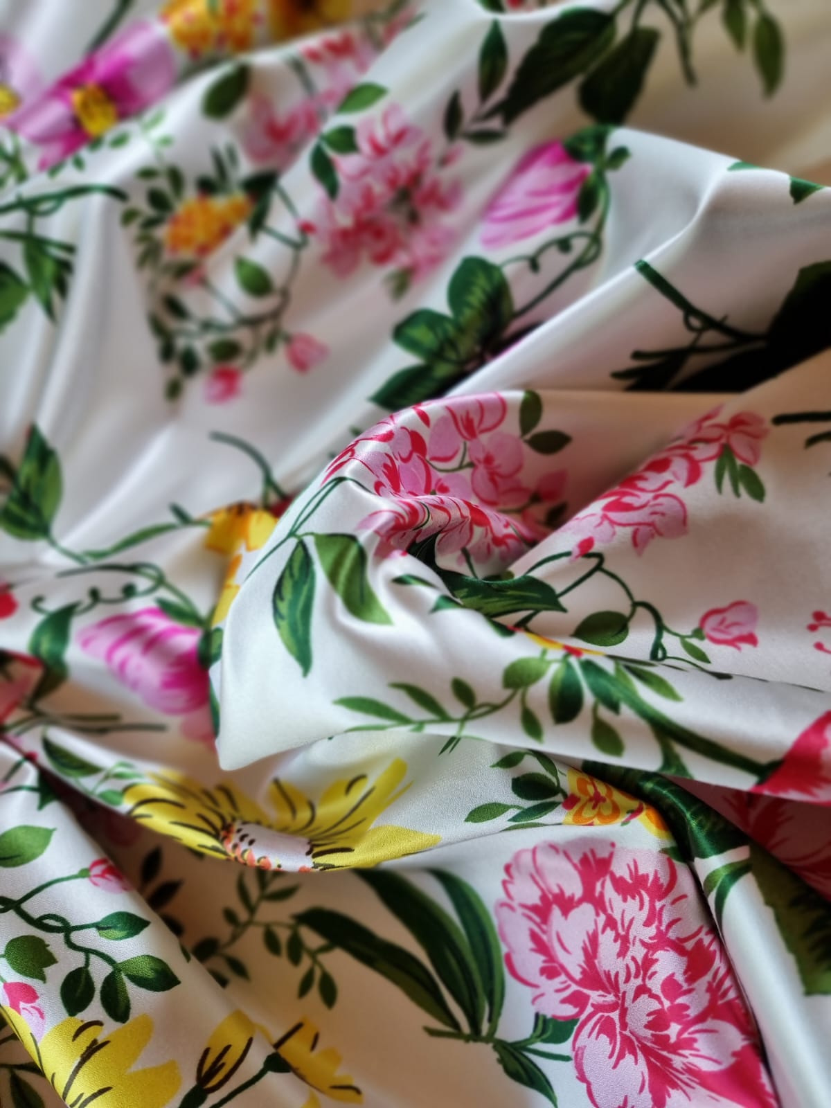 Tesatura duchesse din fibre naturale – imprimeu floral, Roz / Galben / Ivoire