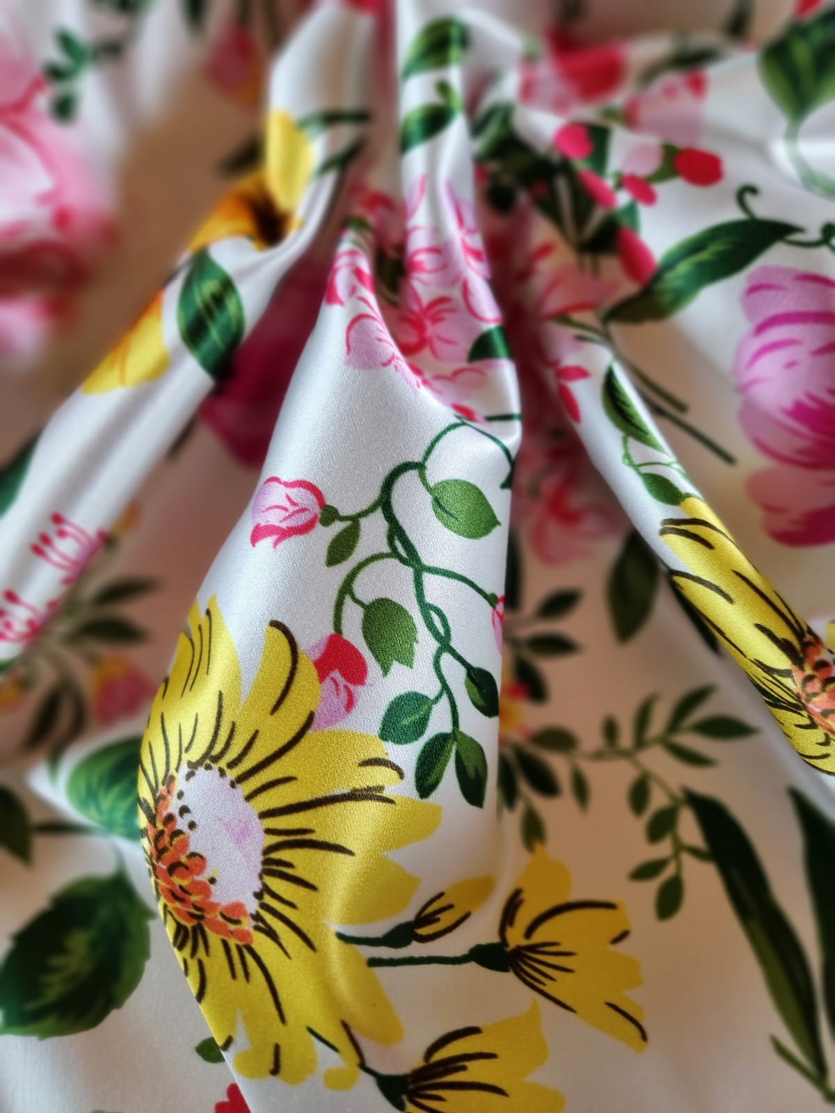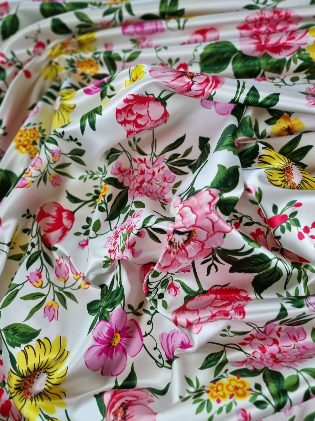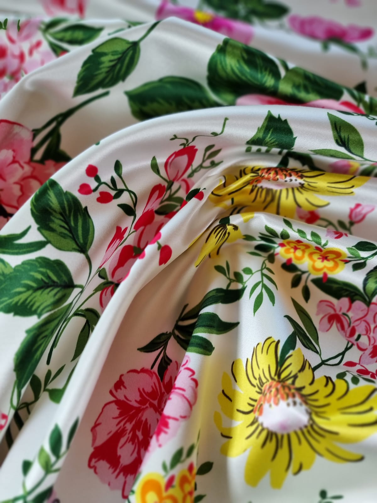 Tesatura duchesse din fibre naturale – imprimeu floral, Roz / Galben / Ivoire