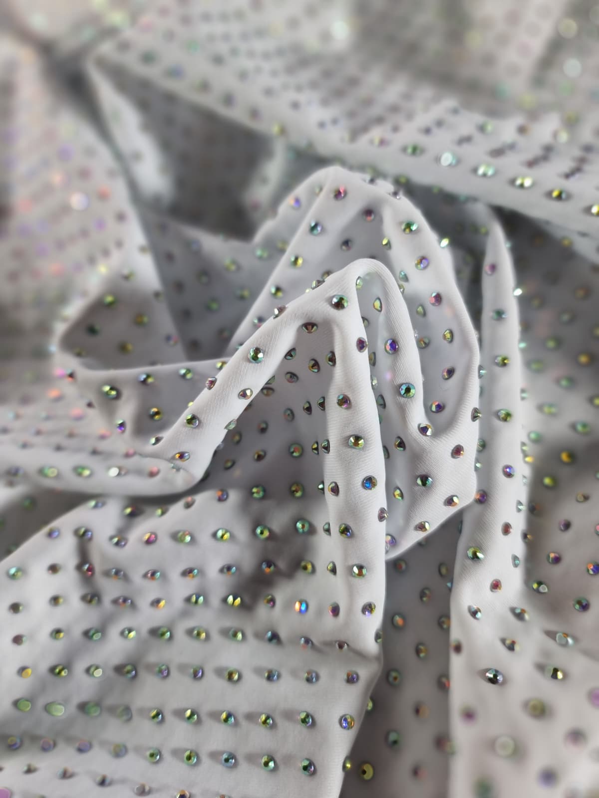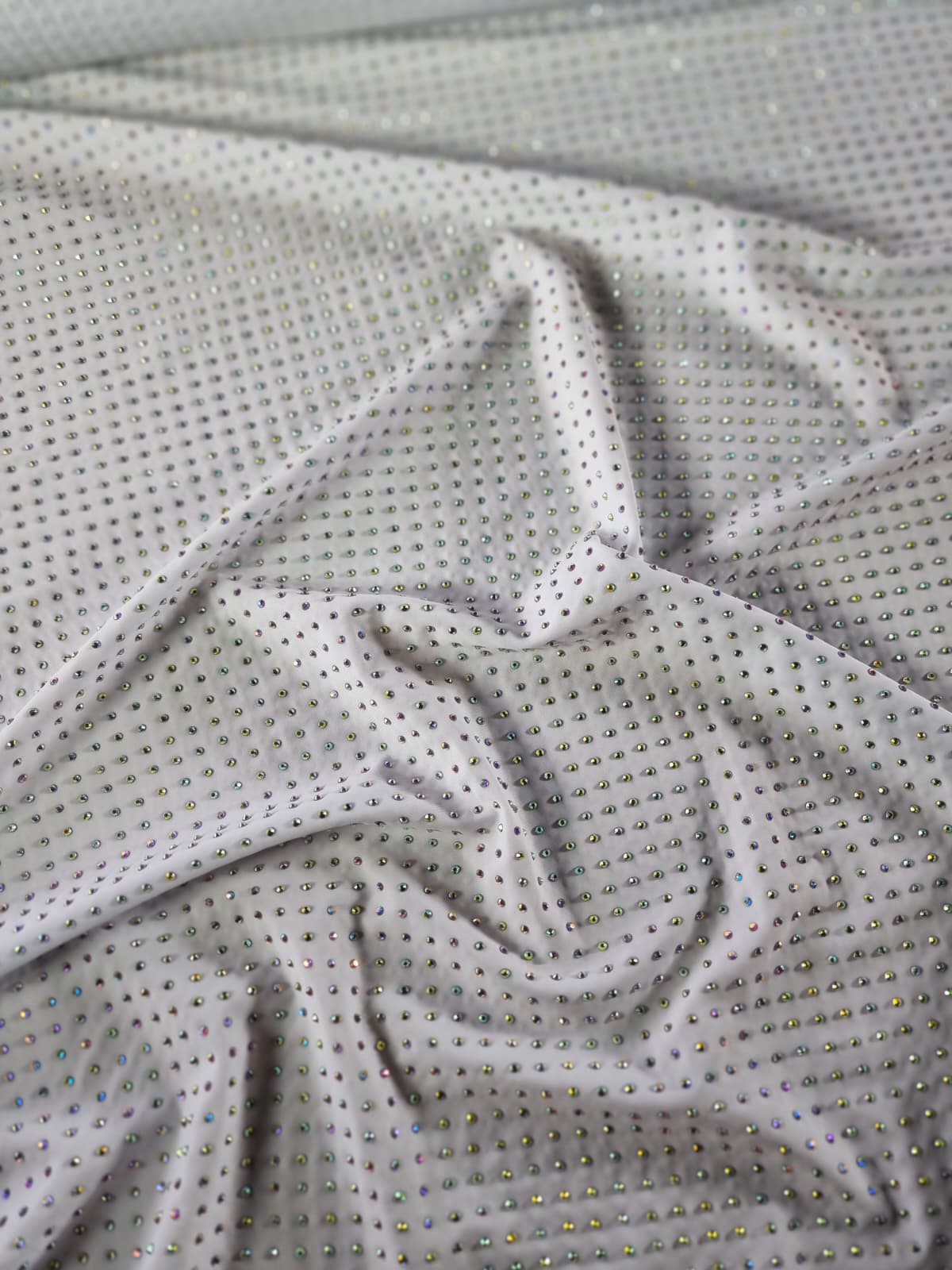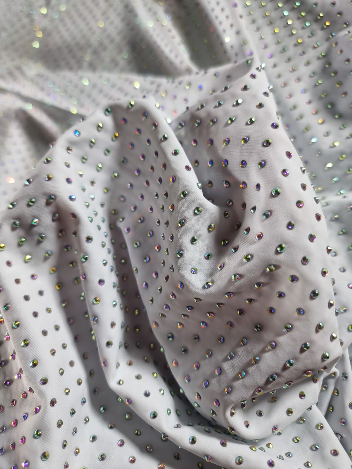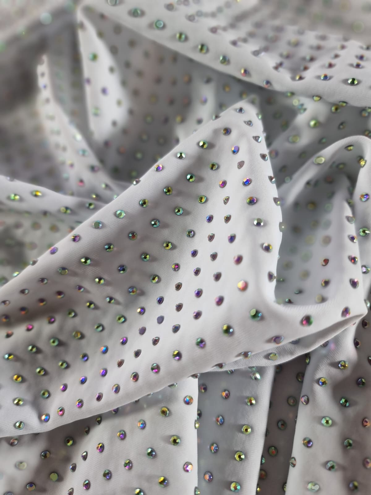 Tesatura elastica tip jerse cu aplicatii de strasuri multicolore pe fond Alb