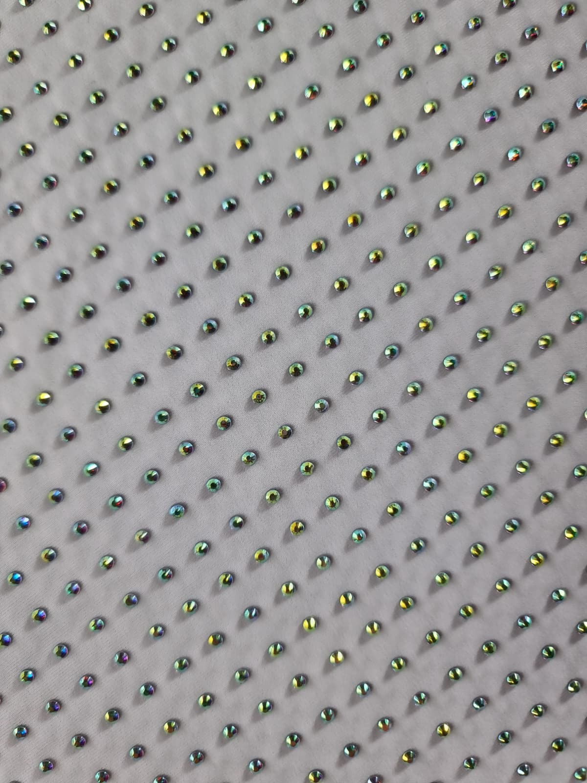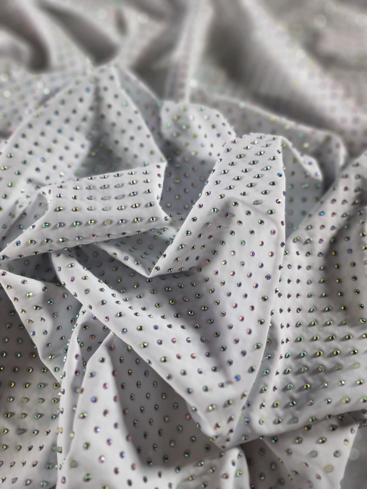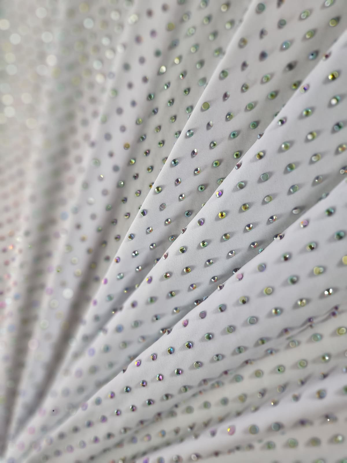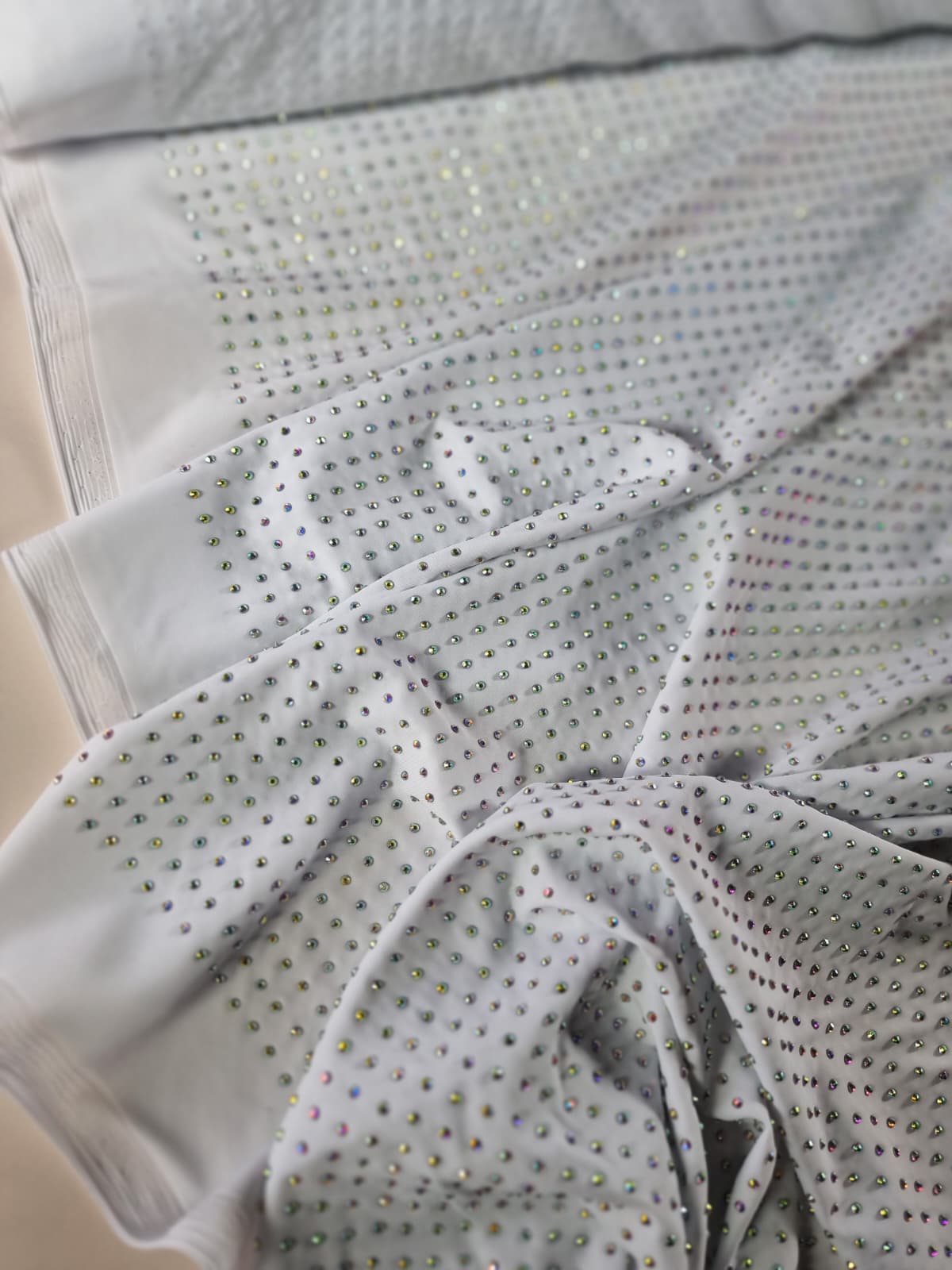 Tesatura elastica tip jerse cu aplicatii de strasuri multicolore pe fond Alb
