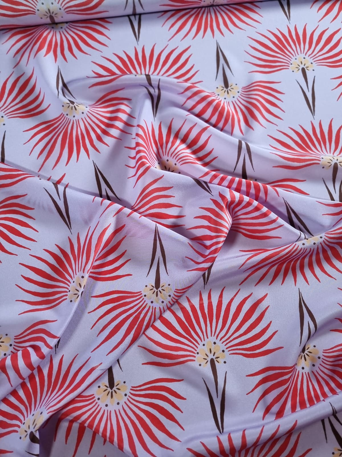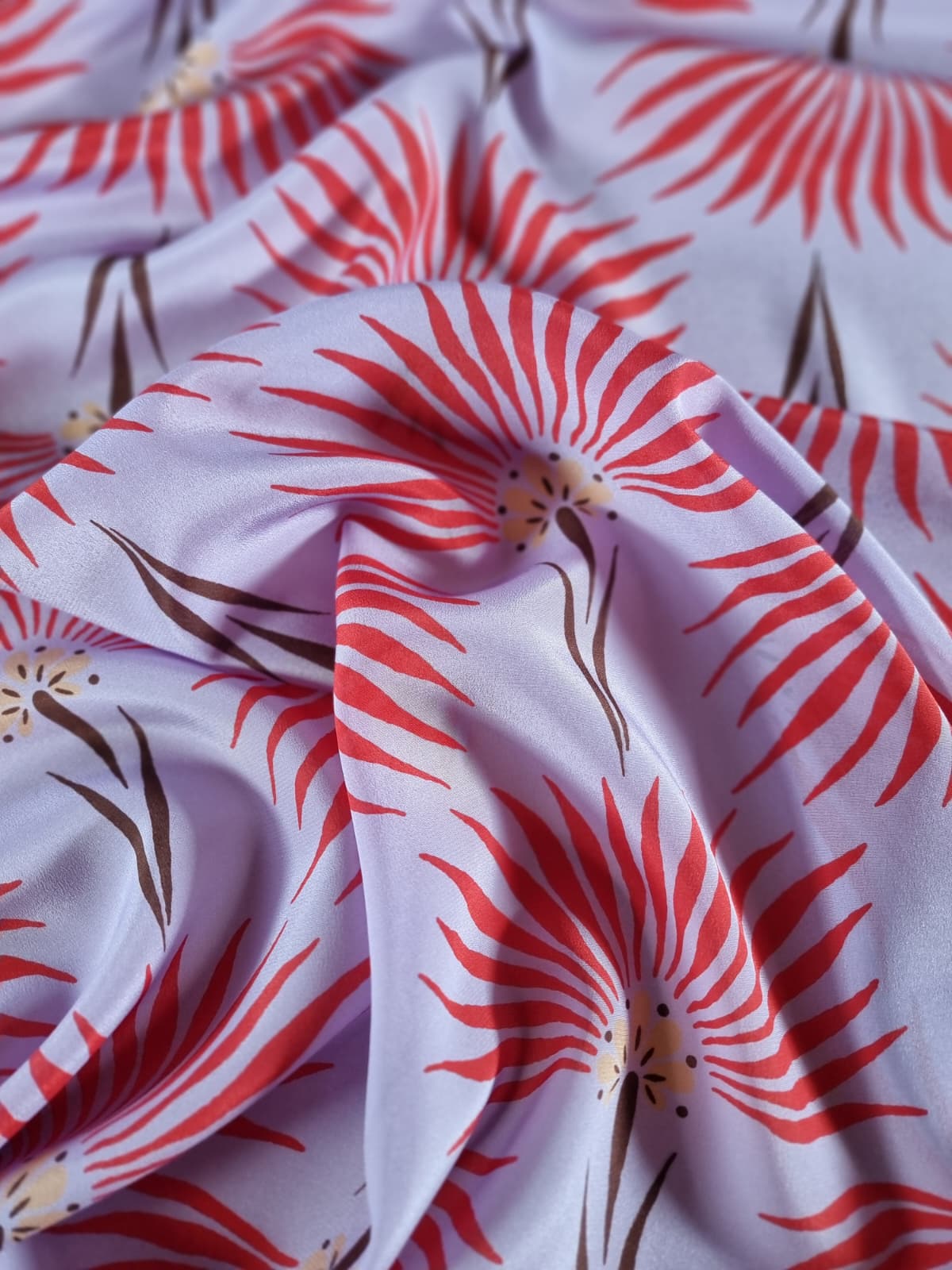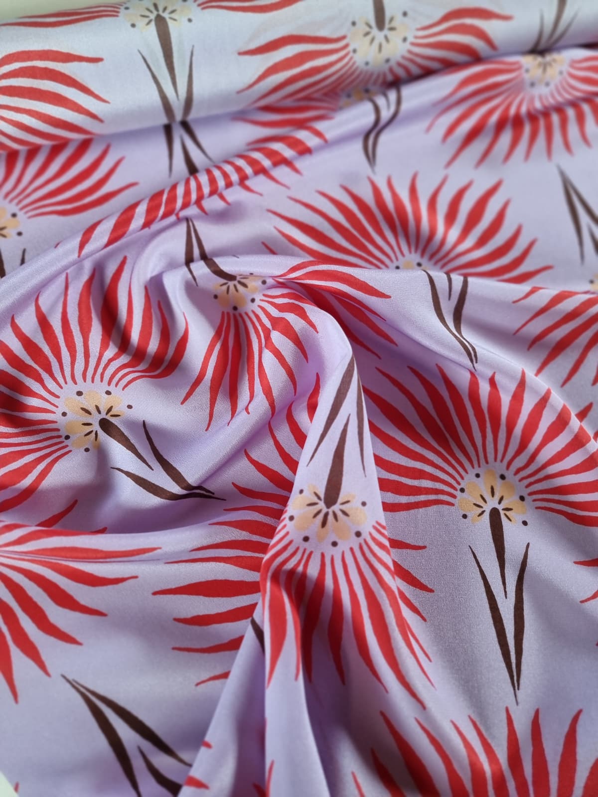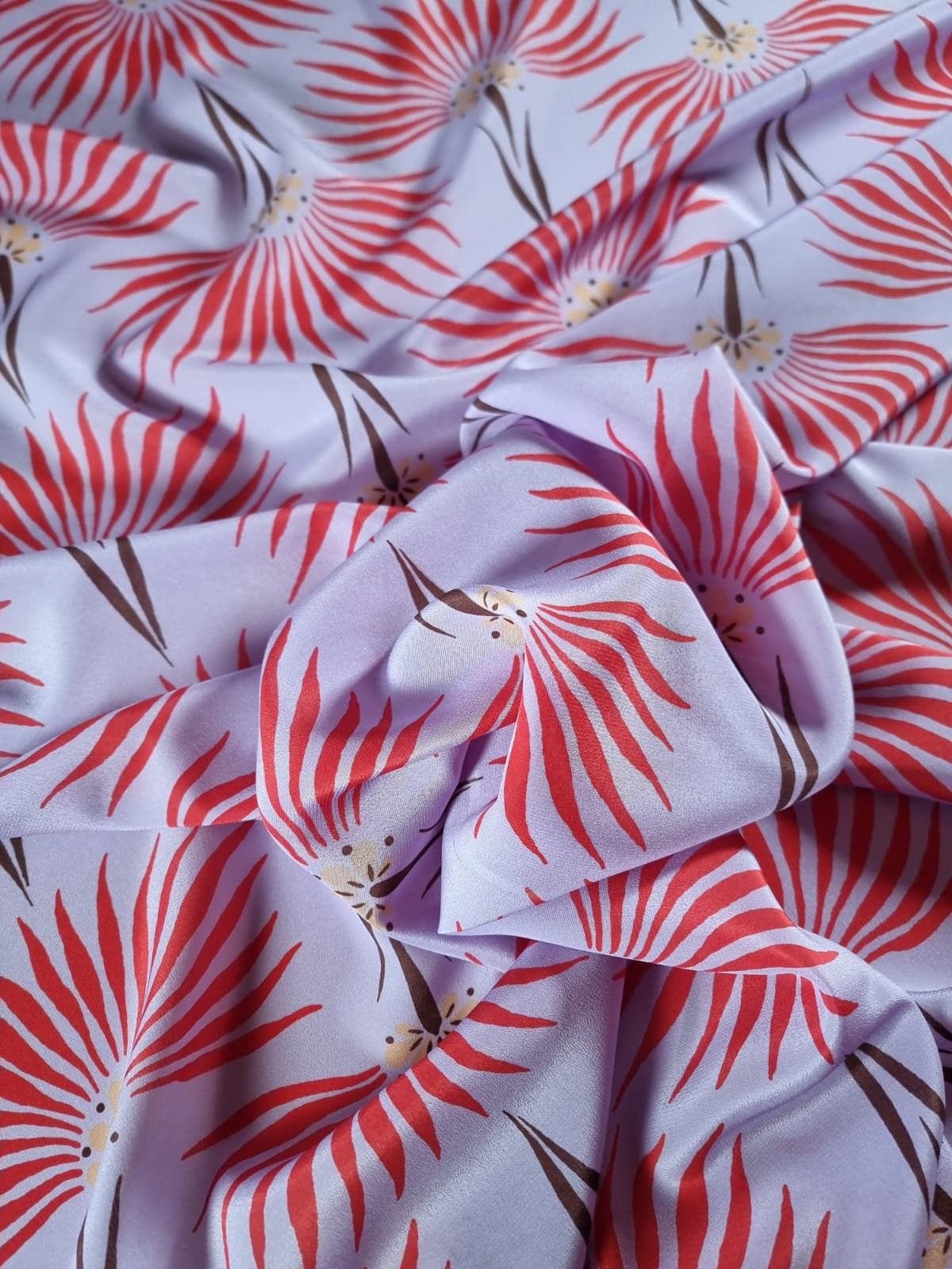Tesatura fina din matase naturala – crepe de chine subțire cu flori stilizate roșii pe fond mov – lila